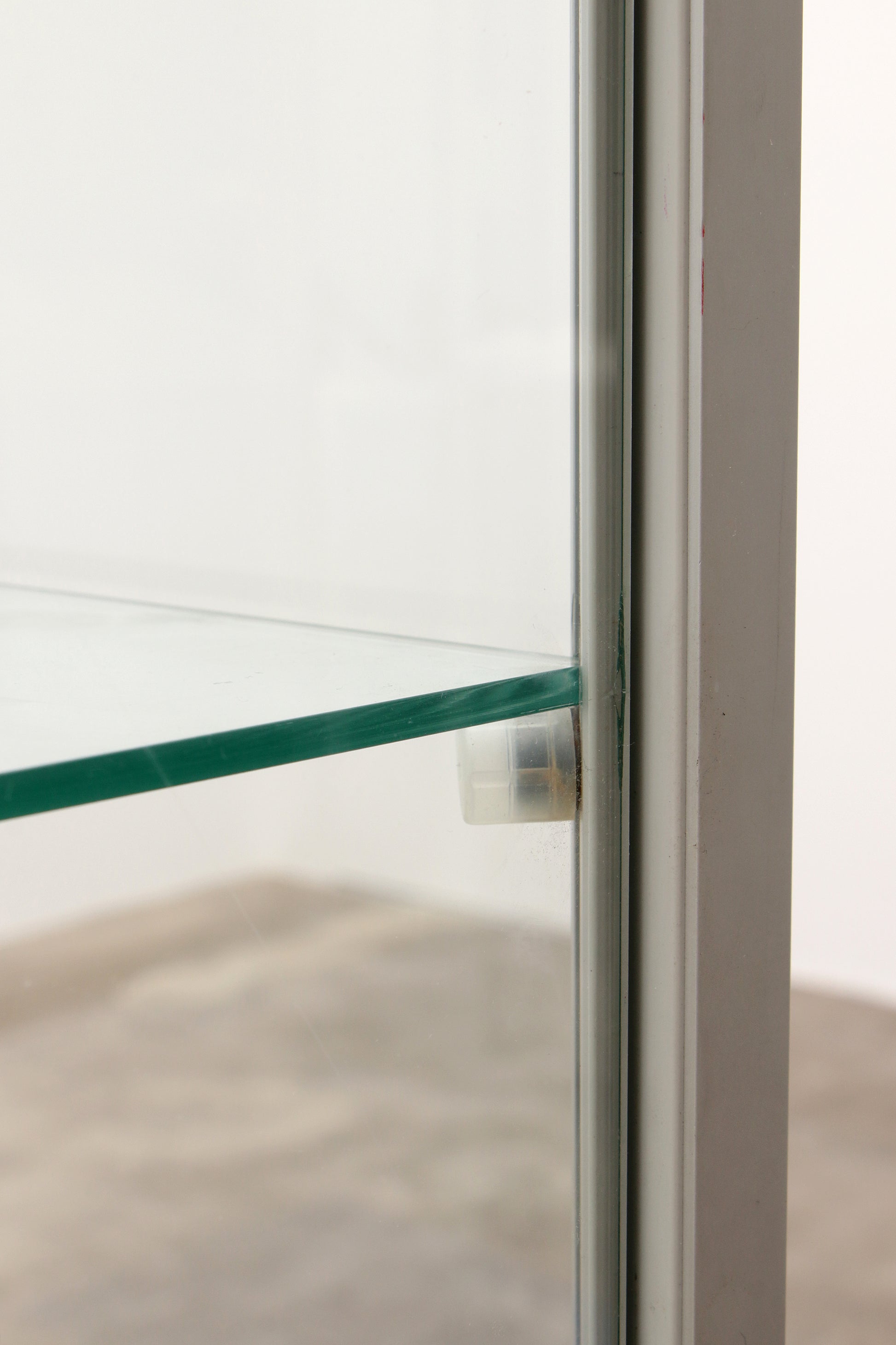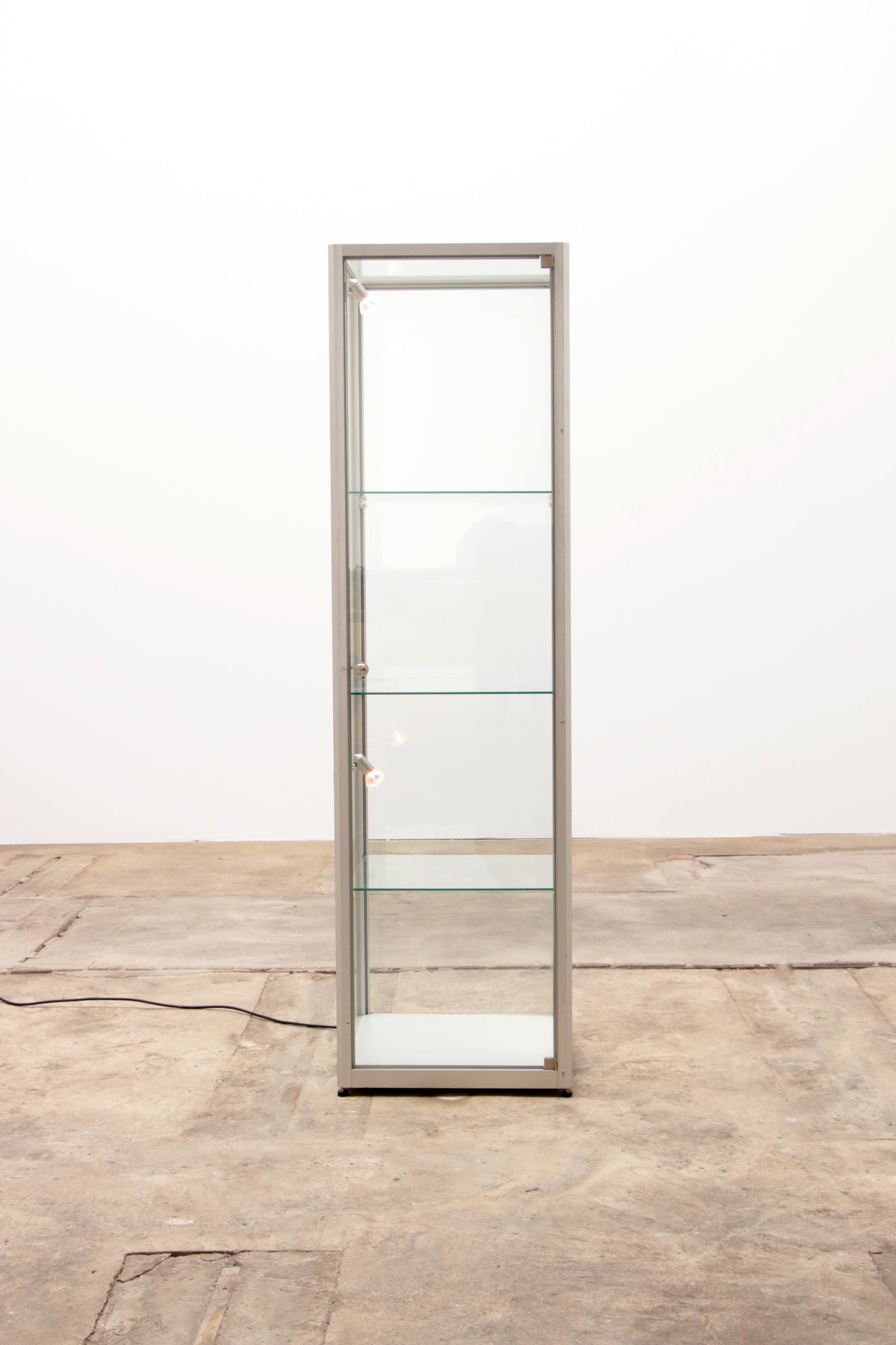This large, square display cabinet from the 1980s features a door and three glass shelves. It includes built-in lighting, and everything functions perfectly. If you're looking for a display cabinet for your shop, this could be just what you need.