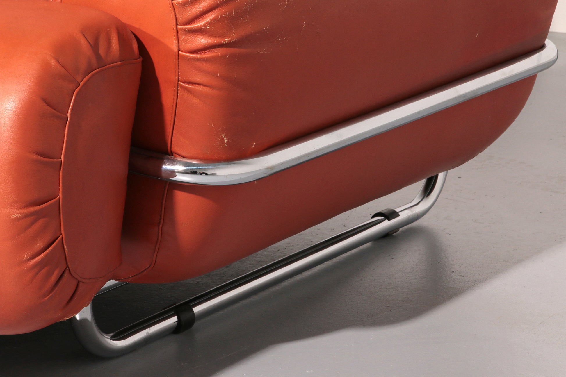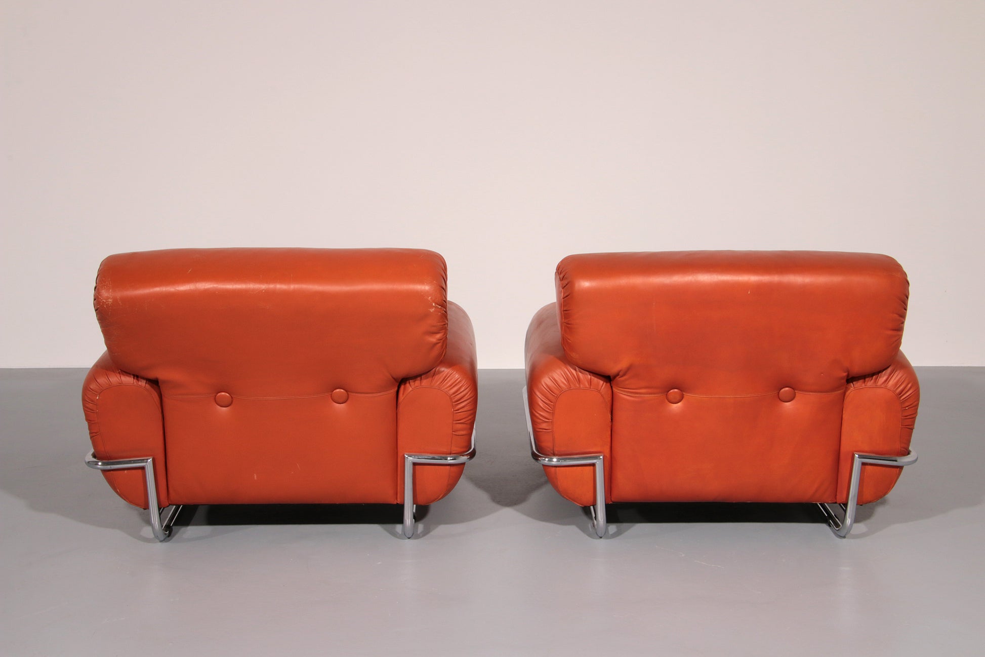 Experience the elegance and craftsmanship of the 1970s with our set of two rare vintage leather armchairs, inspired by the renowned Italian designer Guido Faleschini. These iconic pieces are a testament to Italian design, celebrated for their timeless blend of chrome and leather. Each chair has been meticulously restored, featuring refreshed original leather and new foam for optimal seating comfort. Not only are they a visual delight, but they also provide an unparalleled seating experience, making them a perfect addition to any interior setting.