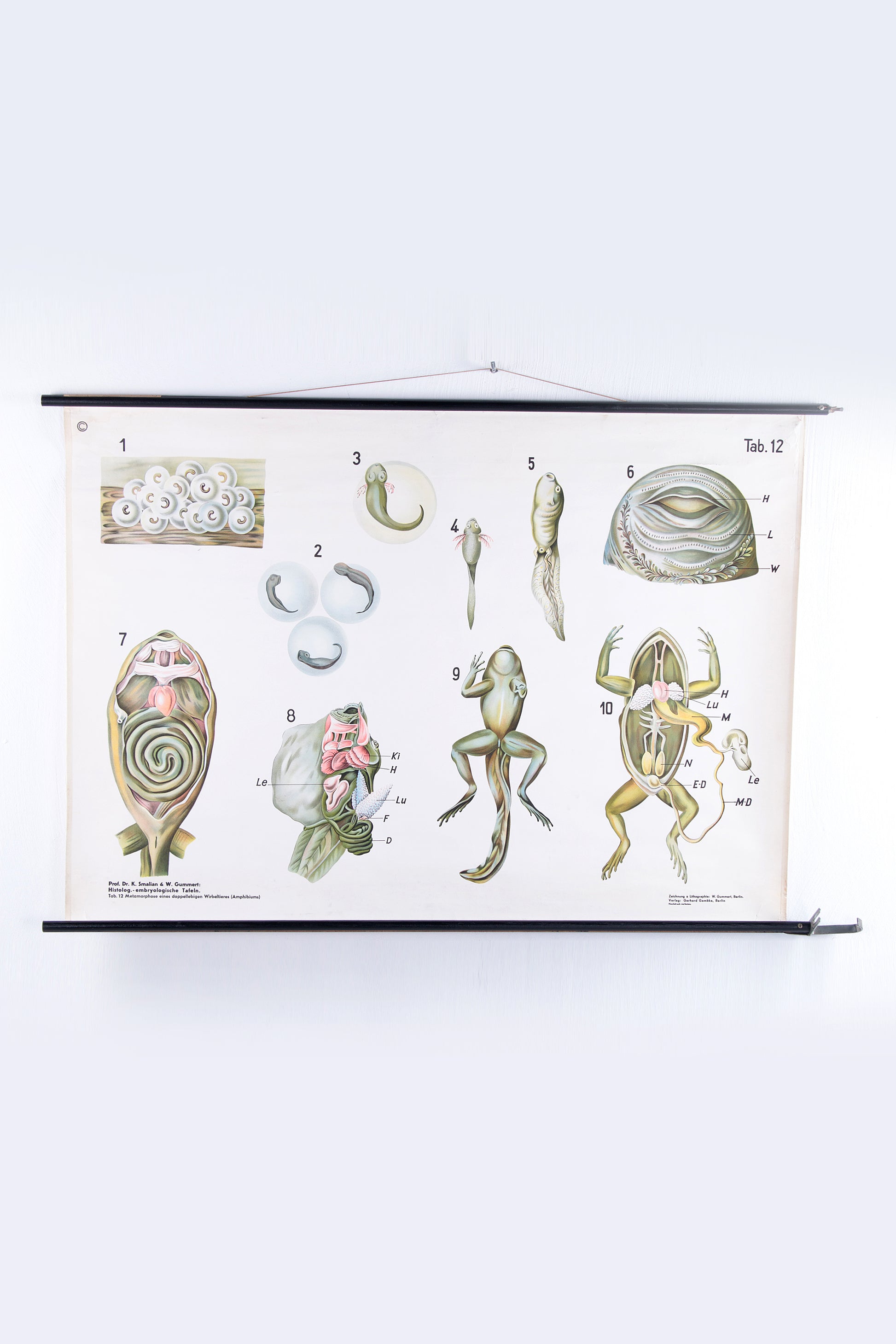 A vintage school poster depicting the metamorphosis of a frog, originally produced in Germany by Lith & Verlag Gummert & Ruge Berlin. A perfect retro addition to any room.