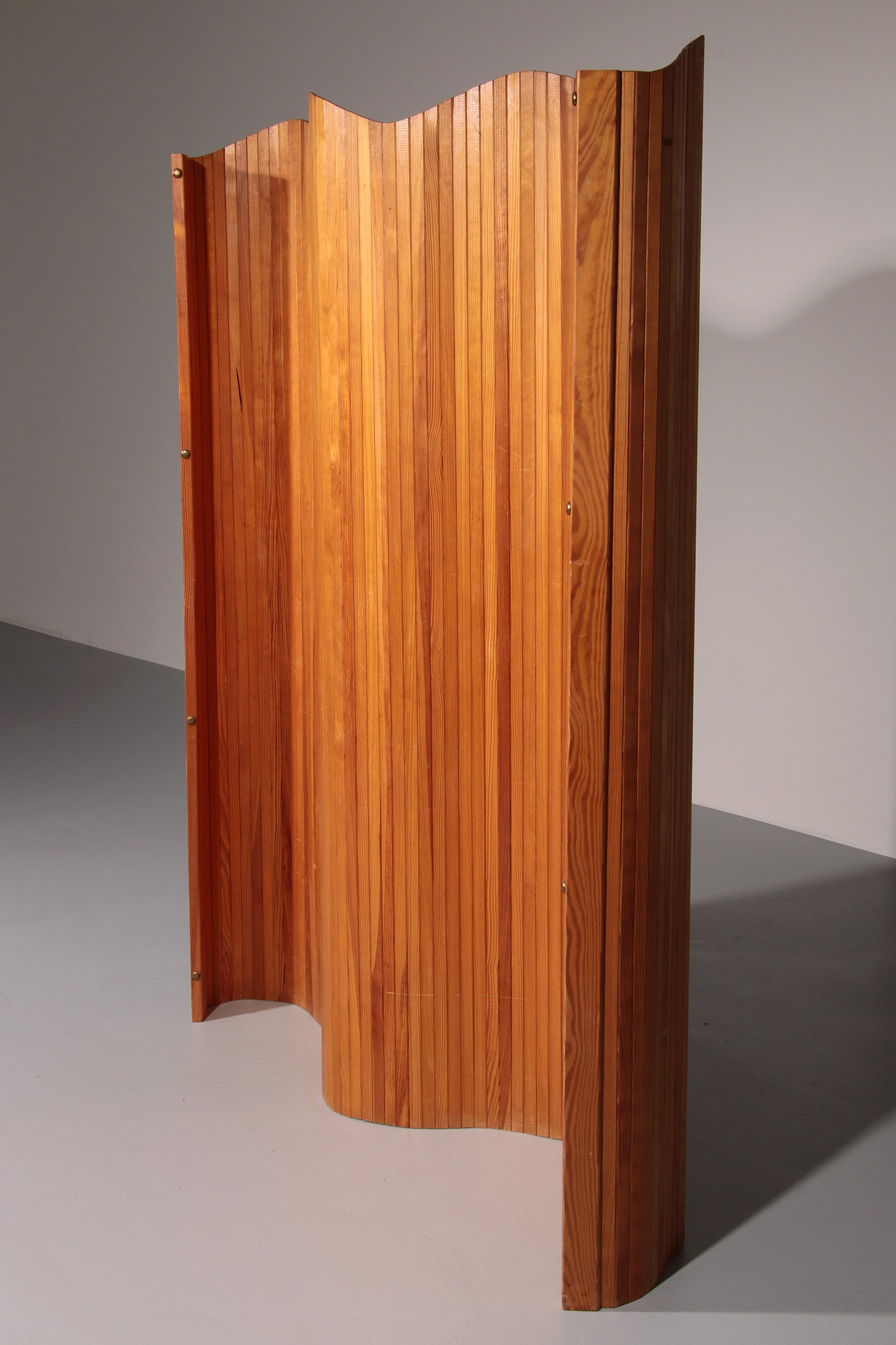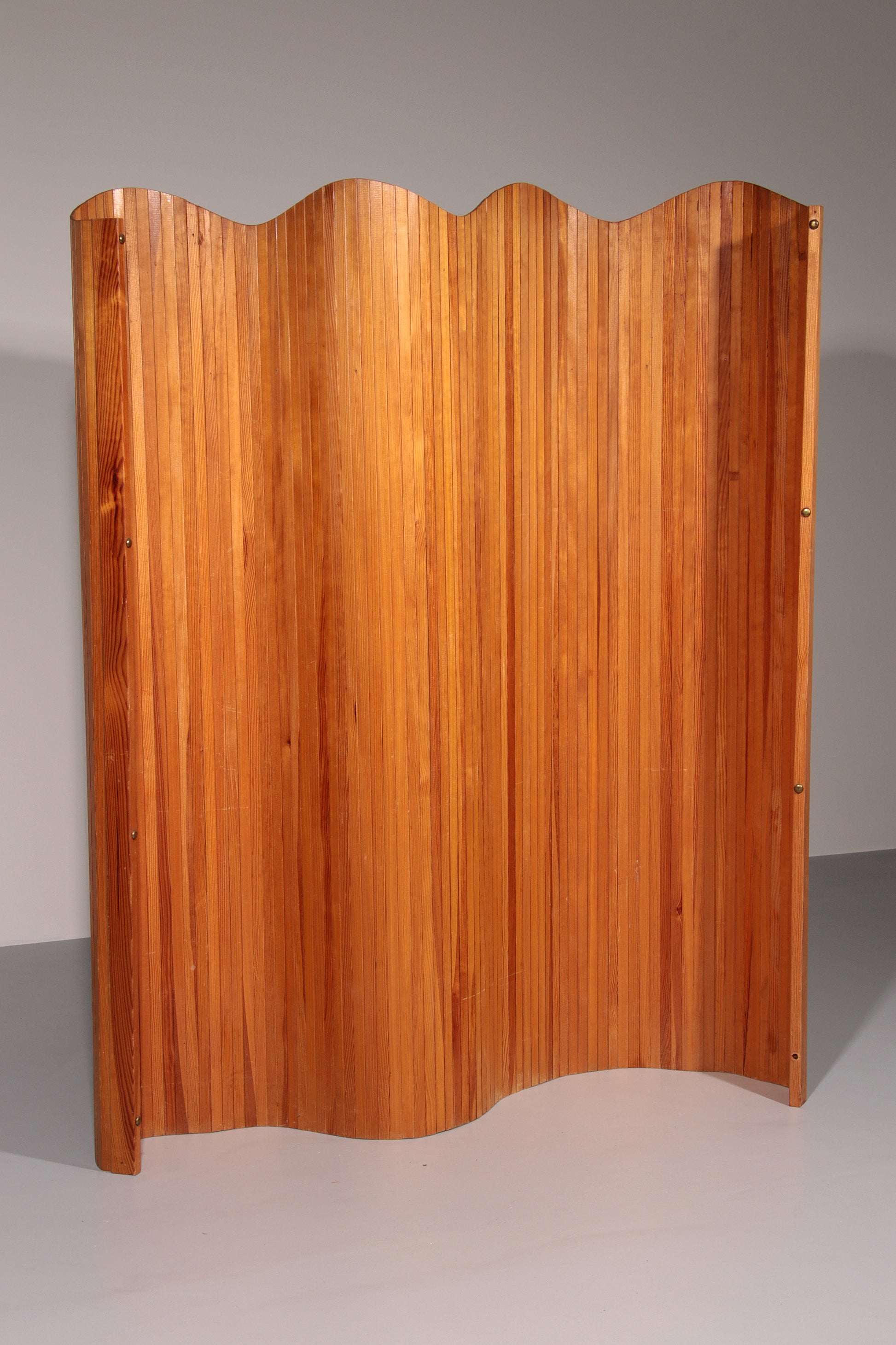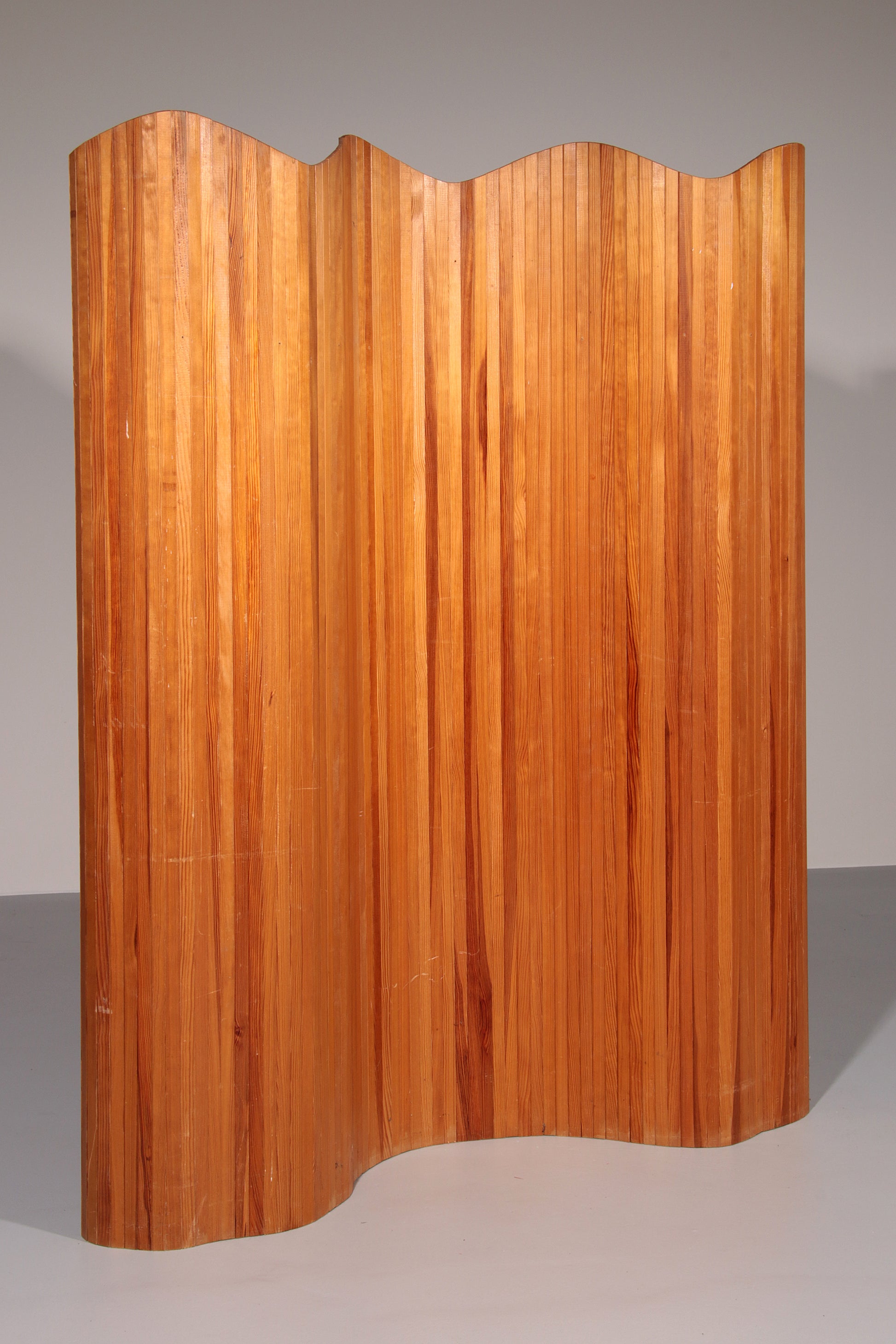 This exquisite French room divider, designed by Jomain Baumann in Paris and produced in Melun, is a true statement piece. Originally designed in 1903, this particular model dates back to the 1930s. The screen is self-supporting when arranged in a wave-like shape, providing both stability and aesthetic appeal. Crafted from pinewood slats connected with invisible metal wires, it offers a durable and refined design, perfect for sophisticated interiors.