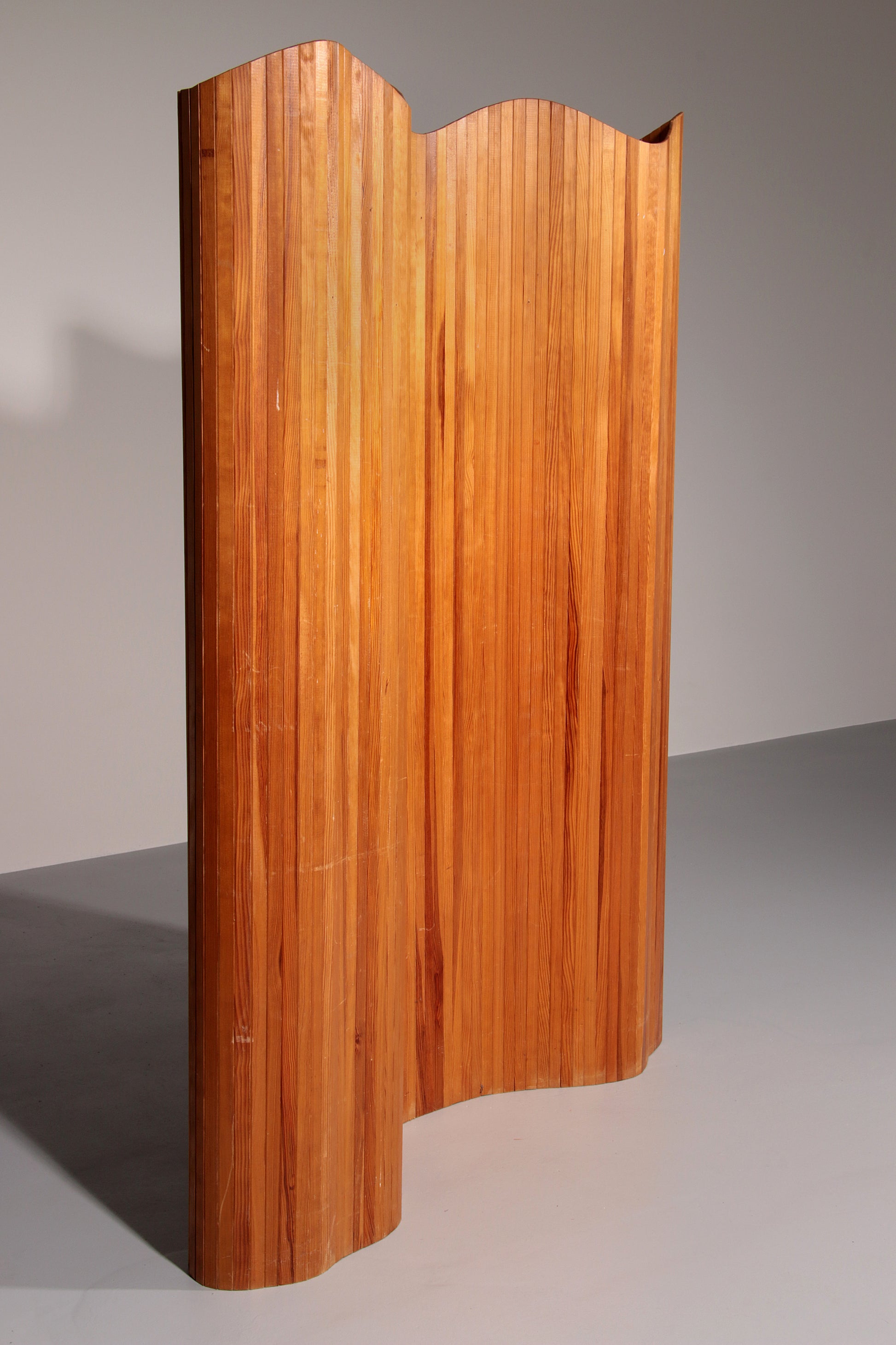 A timeless and elegant French room divider by Jomain Baumann, dating from the 1930s. Featuring pinewood slats and an invisible wire connection, this piece is both sturdy and visually striking.