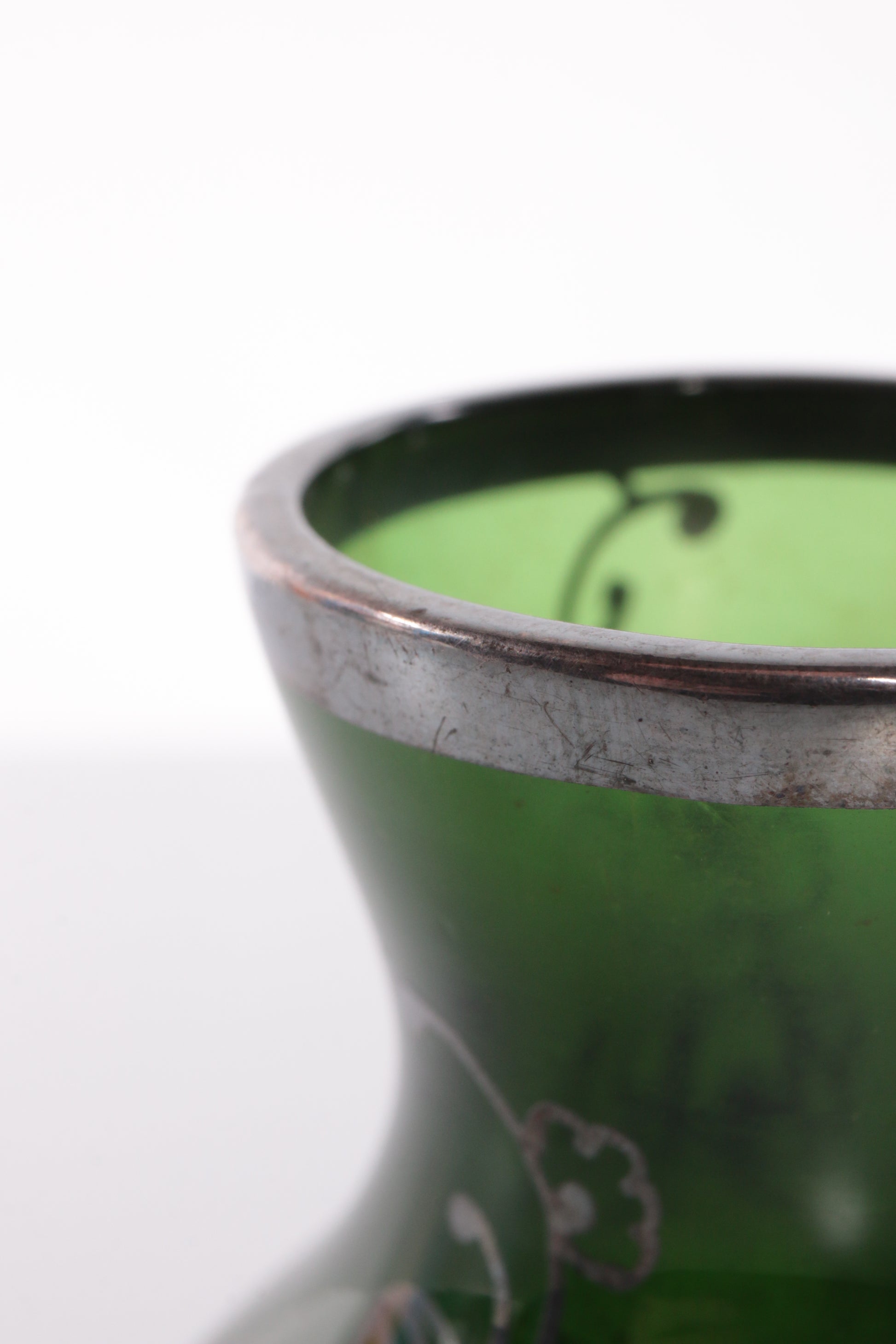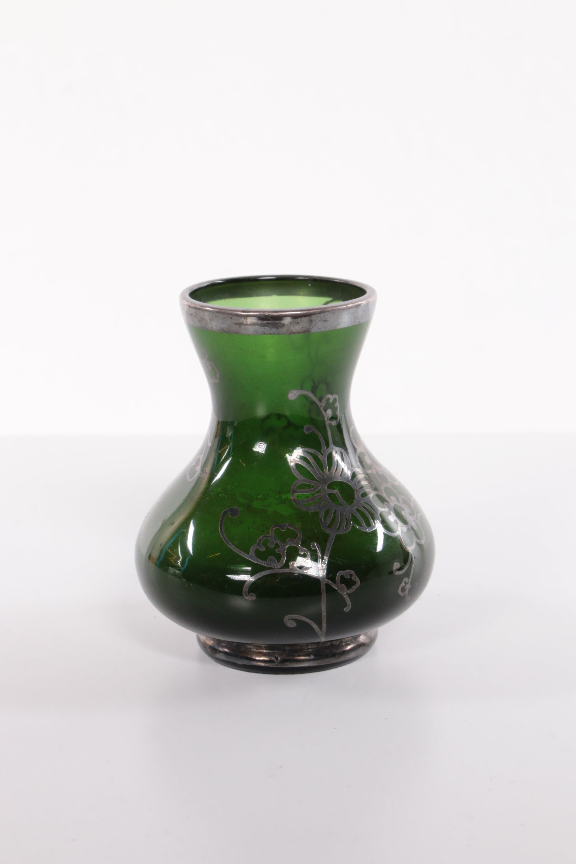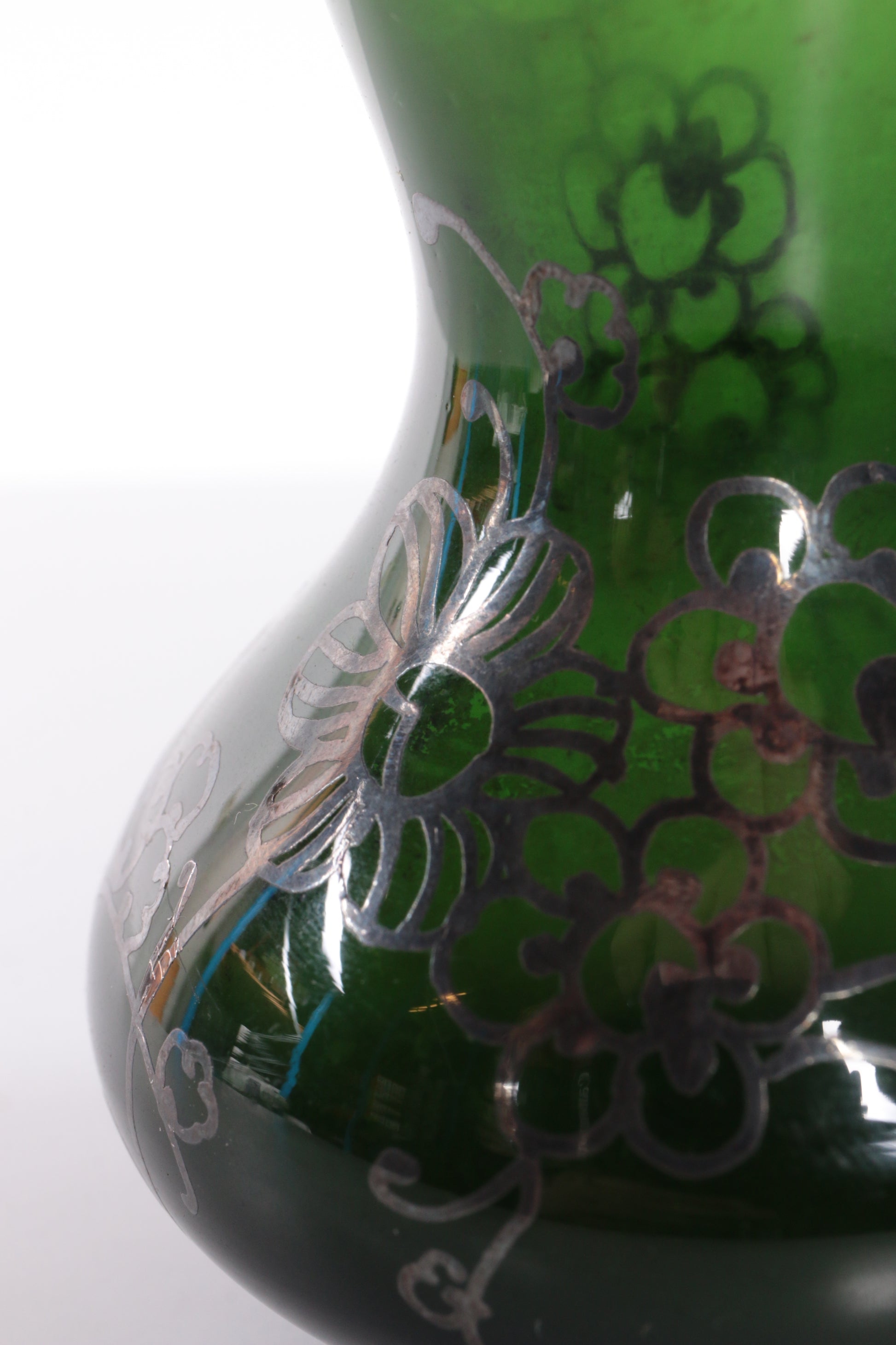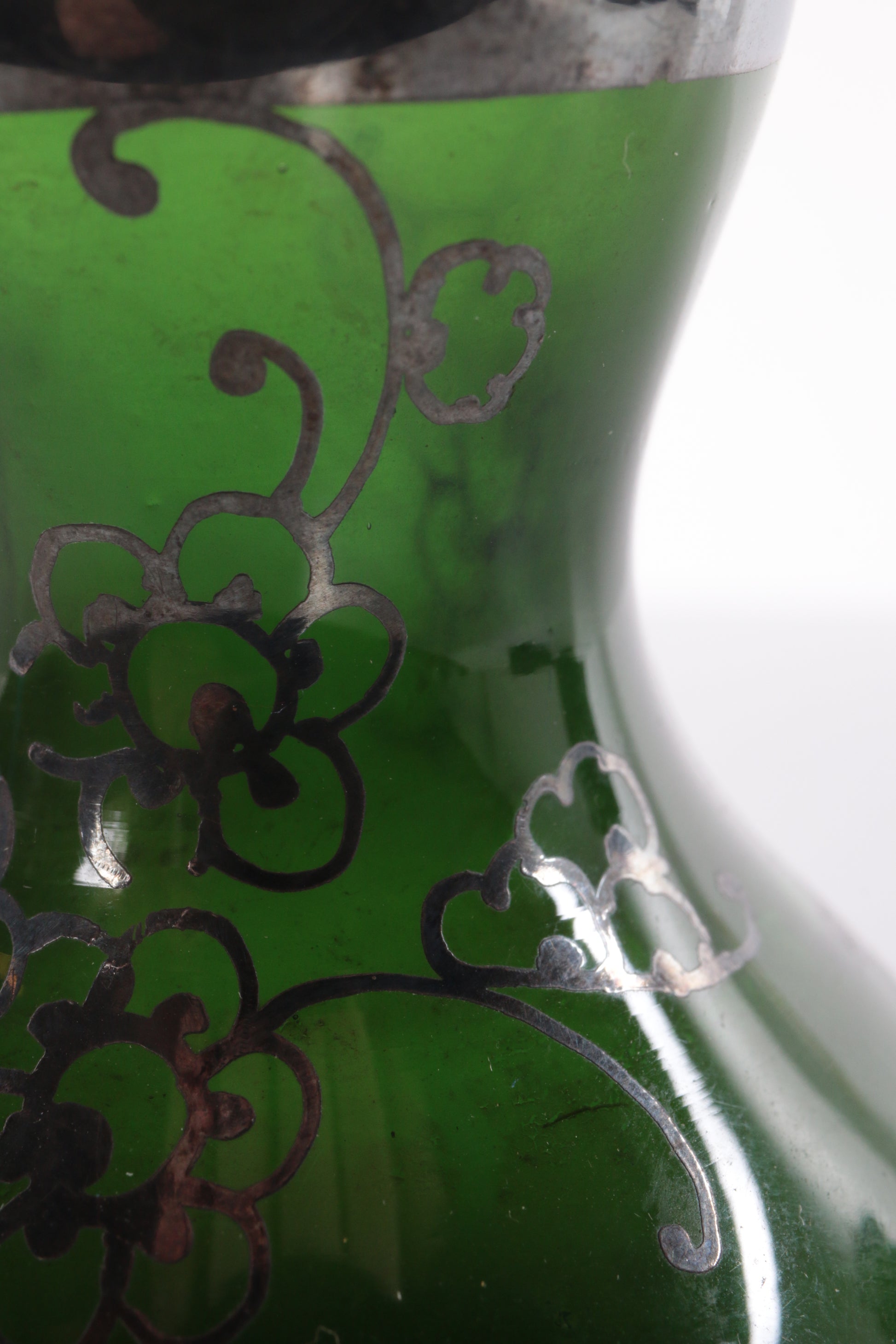 A vintage French vase from the 1940s, featuring a striking green color and intricate silver floral detailing. This lovely piece serves as both a decorative item and a functional container, perfect for adding a touch of elegance to any room.