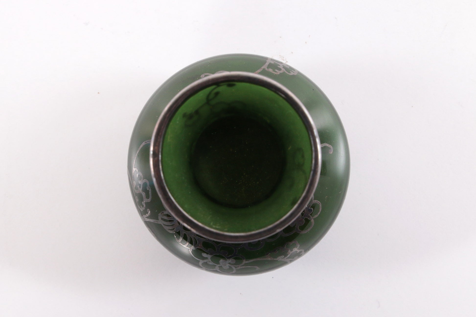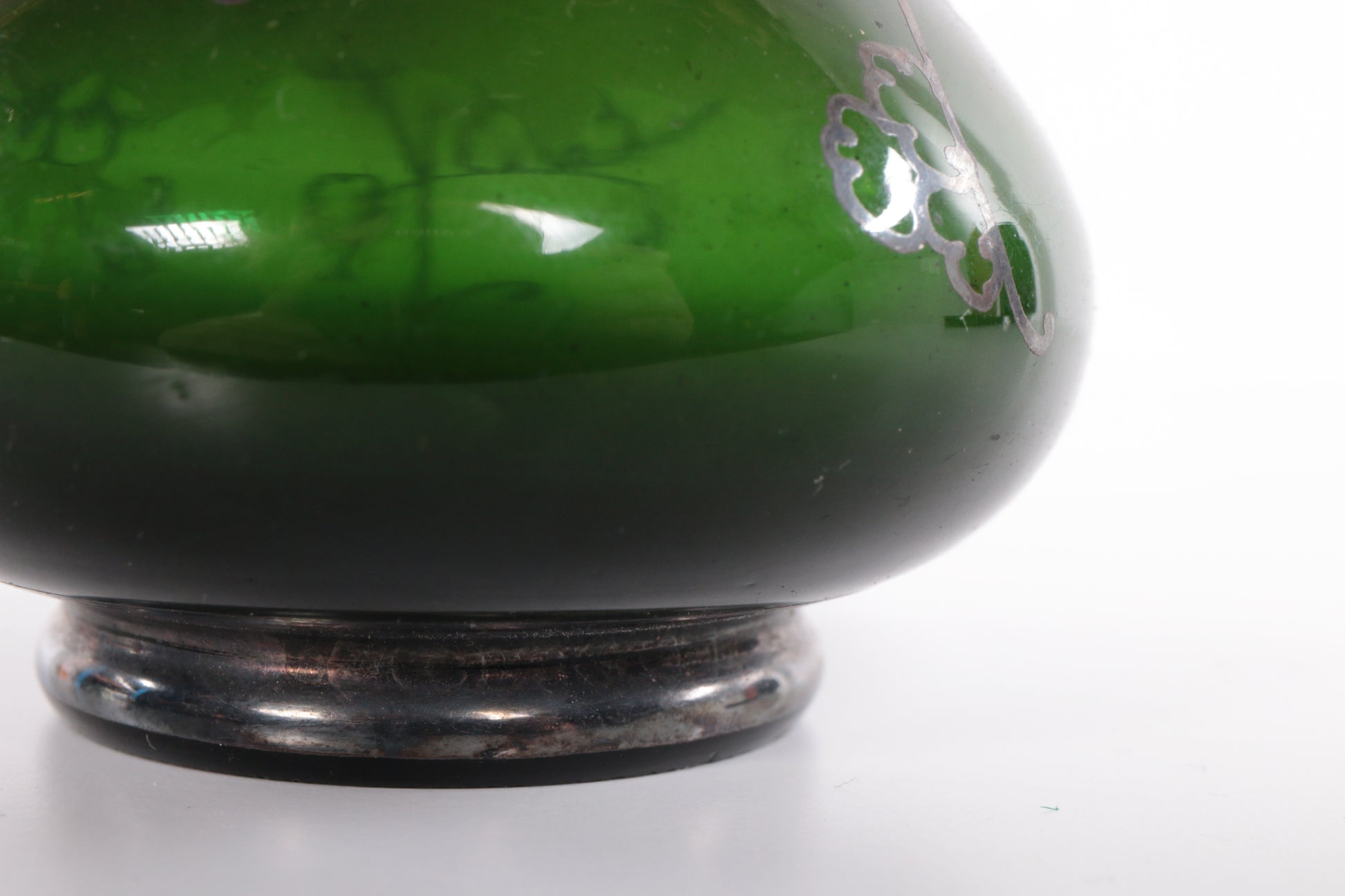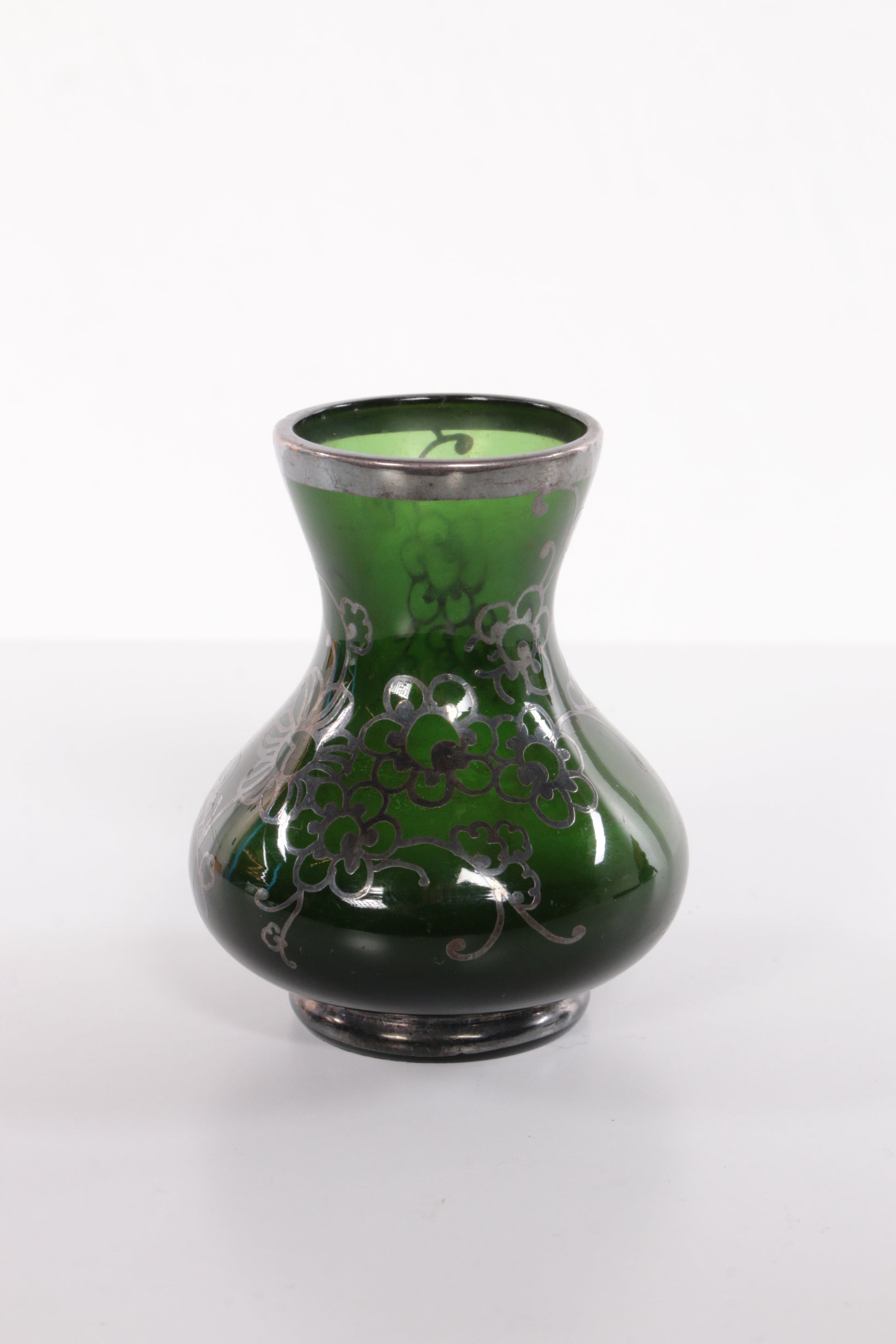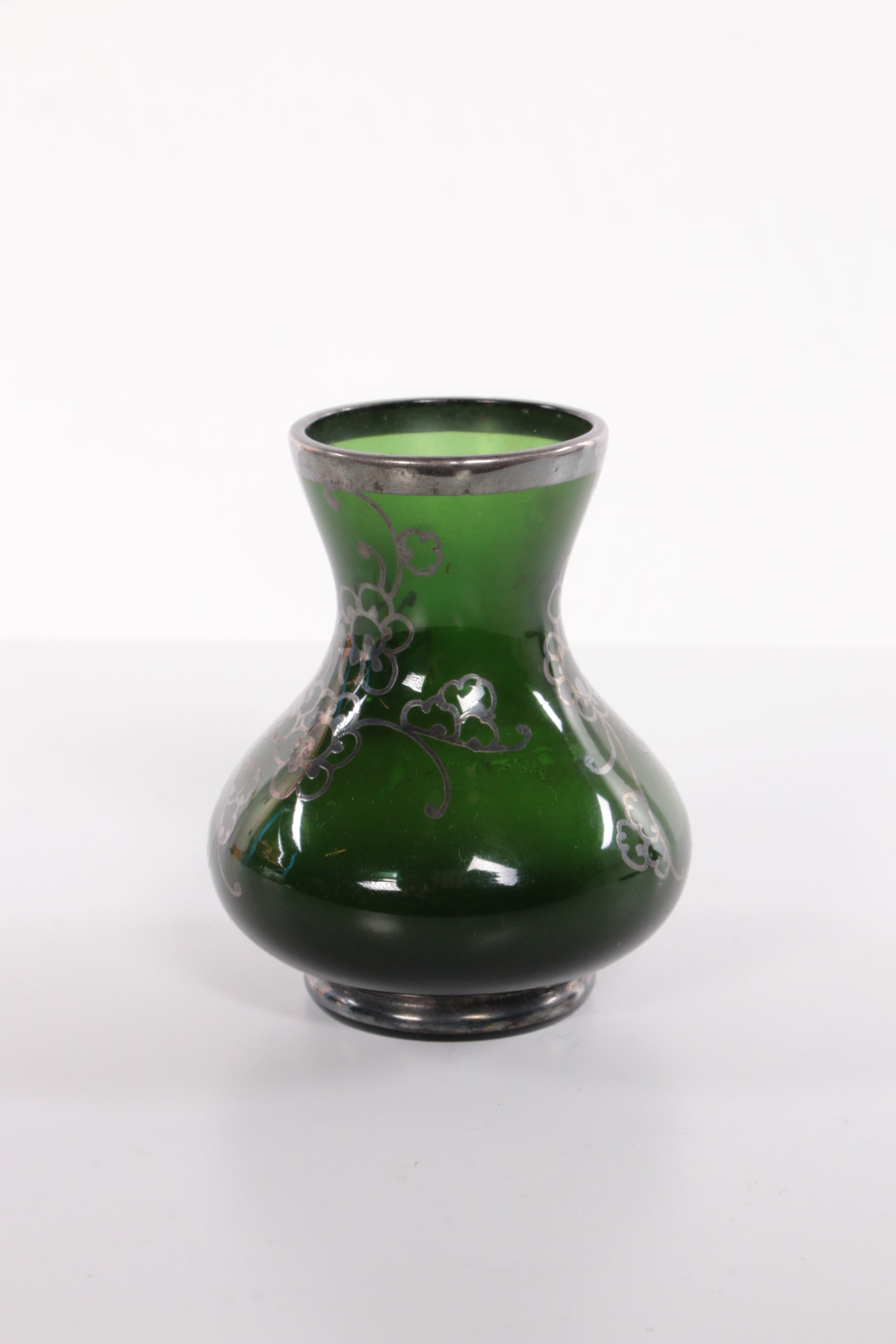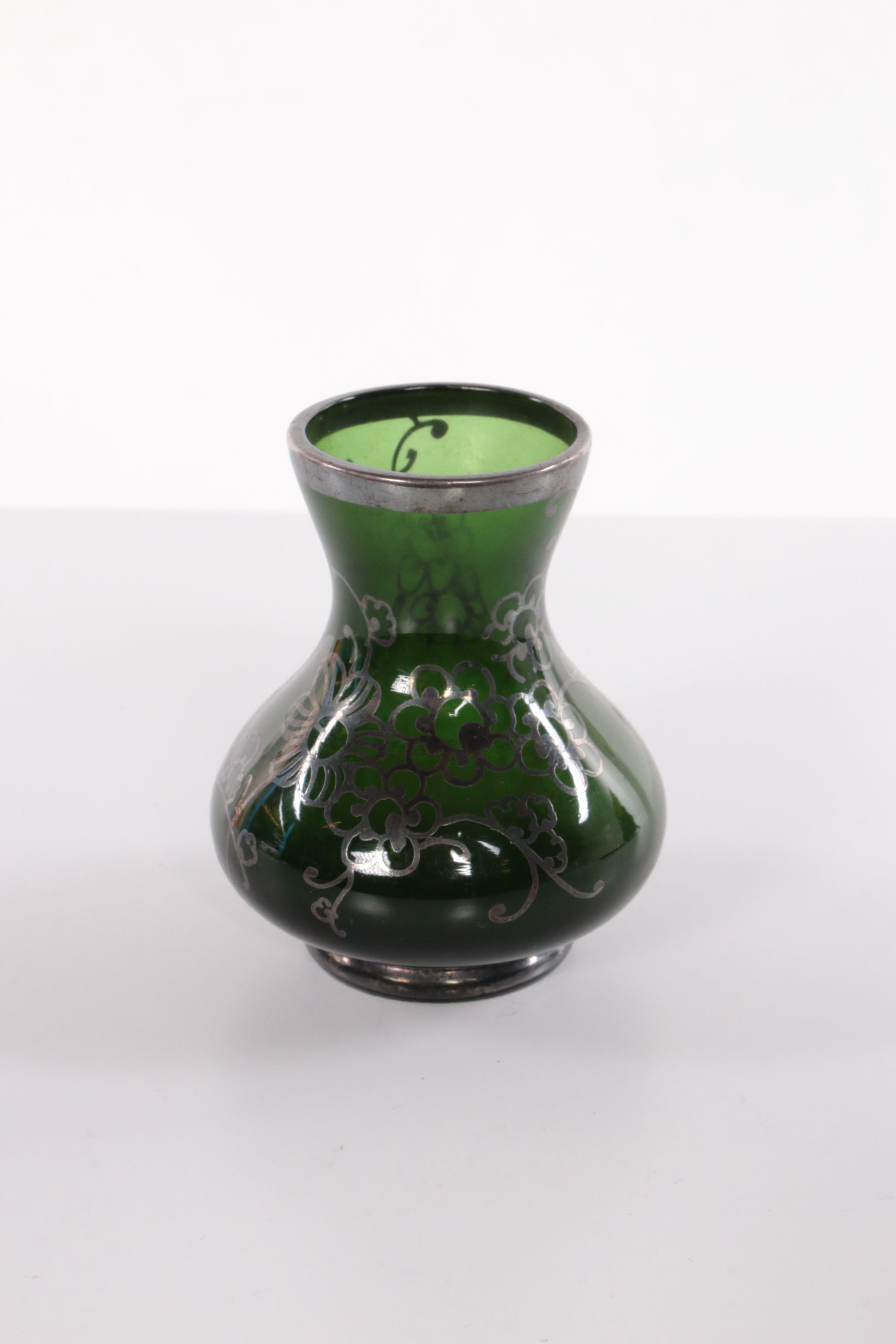 A vintage French vase from the 1940s, featuring a striking green color and intricate silver floral detailing. This lovely piece serves as both a decorative item and a functional container, perfect for adding a touch of elegance to any room.