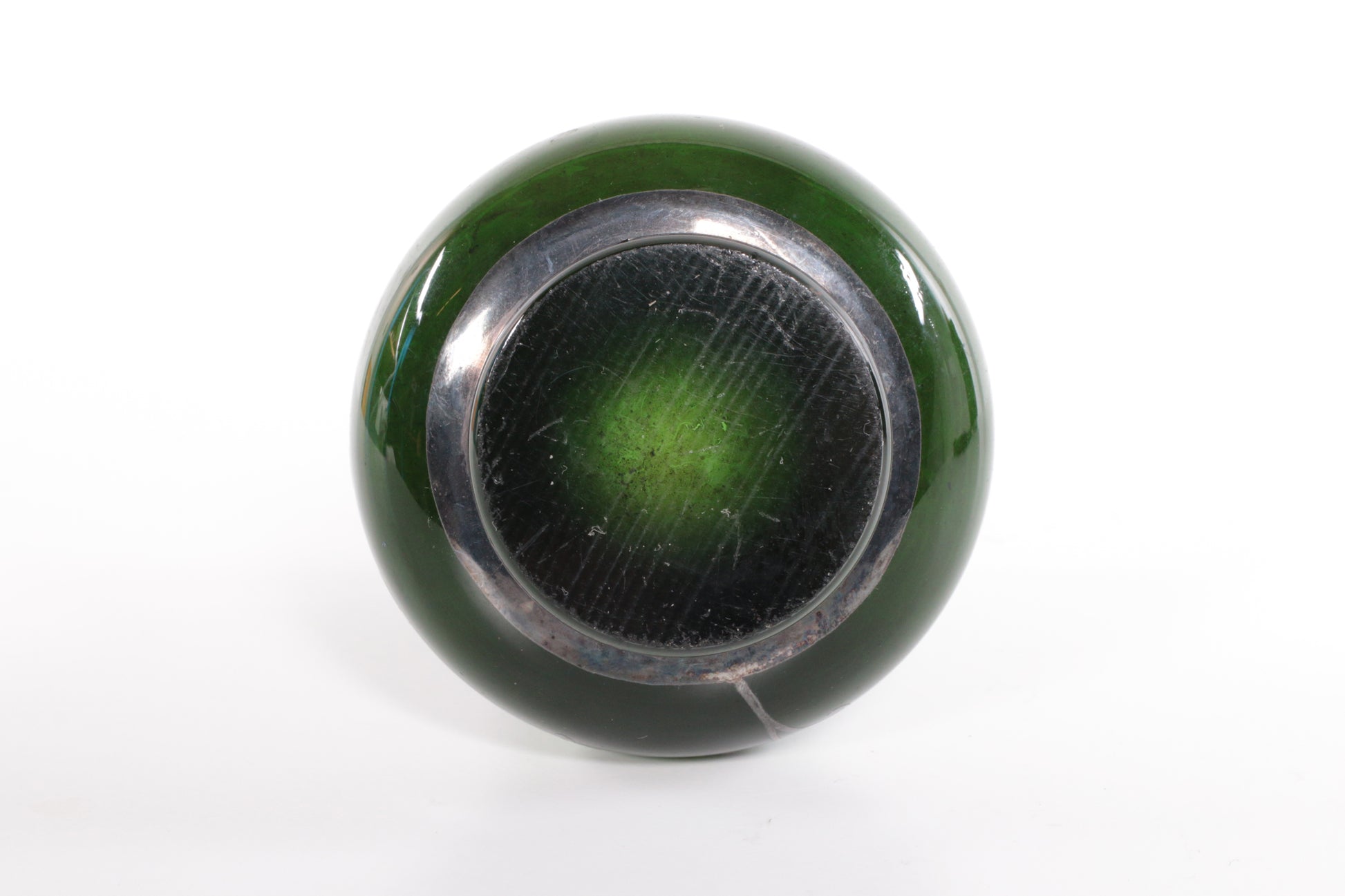 This charming small green vase, crafted around 1940, features delicate silver floral drawings, making it a beautiful decorative piece for any setting. Its elegant design and vintage appeal also make it an ideal companion for displaying a cherished photo or as part of a collection of antiques.