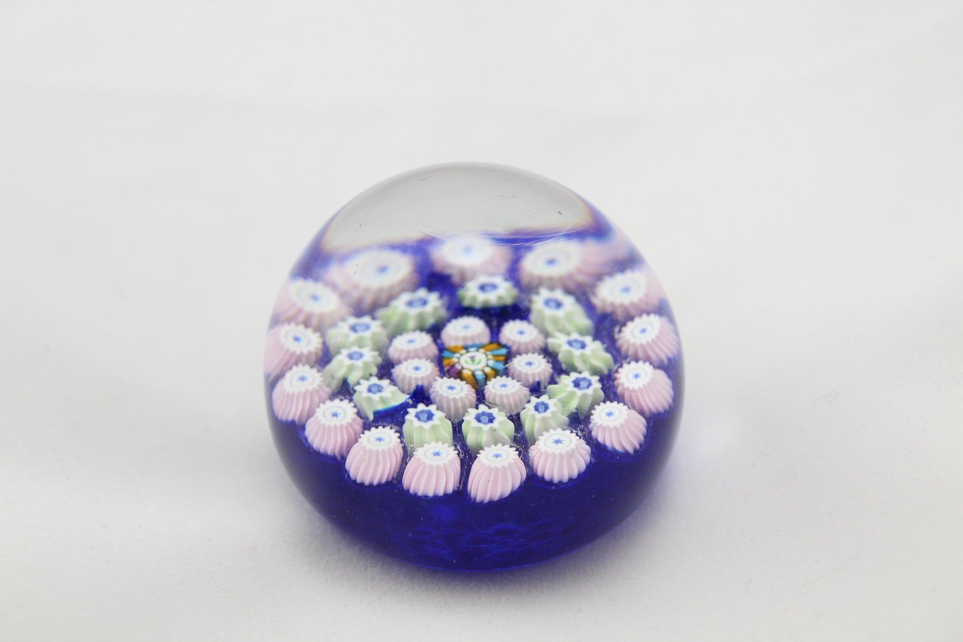 Millefiori, meaning "thousand flowers," is a glassmaking technique in which colorful glass canes are arranged to form detailed patterns. John Deacons is a renowned Scottish glass artist known for his exquisite millefiori paperweights, which are highly collectible.