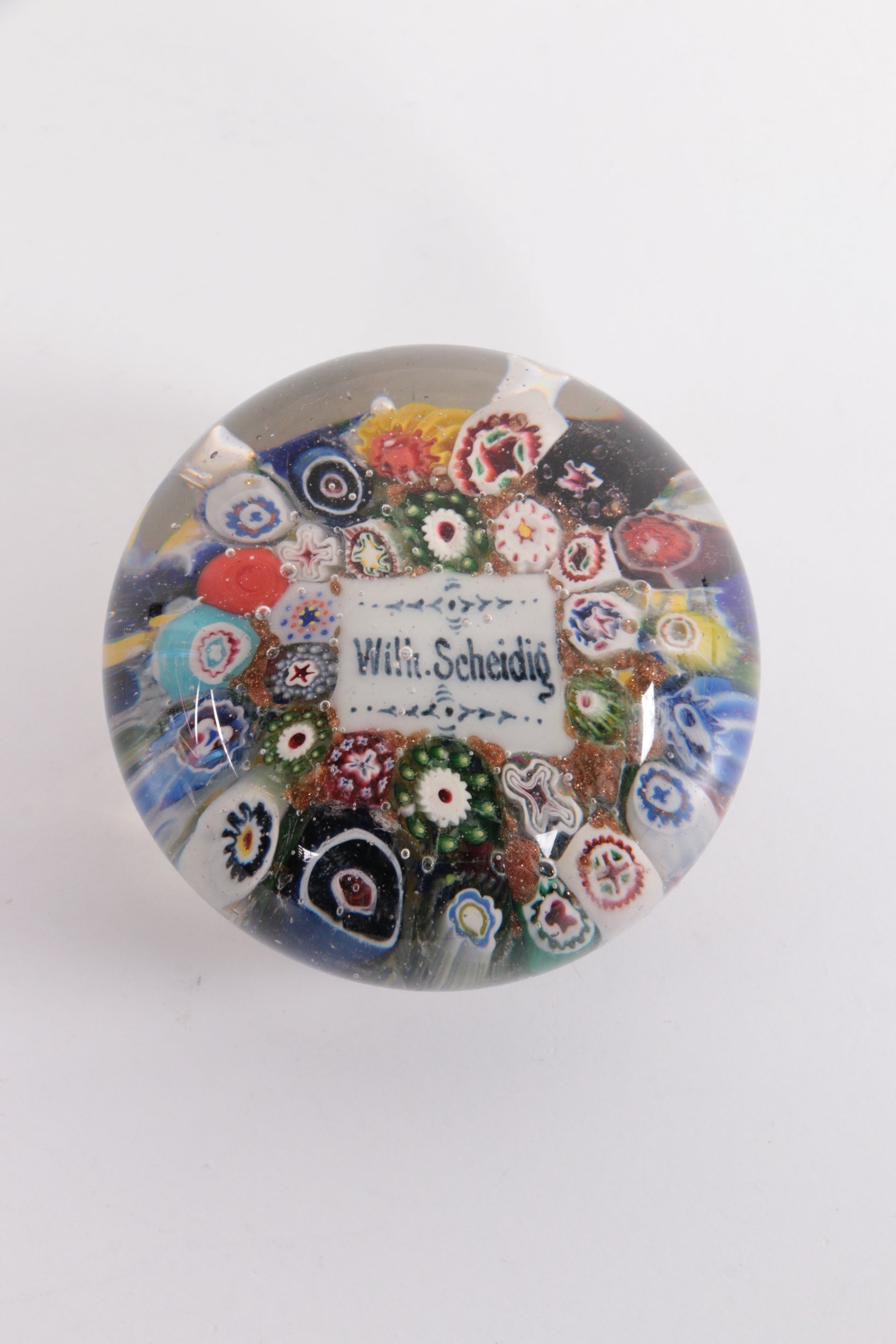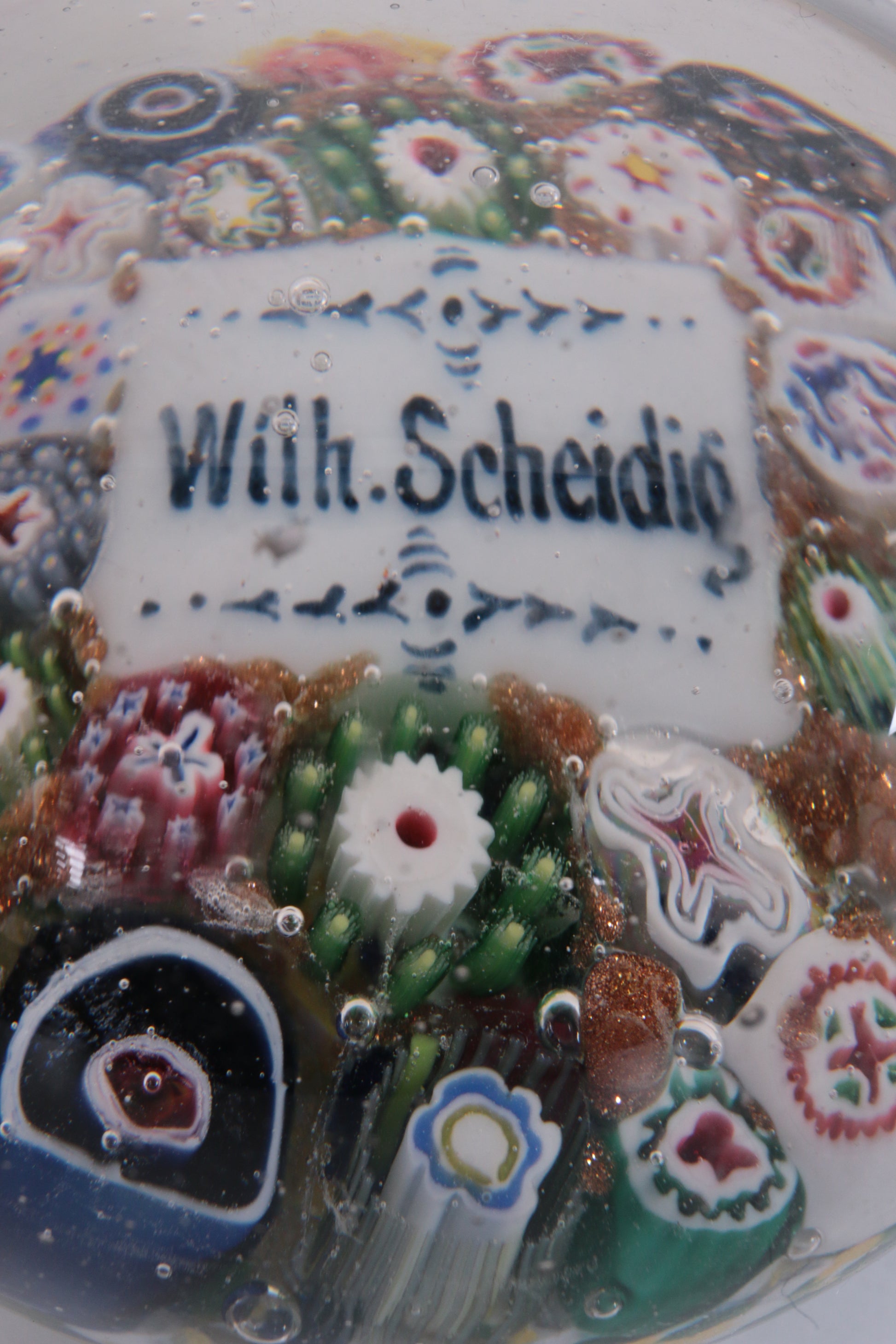 The name "Wilh Scheidig" on this paperweight may refer to a specific artisan or manufacturer from the time. Paperweights from this period were often beautifully crafted and have become valuable collectibles due to their rarity and design.