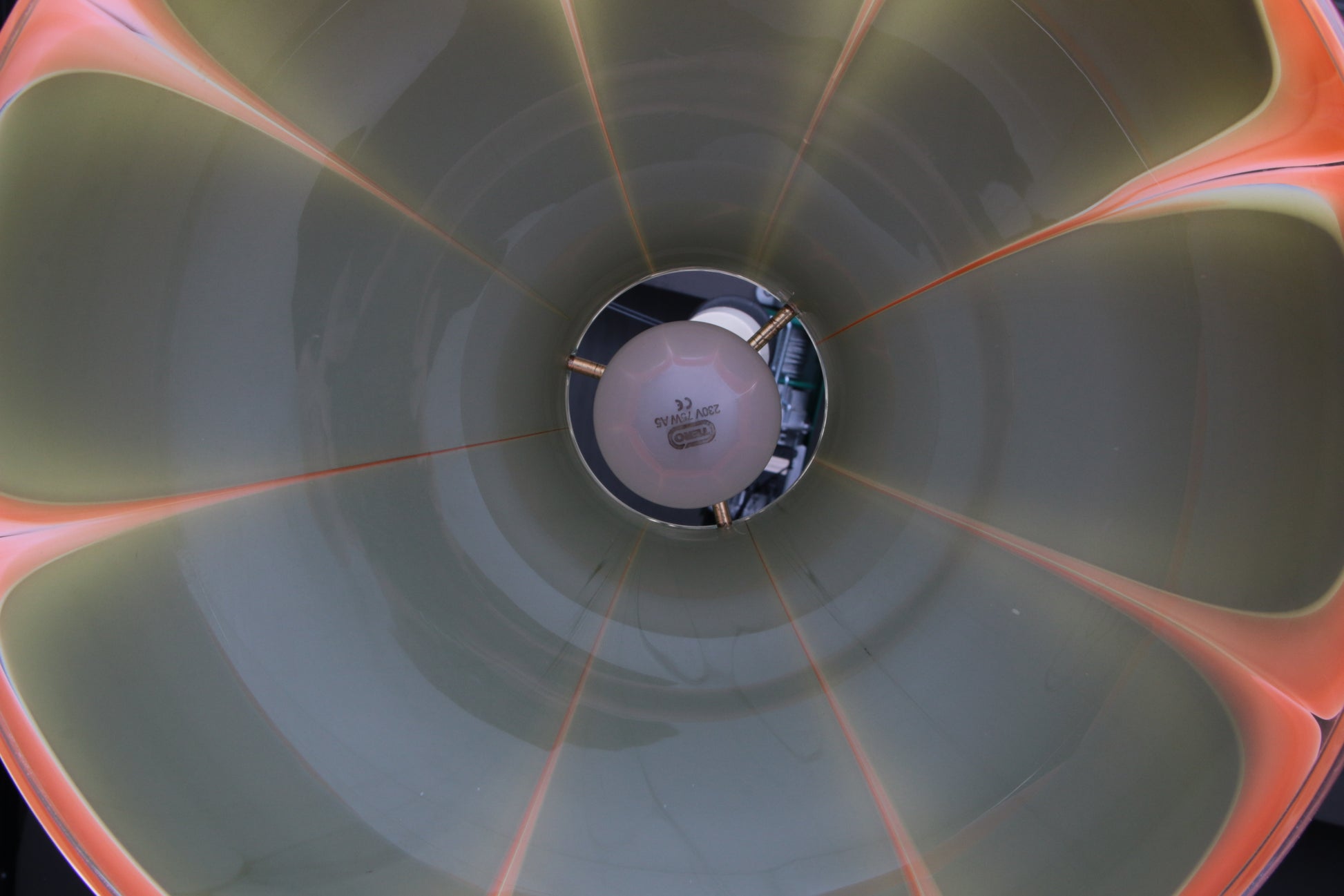 The chandelier’s mint green and orange color palette creates a unique and vibrant lighting effect. It is a true vintage collectible, with the original Kaiser Leuchten label still intact. The lamp is in excellent condition, with no chips or damage to the glass shade.