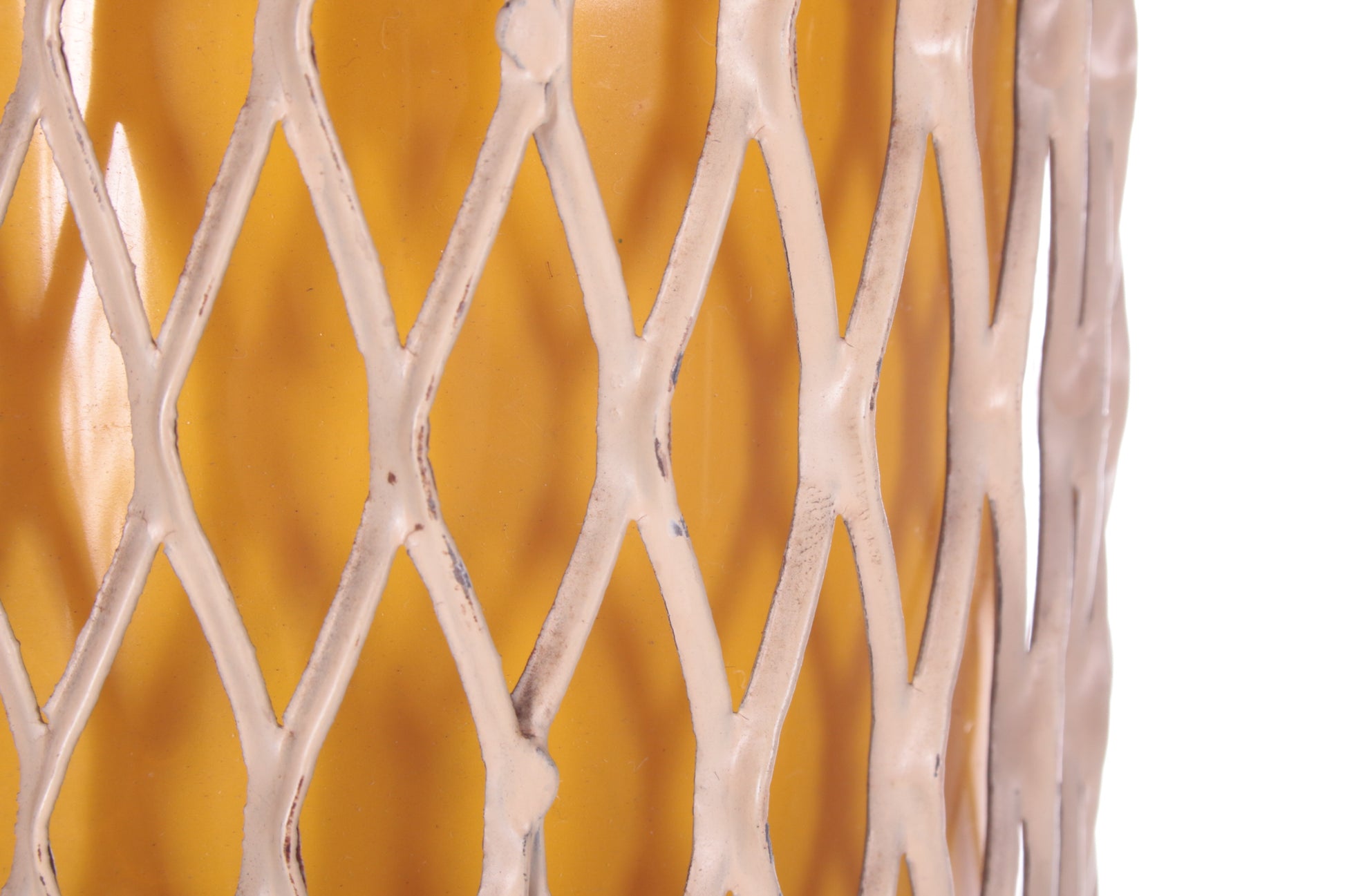 Designed by Josef Hurka for Napako in the 1950s. Made with yellow plastic, white metal race mesh, and an iron tripod base. Vintage condition with a charming patina.