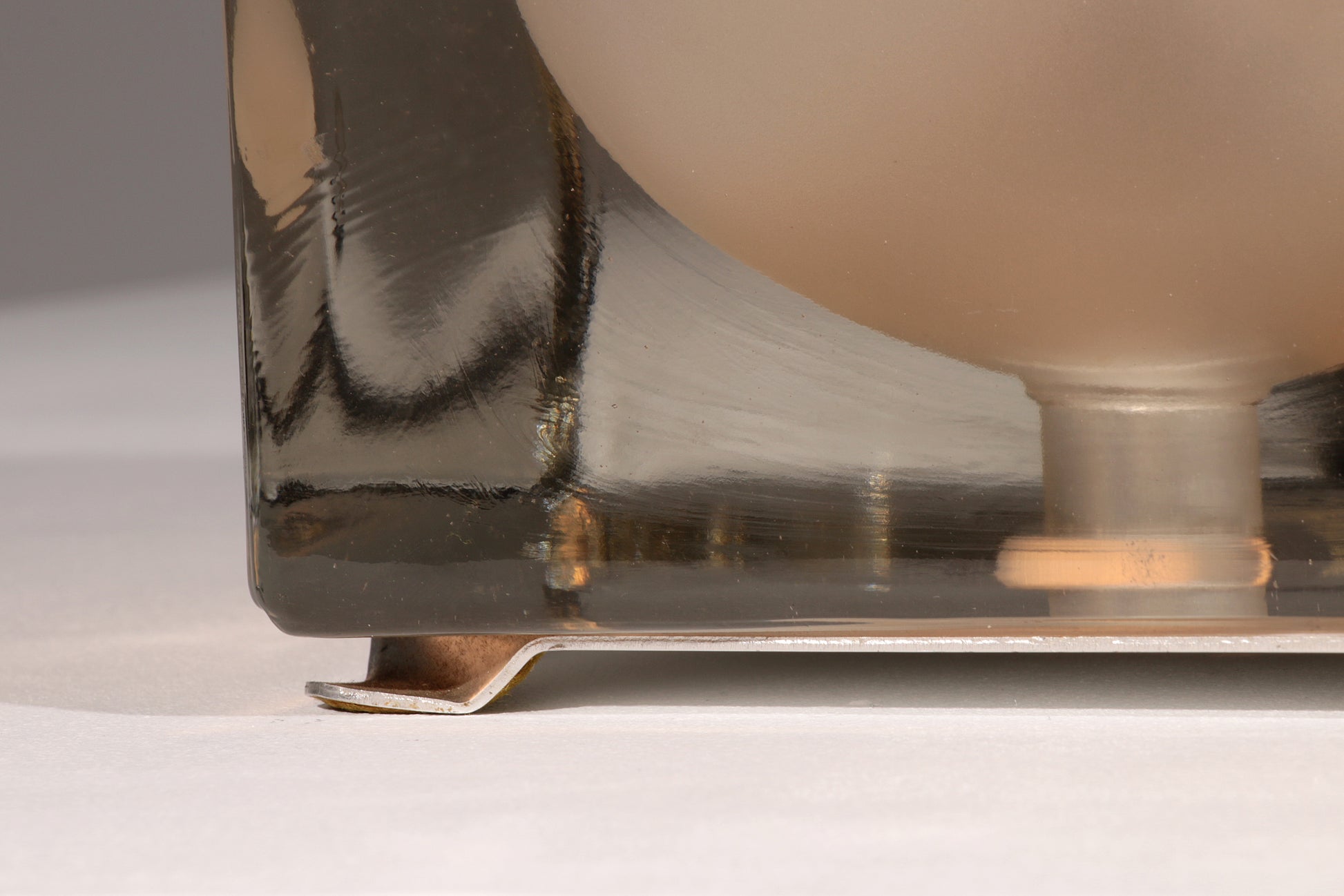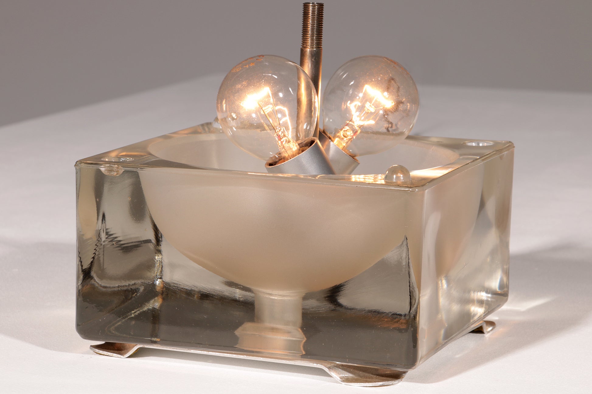 The Cubosfera table lamp, designed by Alessandro Mendini for Fidenza Vetraria, is a striking Italian design classic. Made from solid crystal glass with a hollow ball inside a cube, it stands on four delicate metal legs and features two lamps for unique lighting.
