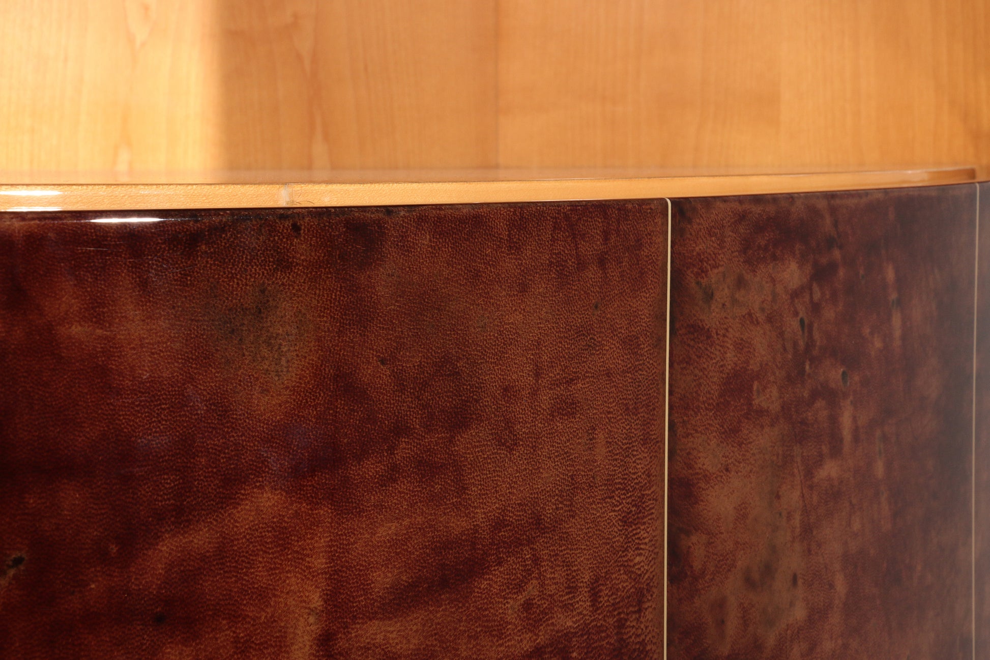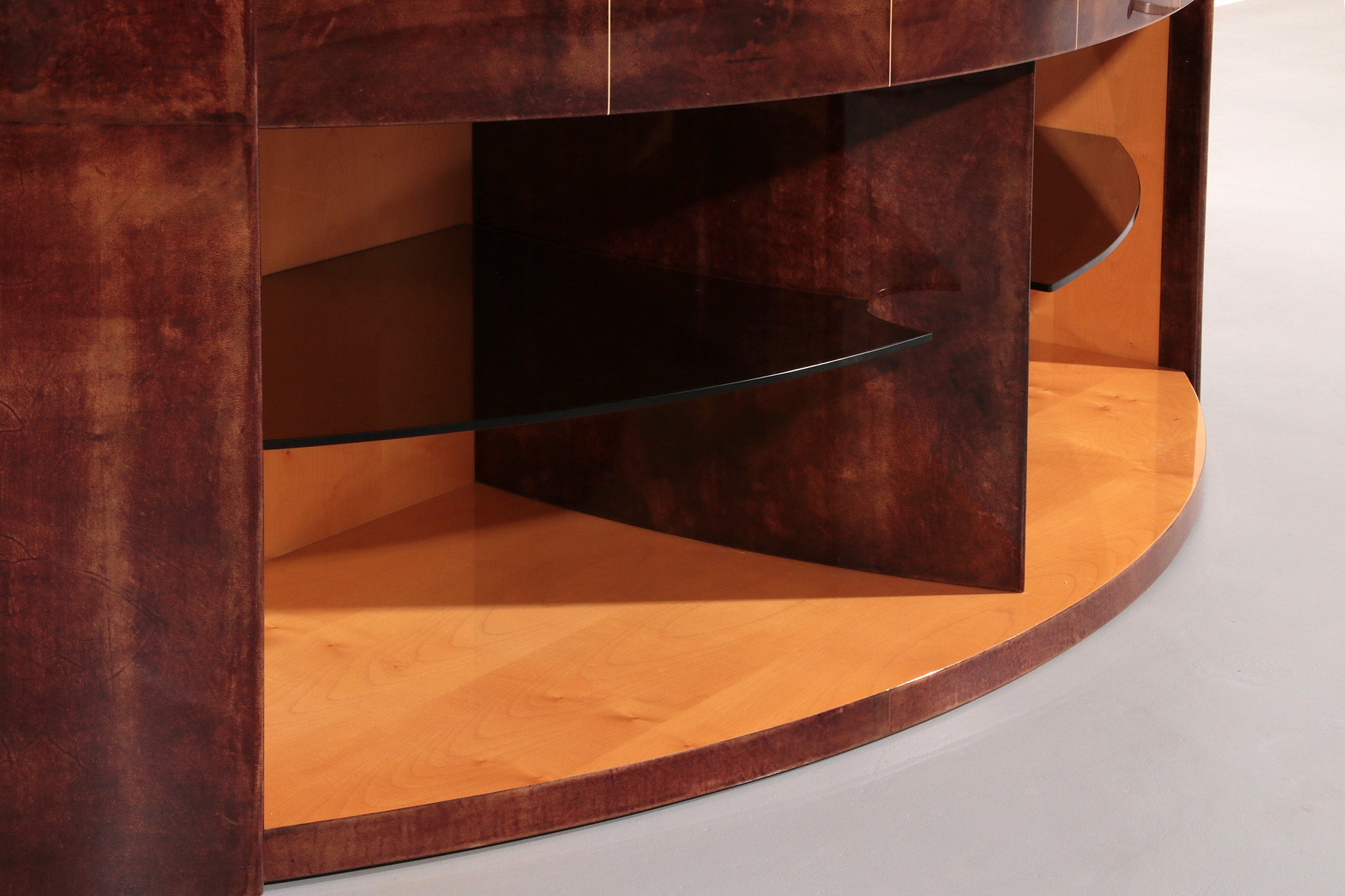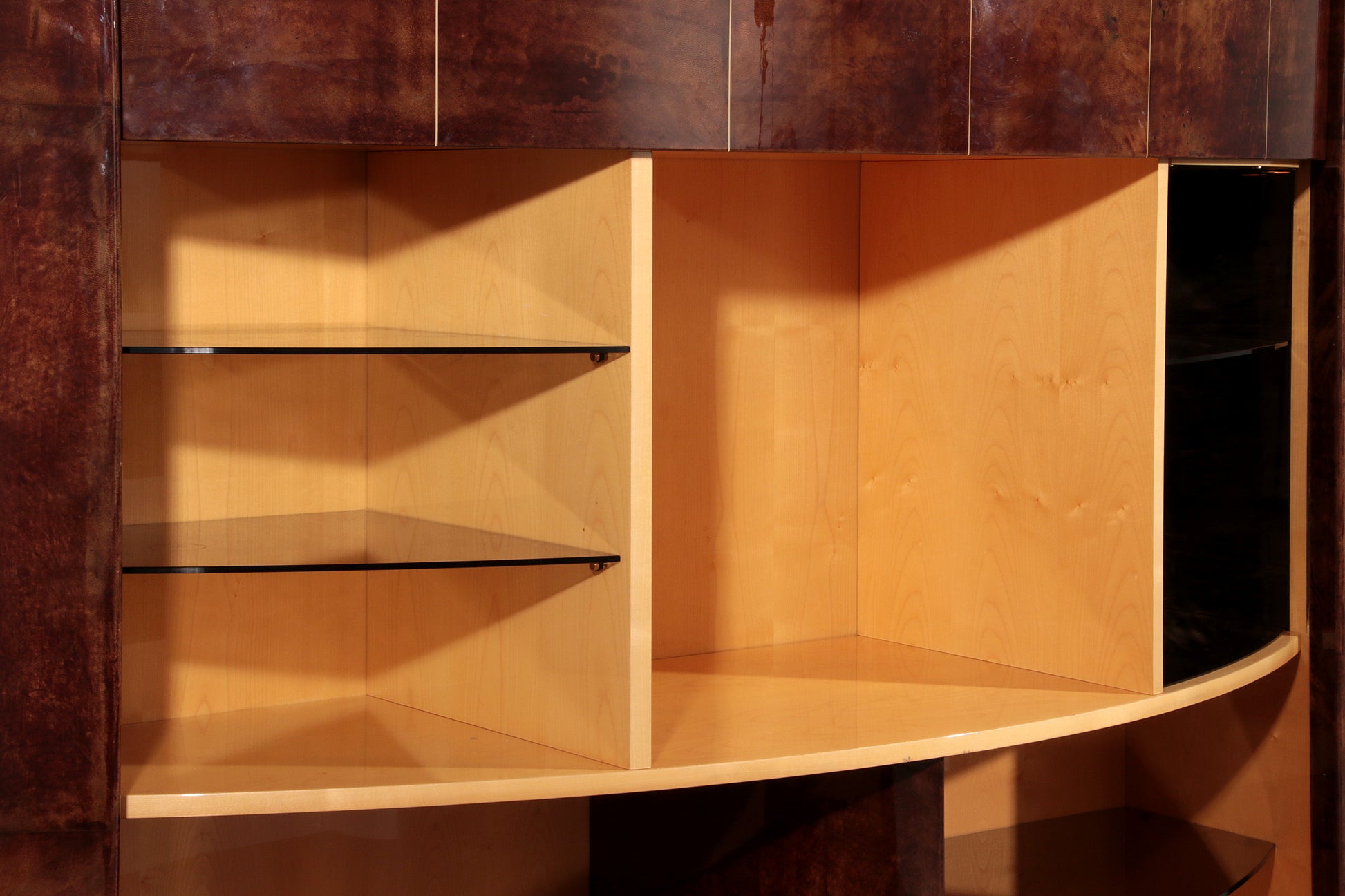 This bar cabinet is not only a practical piece for entertaining but also an authentic Italian design object from the golden age of mid-century modern. Its illuminated and mirrored interior adds a rich ambiance to any space, while the electric front lift sets it apart with a touch of mechanical brilliance. The goatskin finish, a Tura signature, ensures a uniquely tactile and luxurious aesthetic that no reproduction can match.