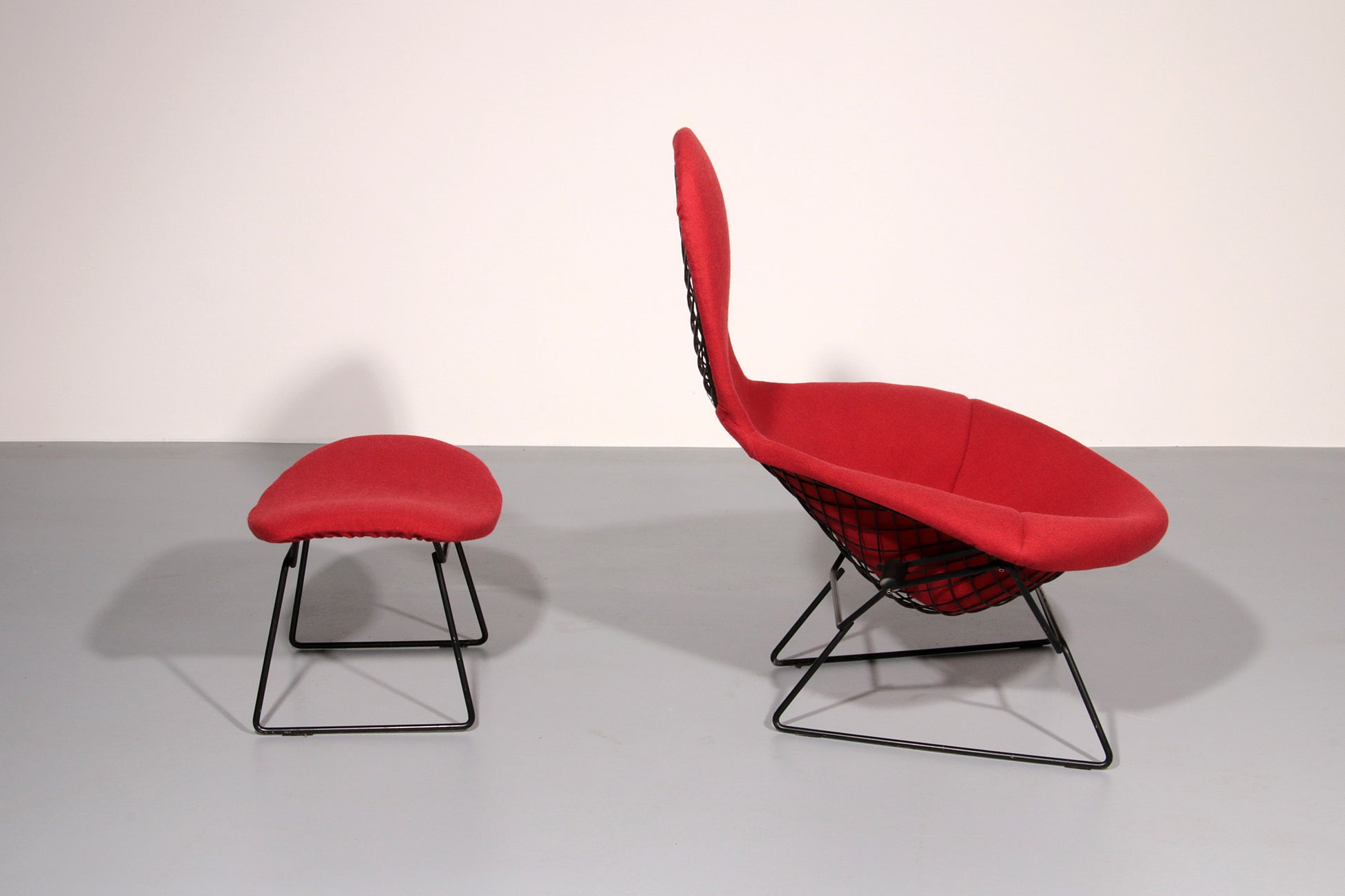 Harry Bertoia's Bird Armchair and Ottoman were initially handcrafted, with each wire bent by hand before welding. This piece is part of the first collection, produced in limited numbers, before transitioning to industrial production with Bob Savage.