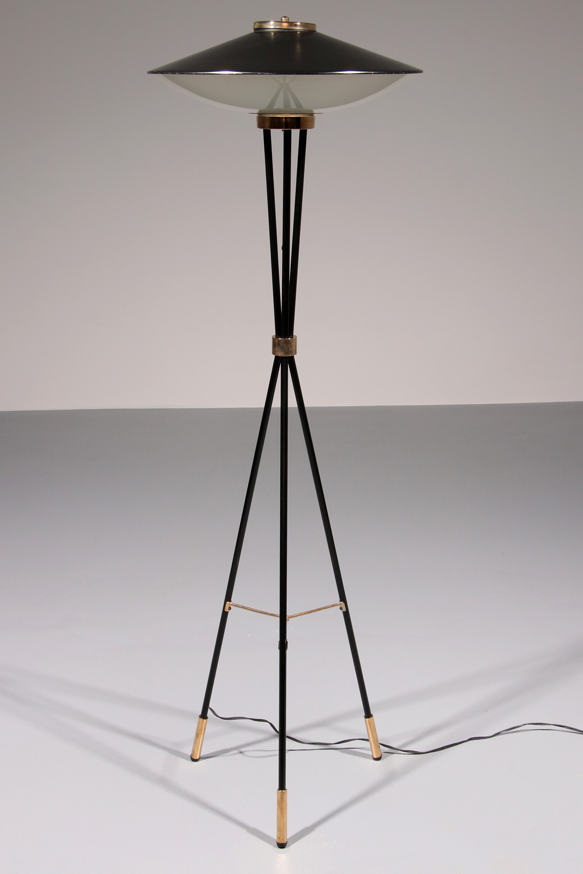This floor lamp is a genuine piece from the 1950s, reflecting the iconic design and craftsmanship of Stilnovo, a renowned Italian brand known for its innovative lighting solutions. Its unique blend of materials ensures both functionality and style.
