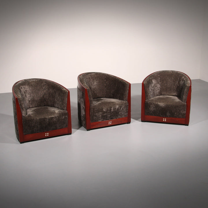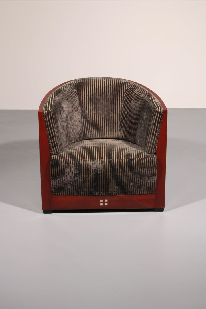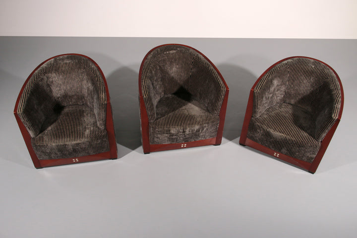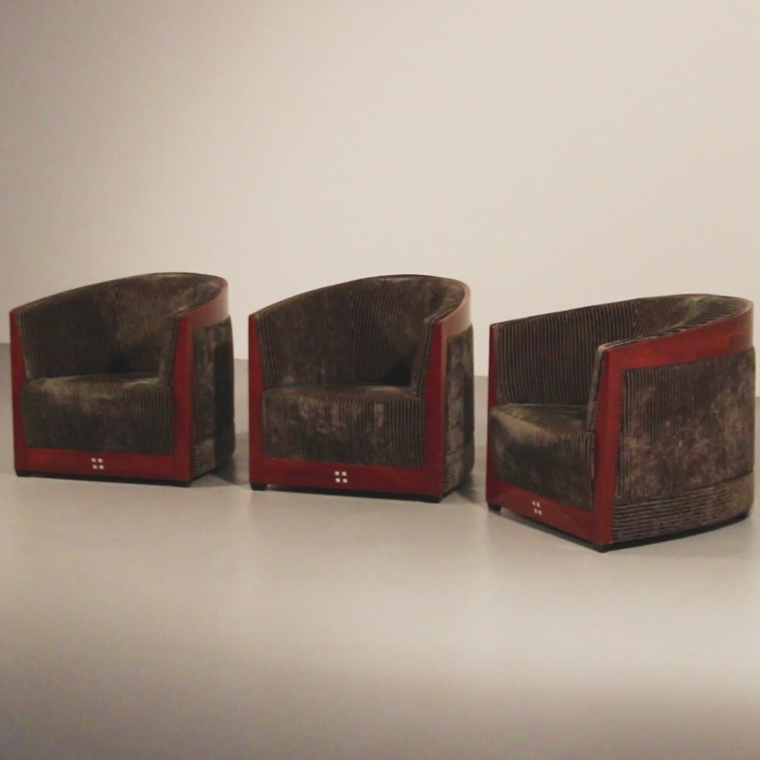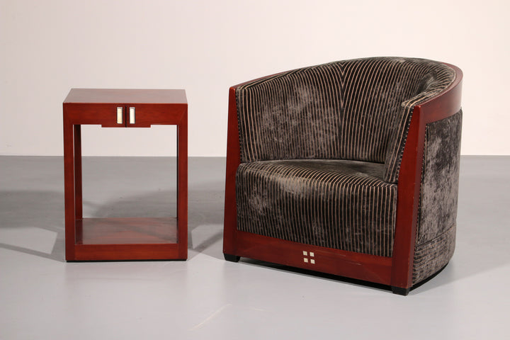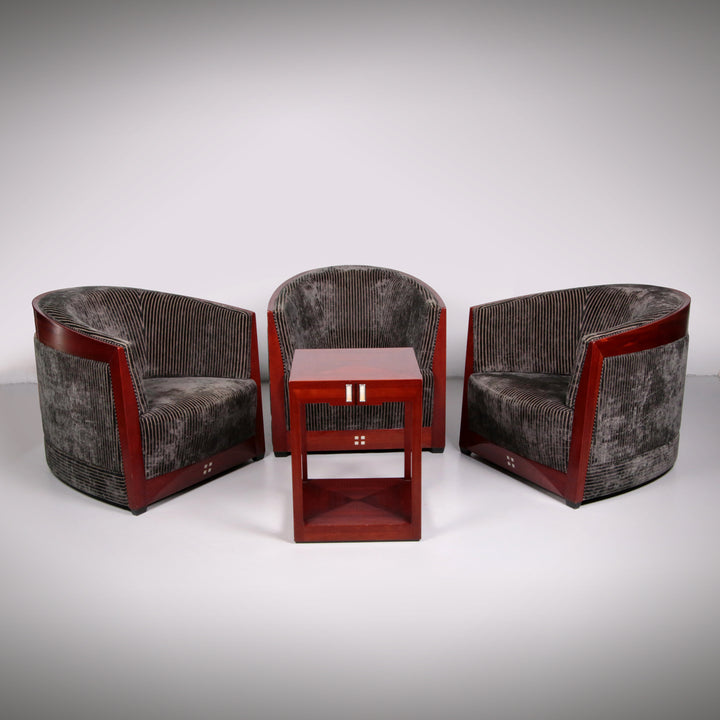 This luxurious set of three Decoforma armchairs by Frits Schuitema, paired with a stunning mahogany Art Deco side table, exudes sophistication and craftsmanship. Handcrafted with a Bubinga wood frame and elegant blue-grey rib upholstery, this set blends timeless design with premium materials. Perfect for a stylish living space or bedroom, it offers both comfort and elegance. Choosing vintage furniture like this not only enhances your interior but also promotes sustainability.