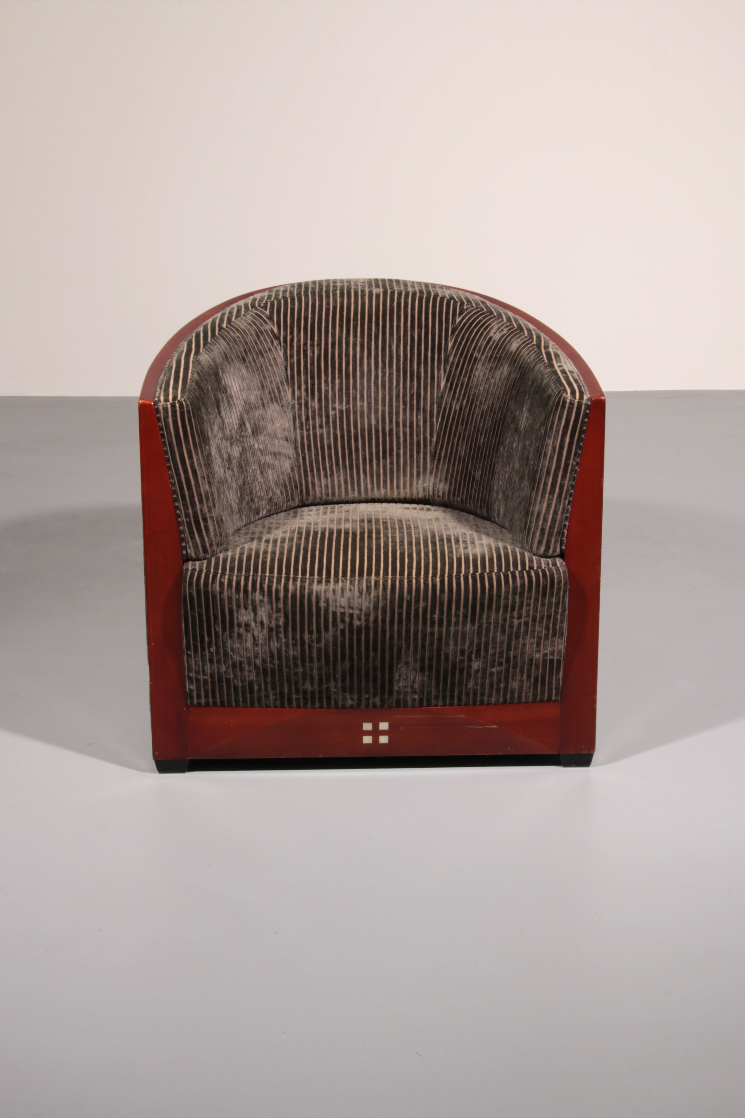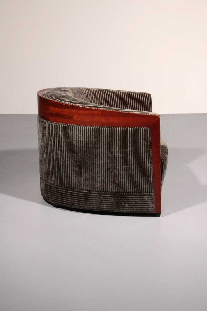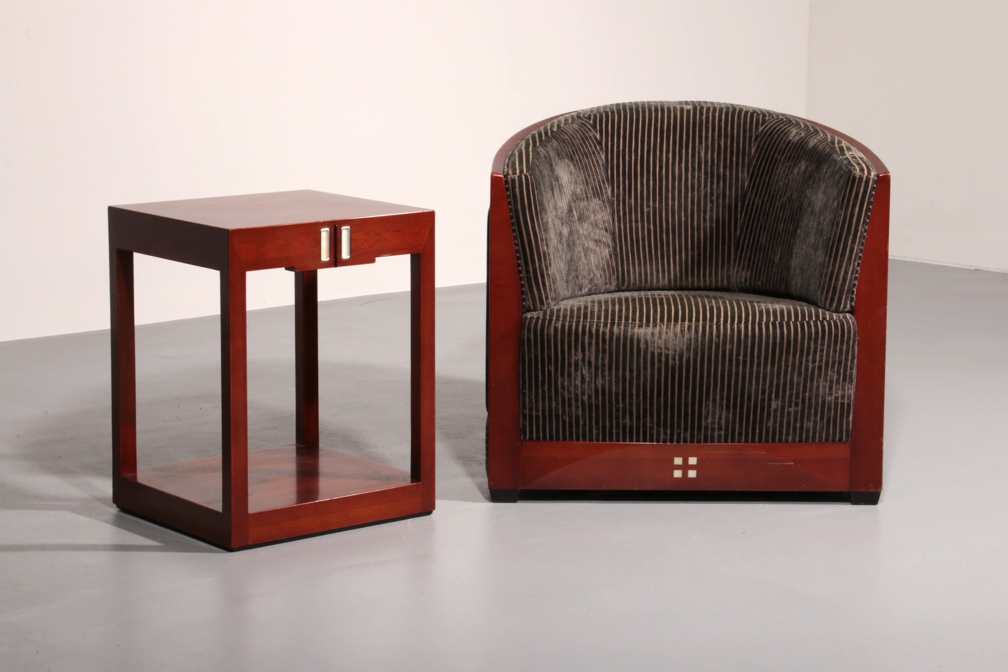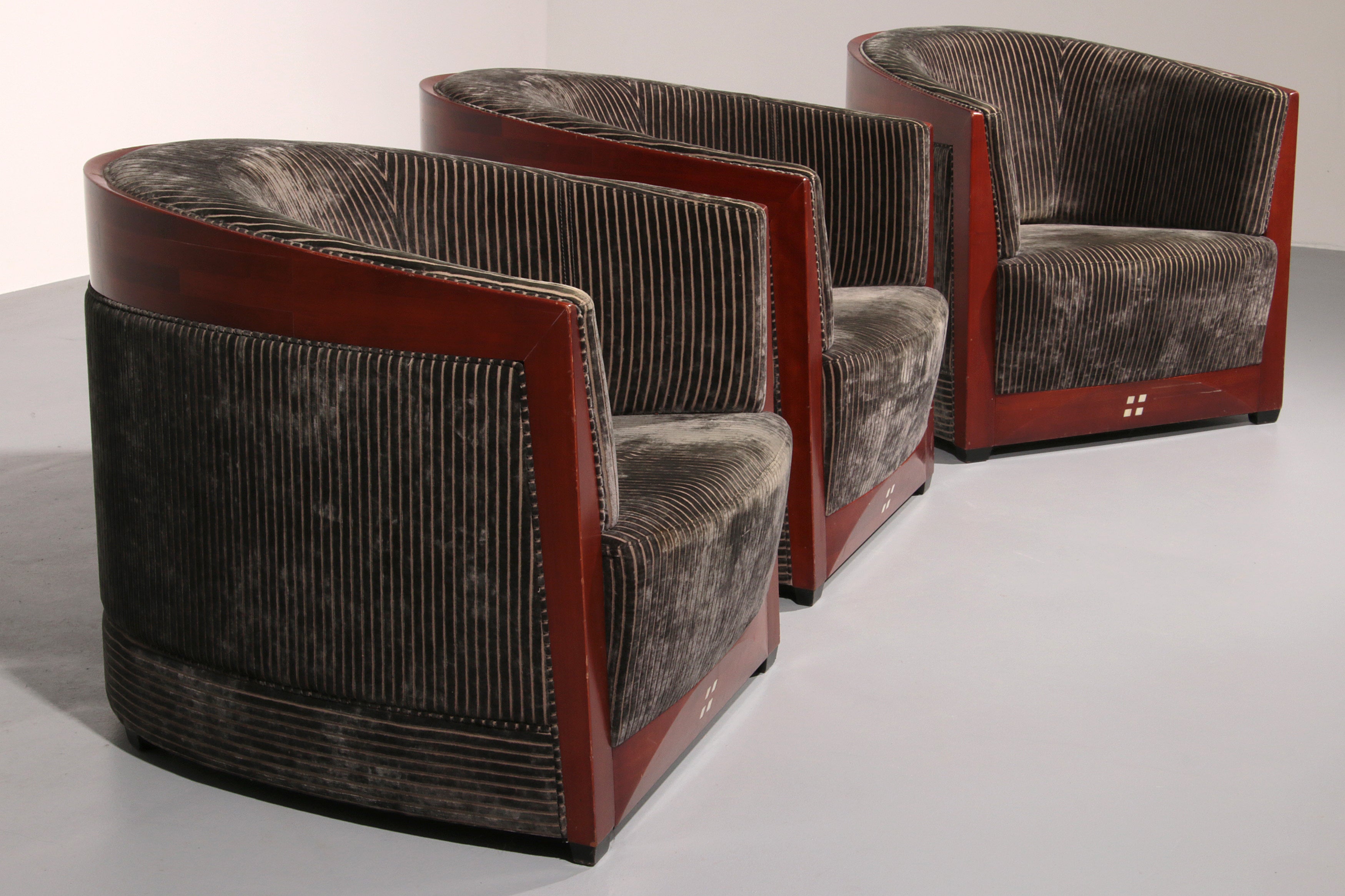 This luxurious set of three Decoforma armchairs by Frits Schuitema, paired with a stunning mahogany Art Deco side table, exudes sophistication and craftsmanship. Handcrafted with a Bubinga wood frame and elegant blue-grey rib upholstery, this set blends timeless design with premium materials. Perfect for a stylish living space or bedroom, it offers both comfort and elegance. Choosing vintage furniture like this not only enhances your interior but also promotes sustainability.