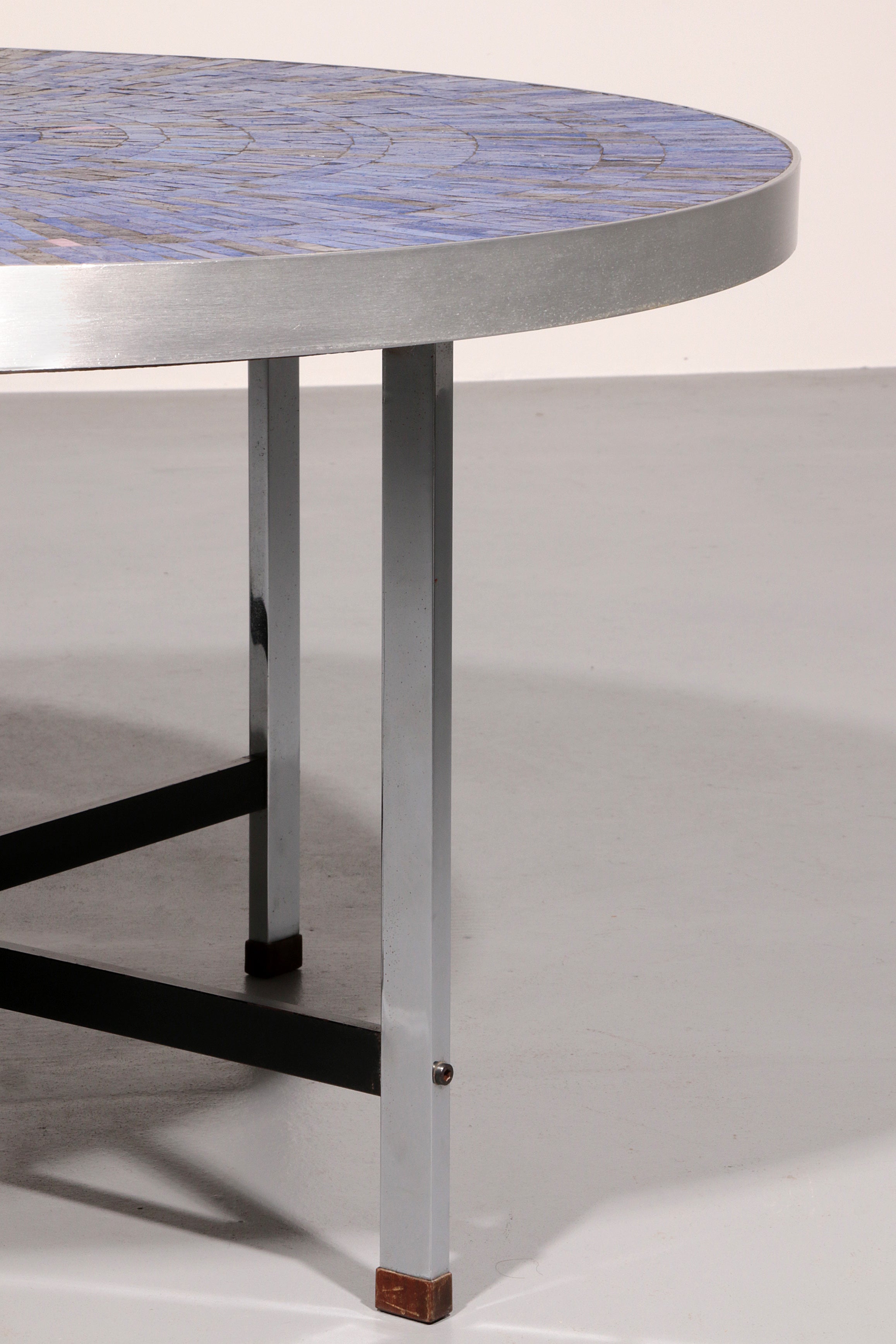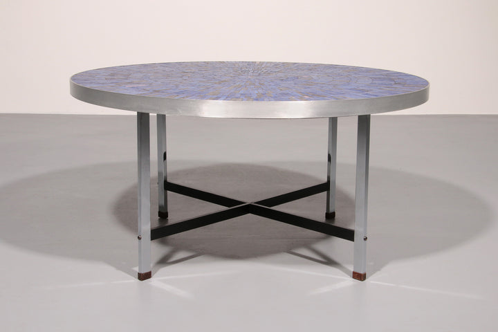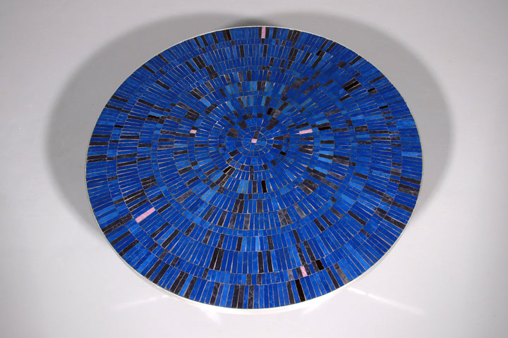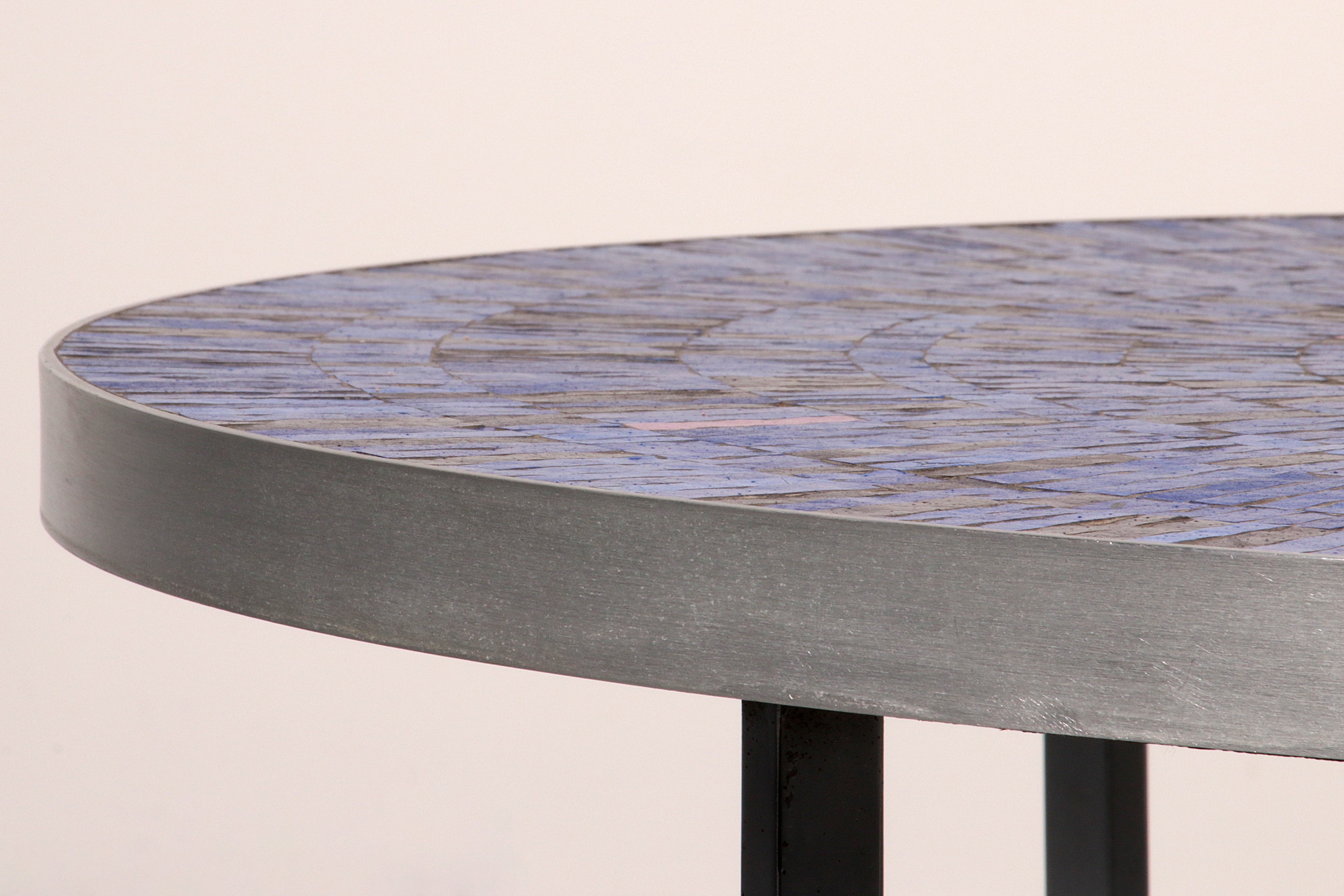 This coffee table is a perfect reflection of that philosophy. The round tabletop is framed by a brushed aluminum edge that elegantly surrounds a carefully composed mosaic surface. The mosaic is made from a beautiful variation of blue-toned tiles, creating depth, texture, and a subtle play of light that changes throughout the day. Each tile contributes to a harmonious composition that feels artistic yet timeless.