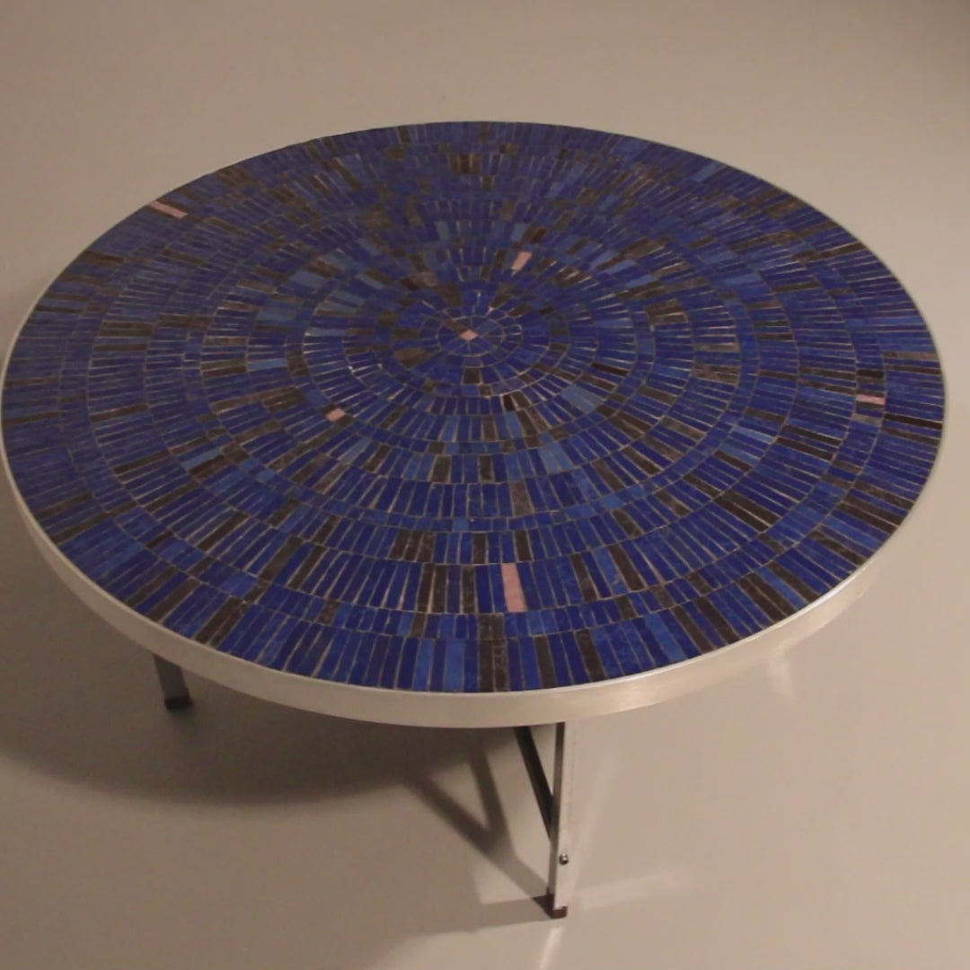 The table stands on sleek chrome legs that end with a combination of metal and wood feet, giving it a distinctive mid-century character while ensuring stability. The contrast between the cool chrome, the brushed aluminum, and the vibrant blue mosaic creates a piece that immediately draws attention in any interior.