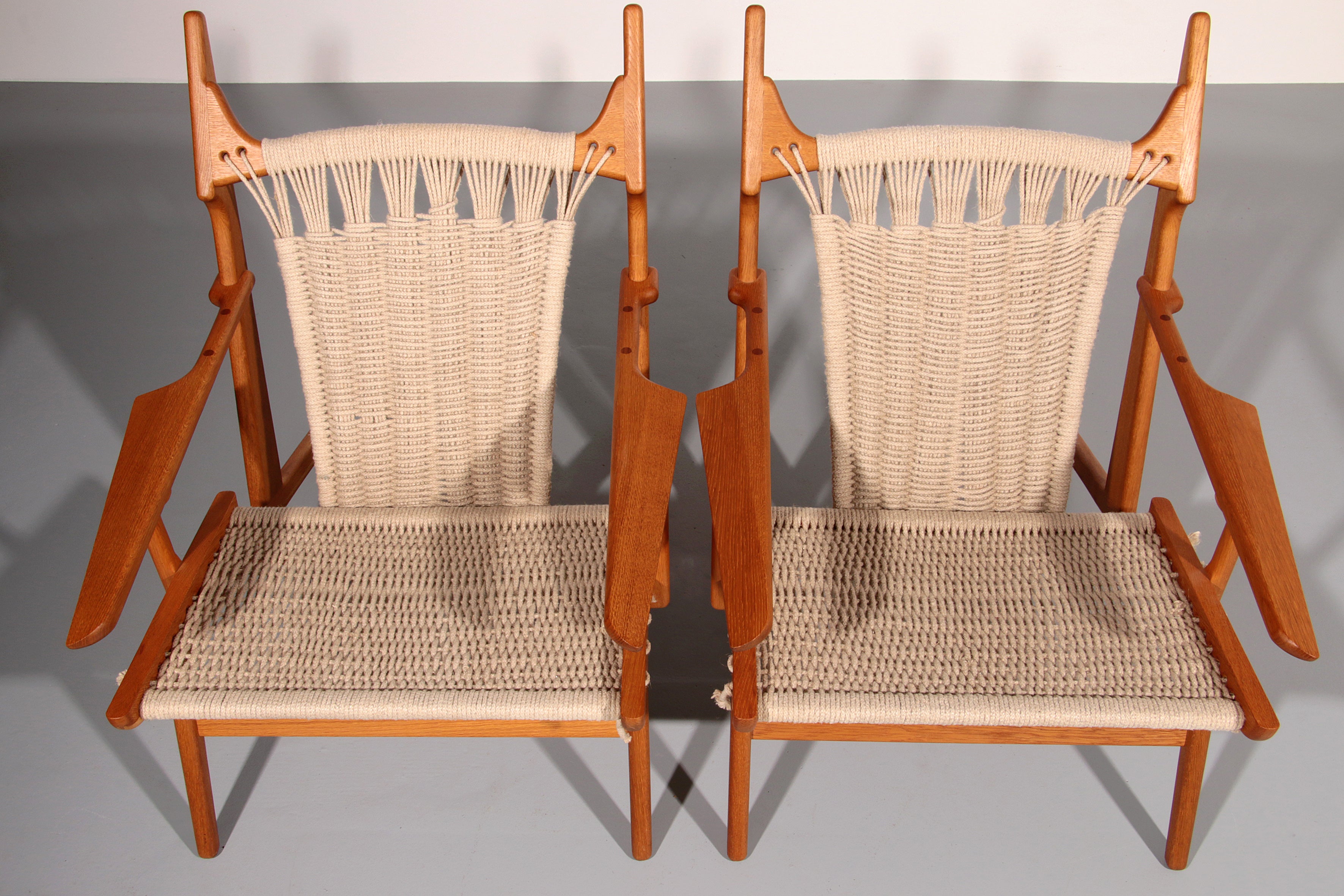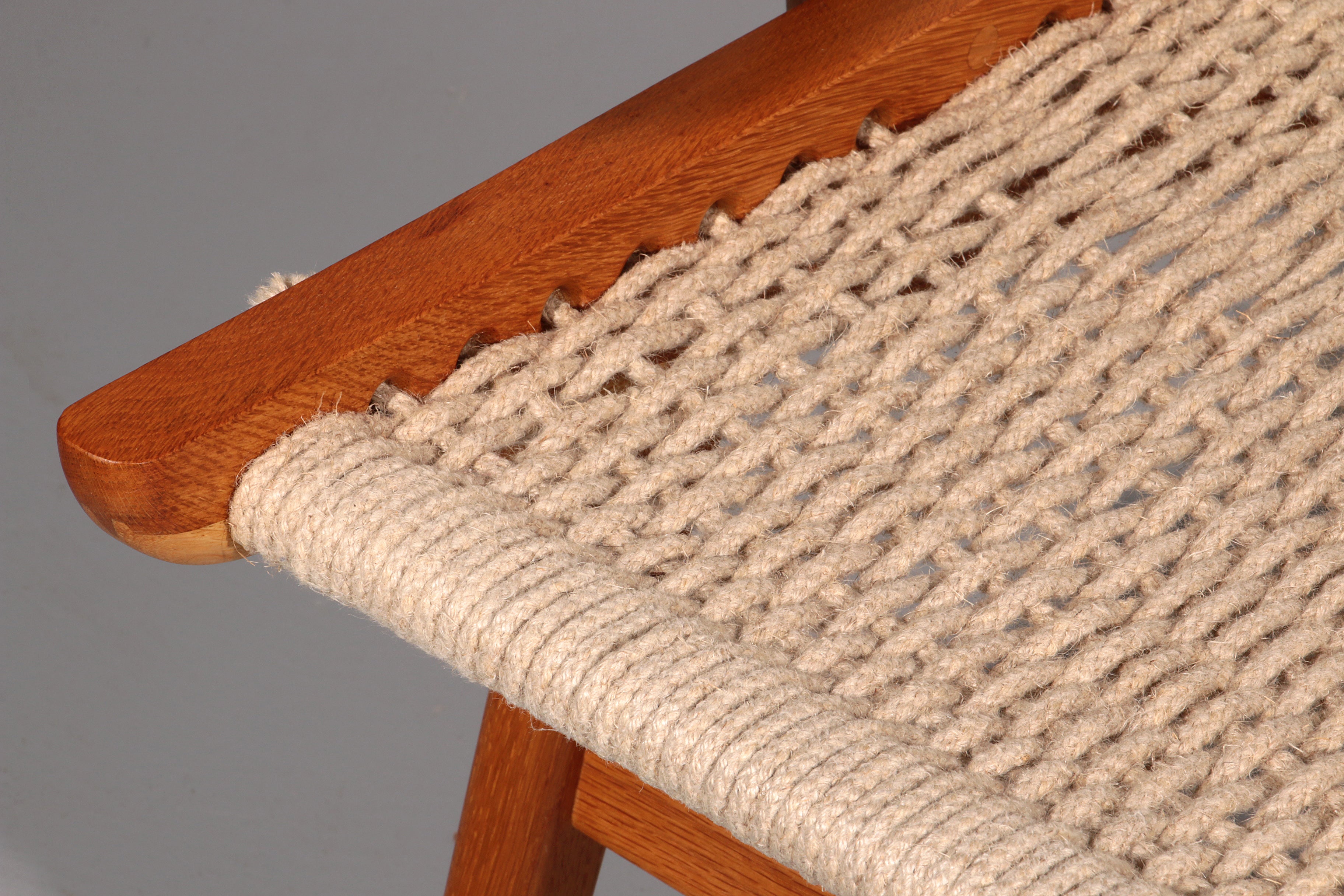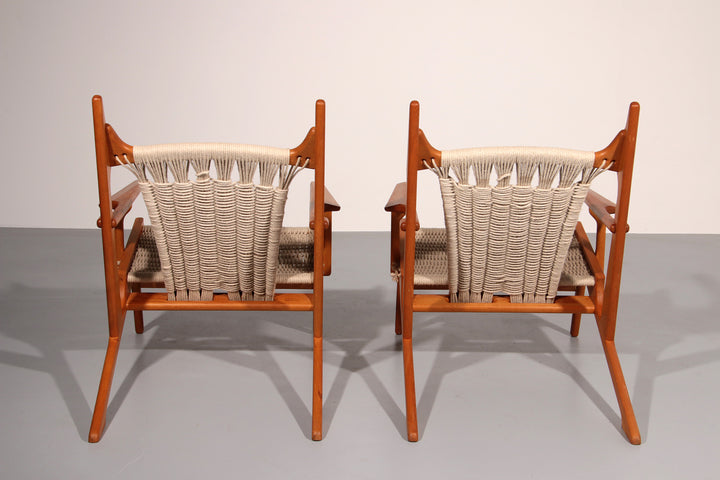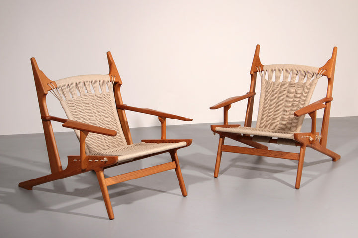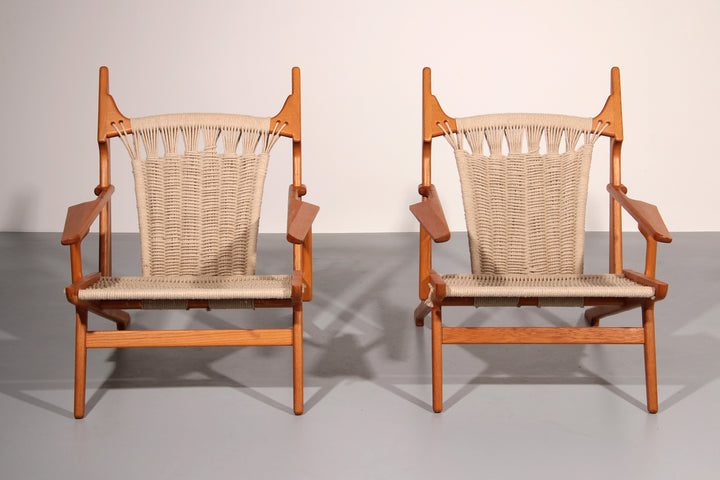 Experience the epitome of Danish craftsmanship with the Martin Godsk MG35 Lounge Chair Set. Designed and handcrafted in 1990 by the renowned woodworker Martin Godsk, this set of lounge chairs exemplifies modern elegance and timeless design. Constructed from exquisite oak and featuring a thick, handwoven wool rope backrest and seat, these chairs are not only visually stunning but also offer unparalleled comfort. With only about 10 ever made, each chair is a testament to Martin's dedication to quality and artistry, taking over a week to craft from start to finish. This limited edition set is a rare find, perfect for those who appreciate unique, sustainable furniture that tells a story.
