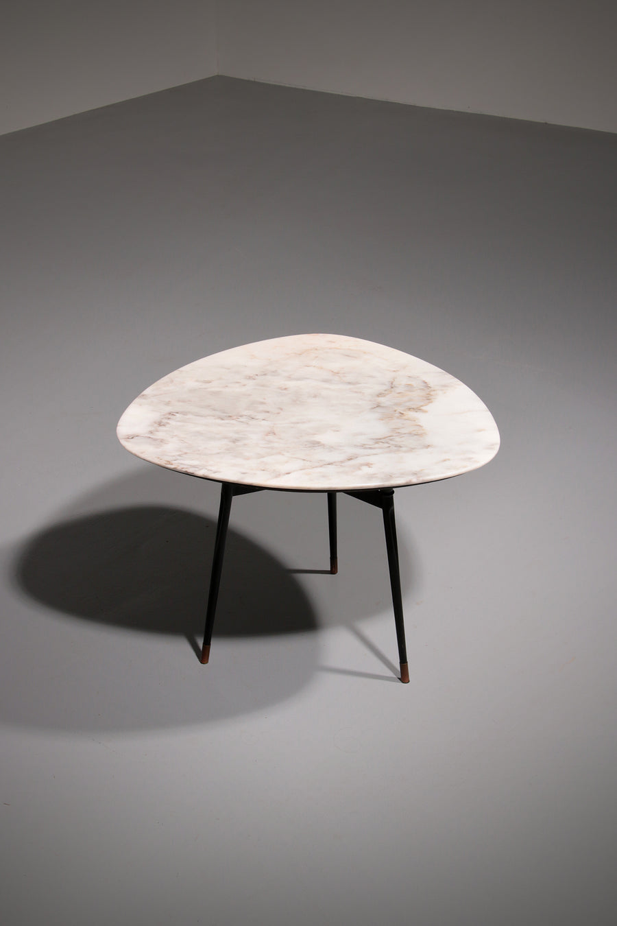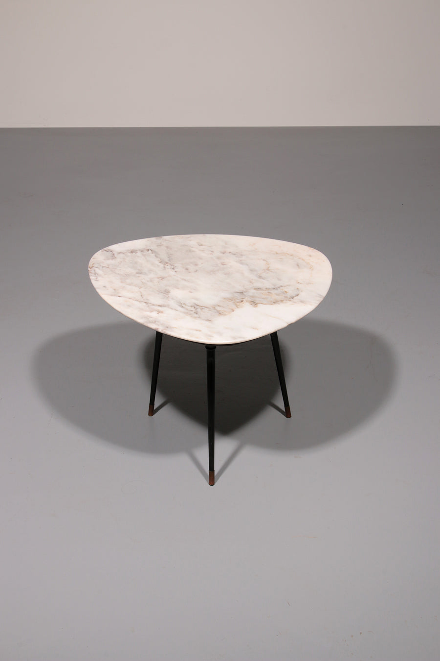 The table has minor use marks that blend naturally with its elegant design, reflecting its history while maintaining full functionality. The sturdy metal frame and polished brass legs support the marble top securely, offering both durability and style. Its small footprint makes it easy to place anywhere in your home.