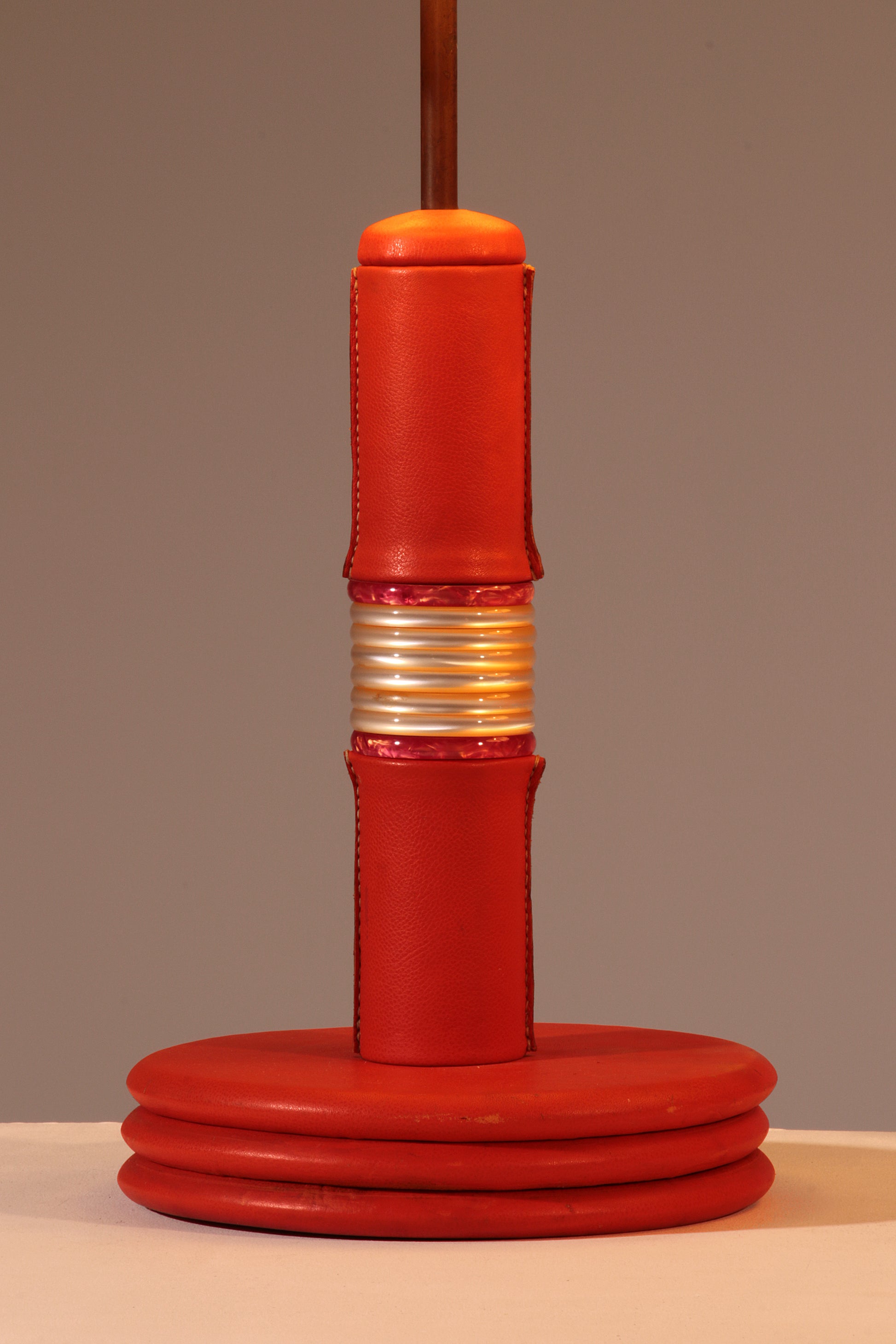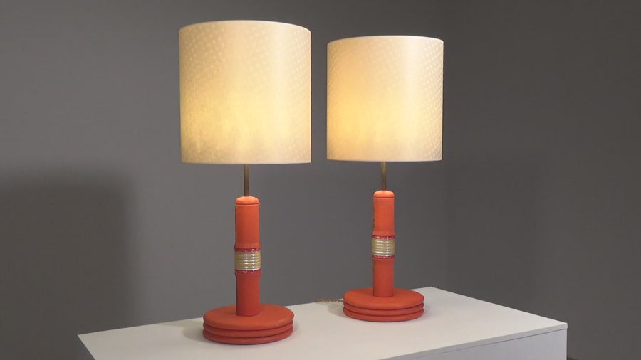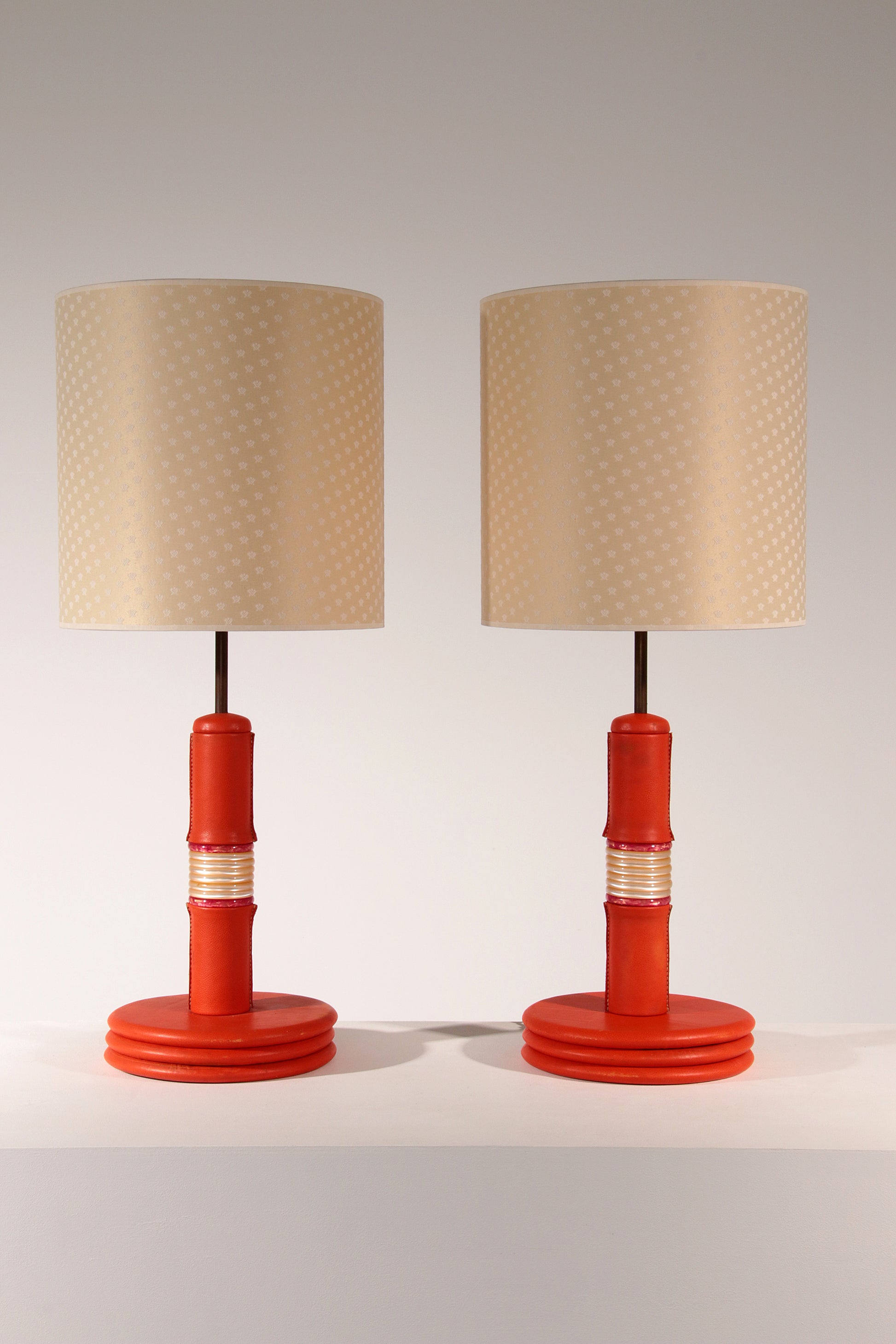 This stunning set of two 1960s French lamp bases offers a blend of vibrant color, unique leather craftsmanship, and elegant design. Perfect for creating a personalized lighting solution, these bases will enhance any room while serving as beautiful decorative accents and conversation pieces. Transform your space with these exquisite vintage items that celebrate the artistry of mid-century design.