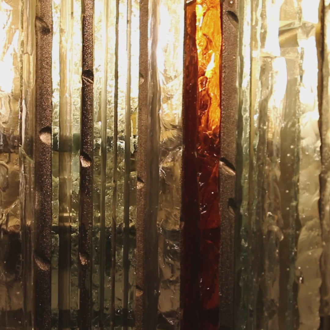 Crafted in Verona, this piece embodies the daring spirit of the era, combining amber-toned and clear pressed glass with a striking metal wall-mounted structure.