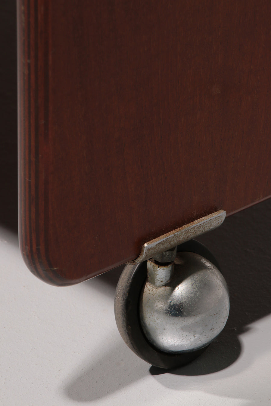A rare and elegant 1960s coffee table by Marco Zanuso for Arflex, part of the Springtime collection. Made of wood, it features a sliding top that opens to reveal a hidden storage compartment—perfect for bottles or accessories. Mounted on four wheels for easy mobility, it combines functional innovation with timeless Italian design. Excellent condition, a genuine collectible for design enthusiasts.