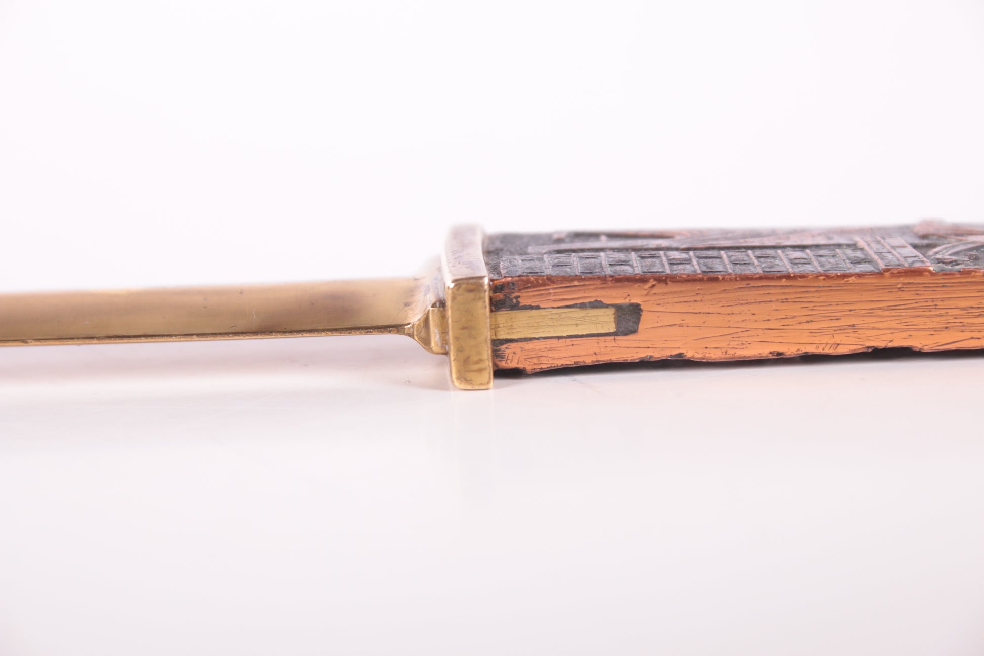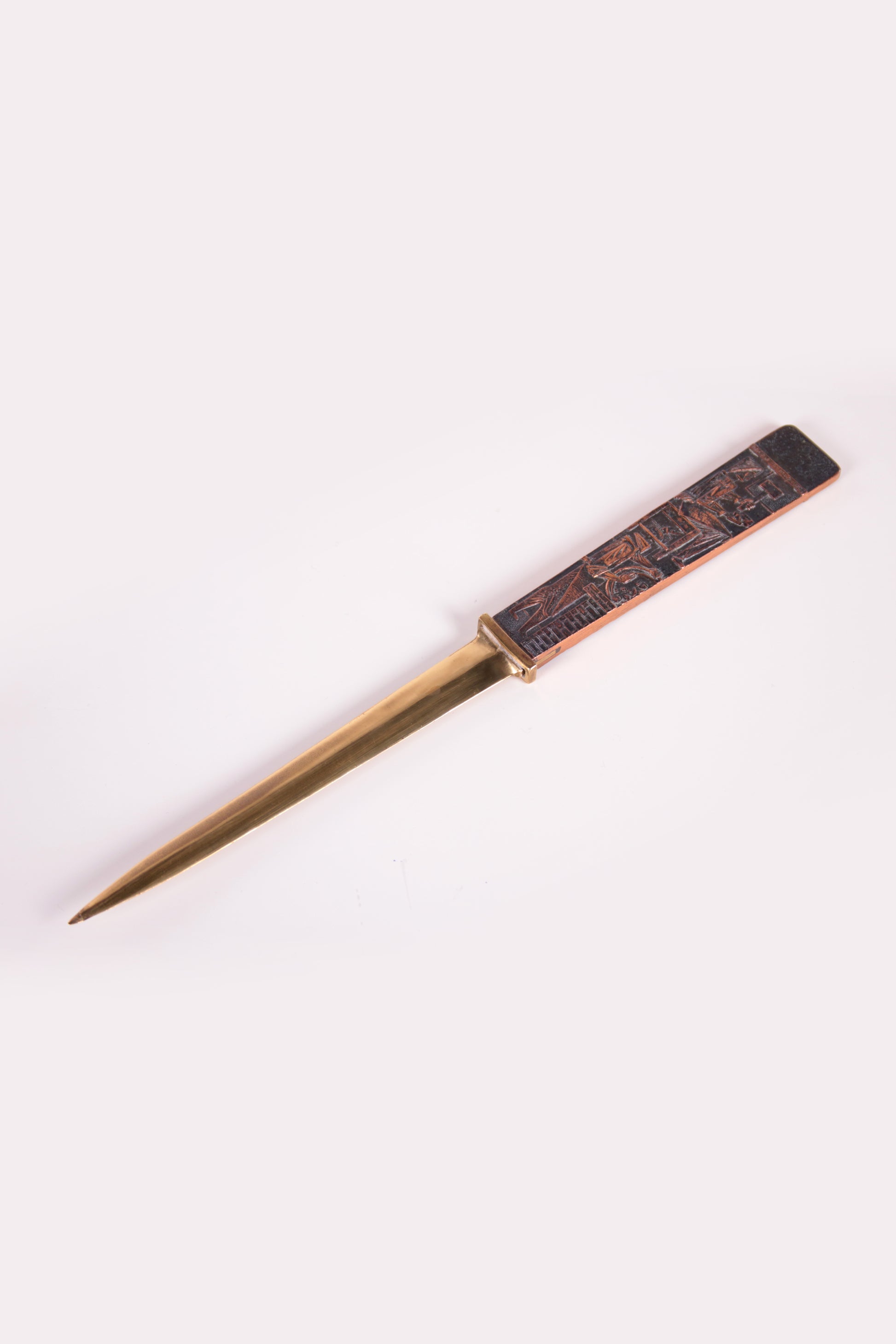 A vintage brass letter opener from the 1930s, featuring a detailed handle and a gleaming blade.