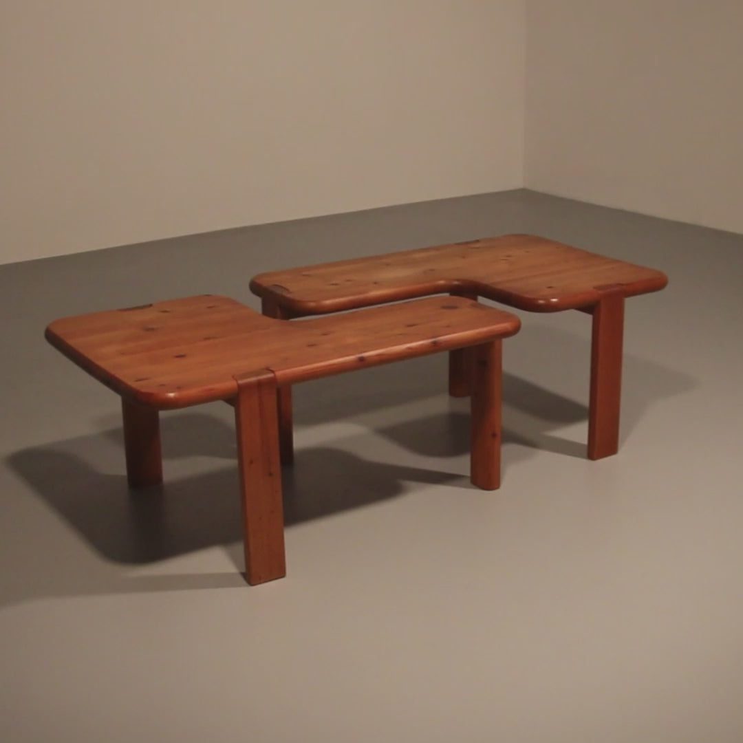 Dimensions are: 100cmx55cmx49cm, combined it's approx. Wonderful pair of rare wooden tables by Aksel Kjersgaard for Odder furniture, Denmark in very good condition. These two L-shaped tables can be used in various combinations which makes them suitable for many different purposes, as coffee table, side table, or end tables for example. The tables are made of a solid heavy pine wood with rounded edges which gives a them beautiful organic shape.