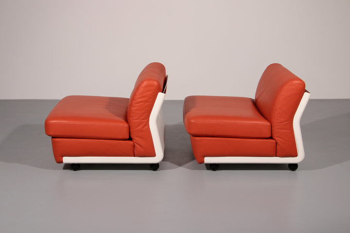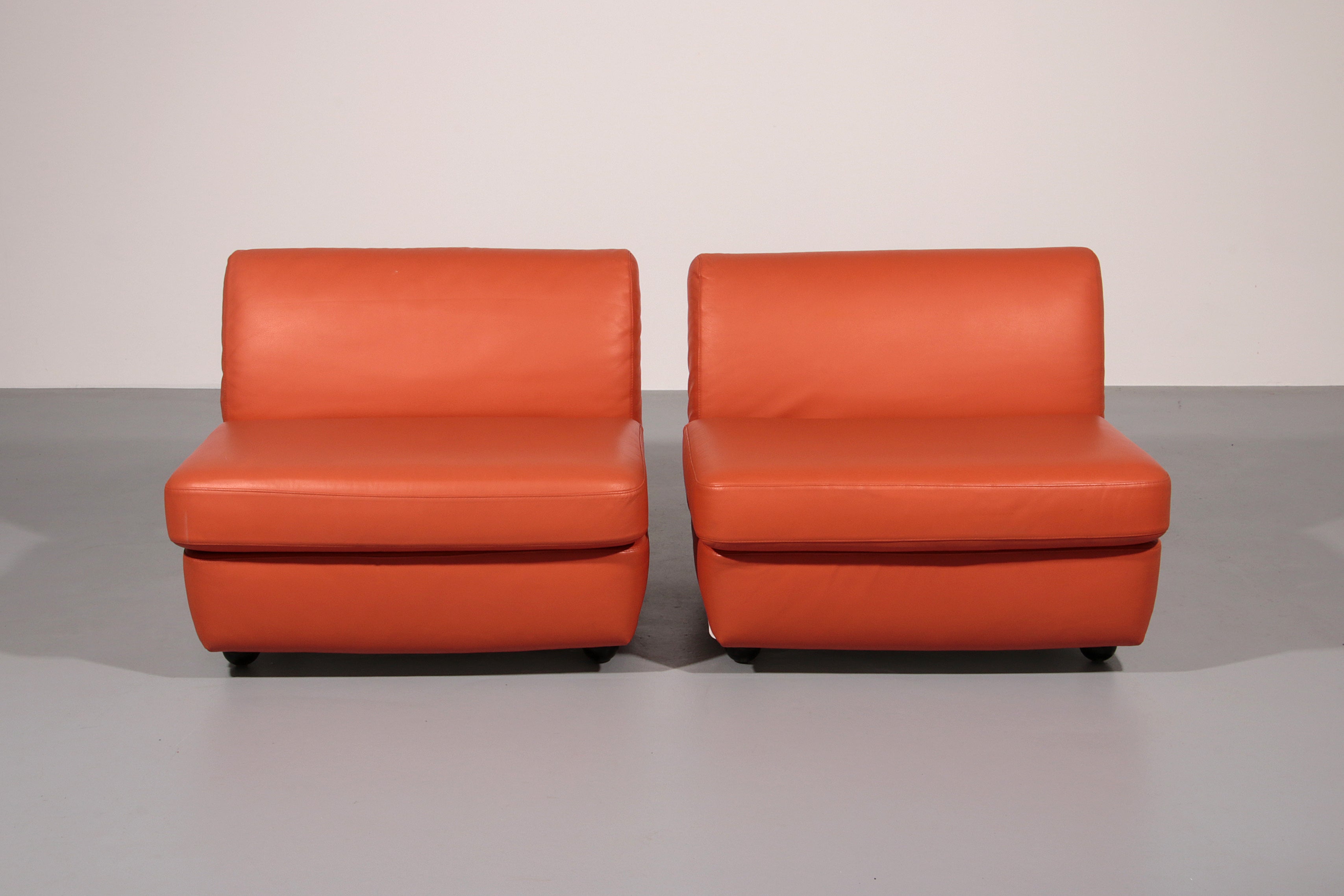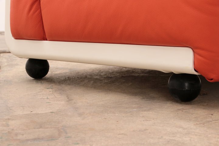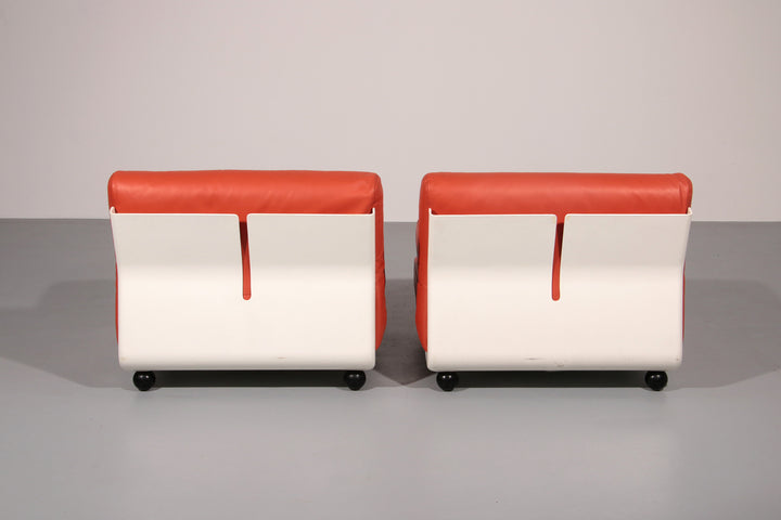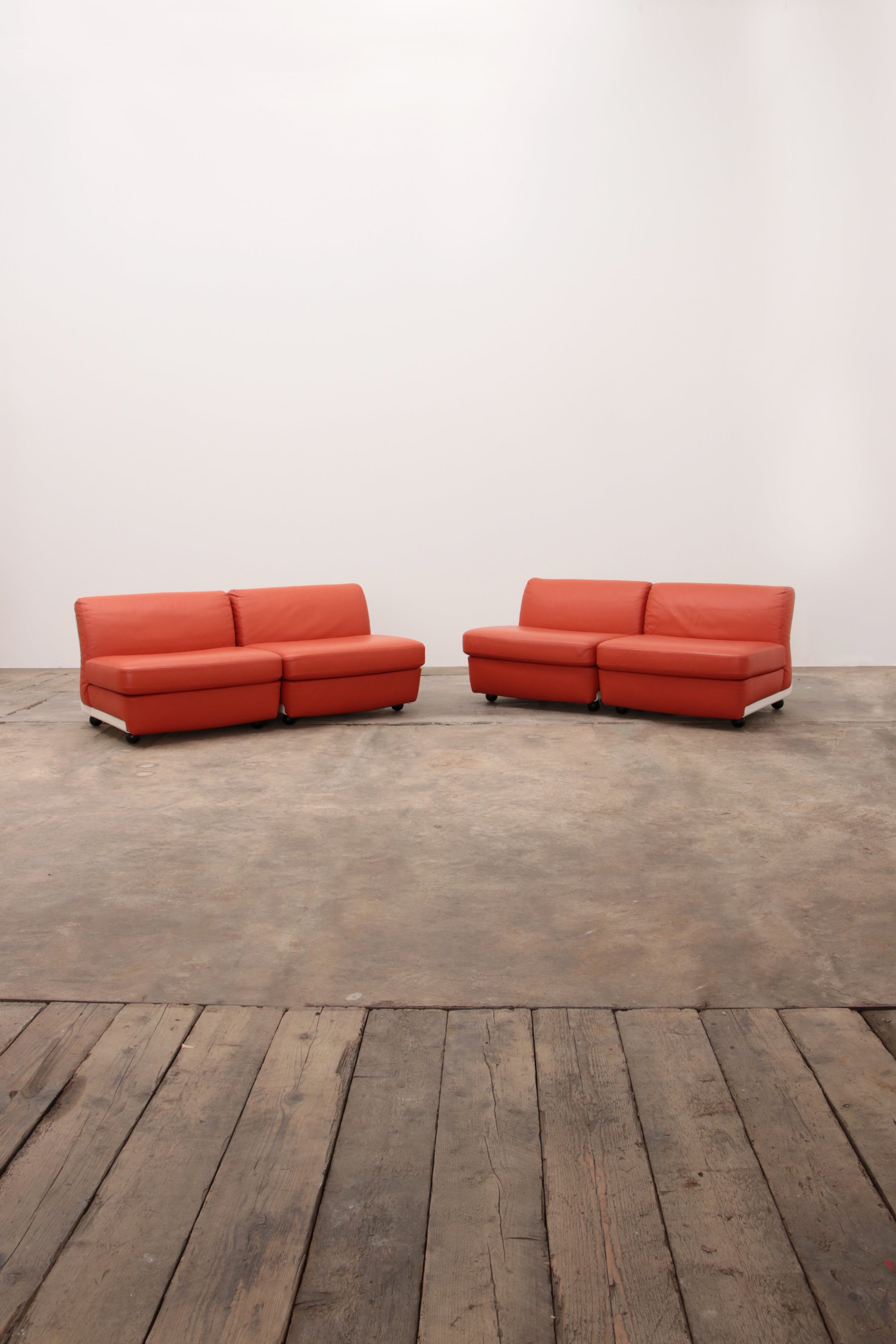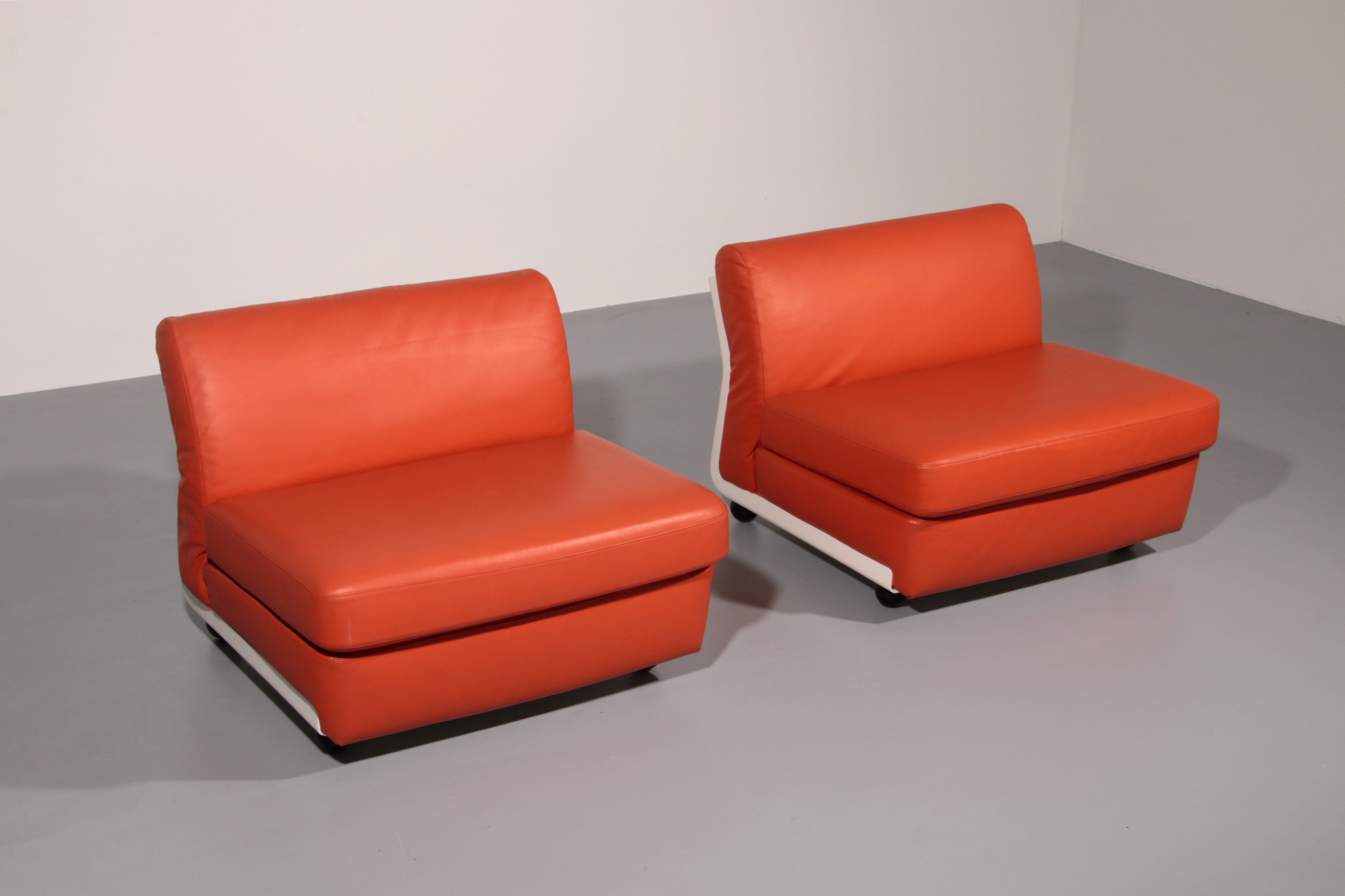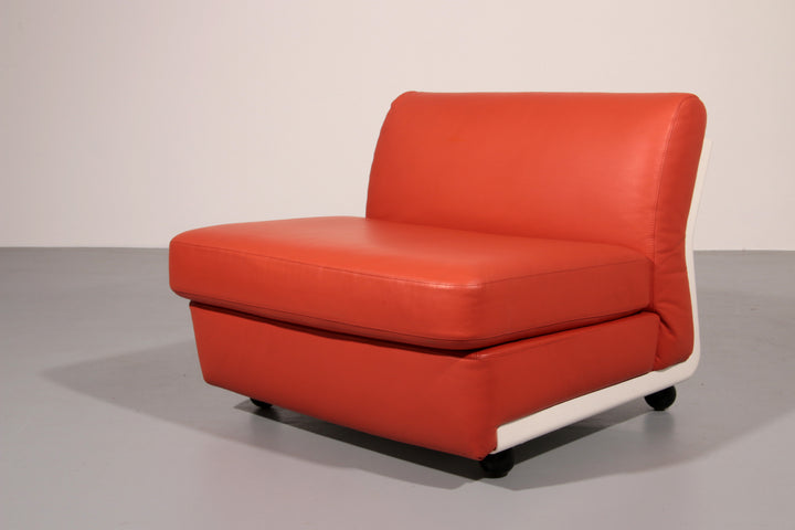 Discover the timeless elegance of the Mario Bellini Amanta modular sofa, a masterpiece from the 1960s crafted for C&B Italia. This exquisite set features four individual elements that can be effortlessly transformed into loungers or a cohesive sofa, offering versatility and style for any living space. The durable white fiberglass shells house seats upholstered in the original vibrant orange leather, showcasing a classic yet bold color combination that enhances any room's aesthetic. Ideal for spaces where traditional sofas are challenging to fit, this set is perfect for TV rooms, studies, or living areas. With minimal signs of wear, the fiberglass shells and seating remain in excellent condition, promising both comfort and durability.