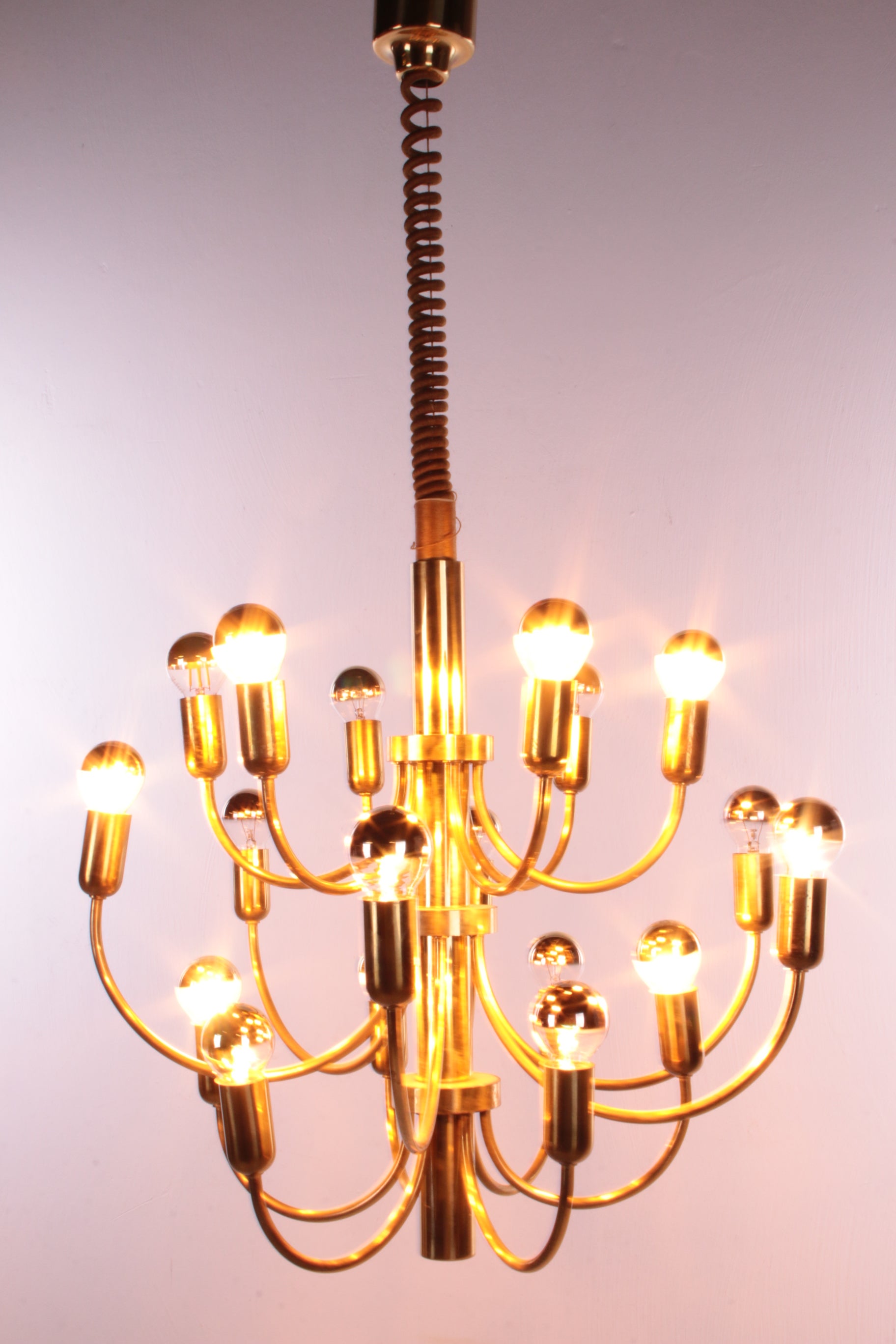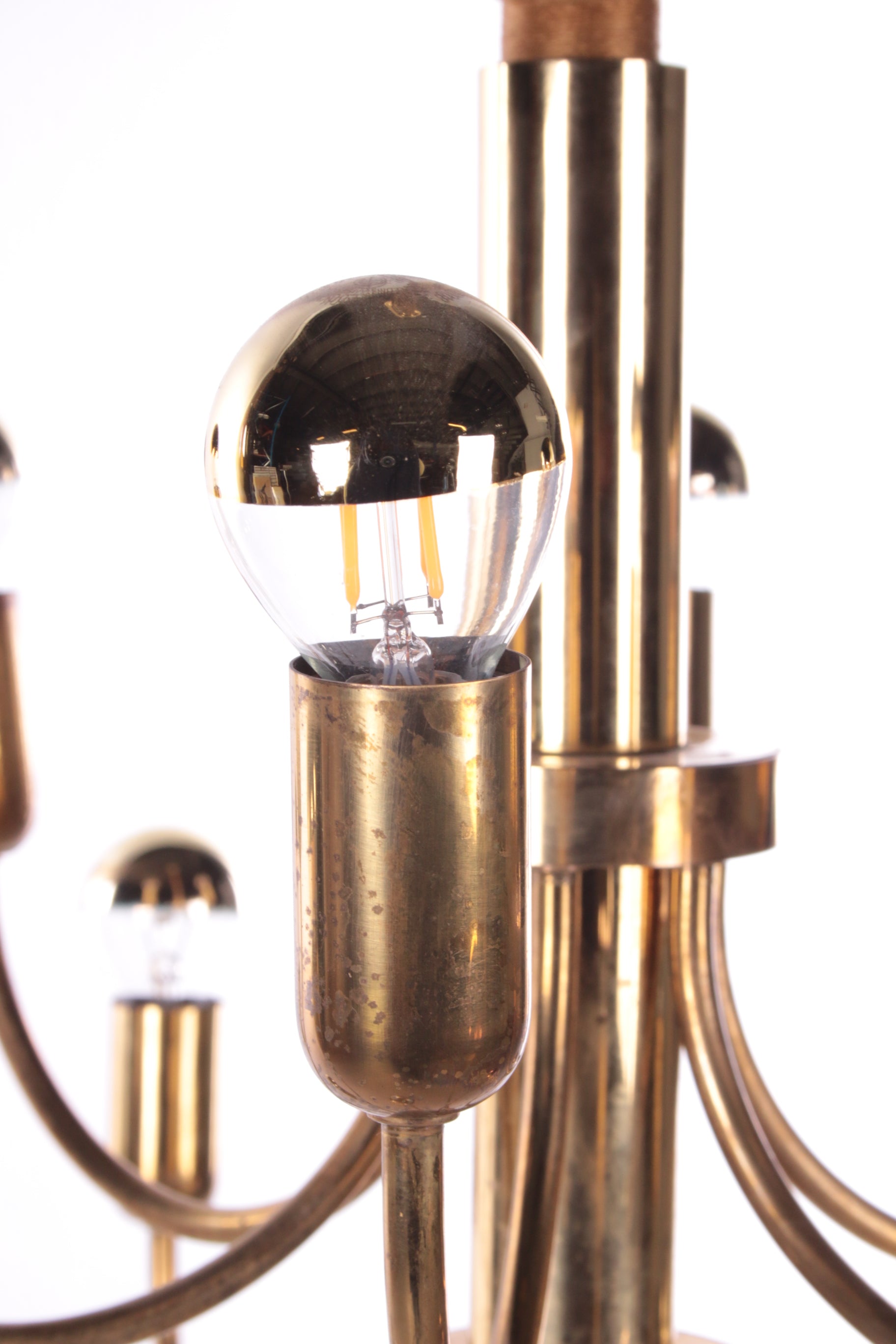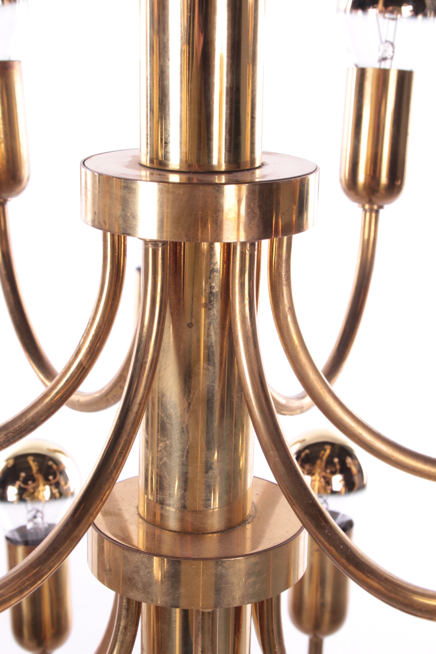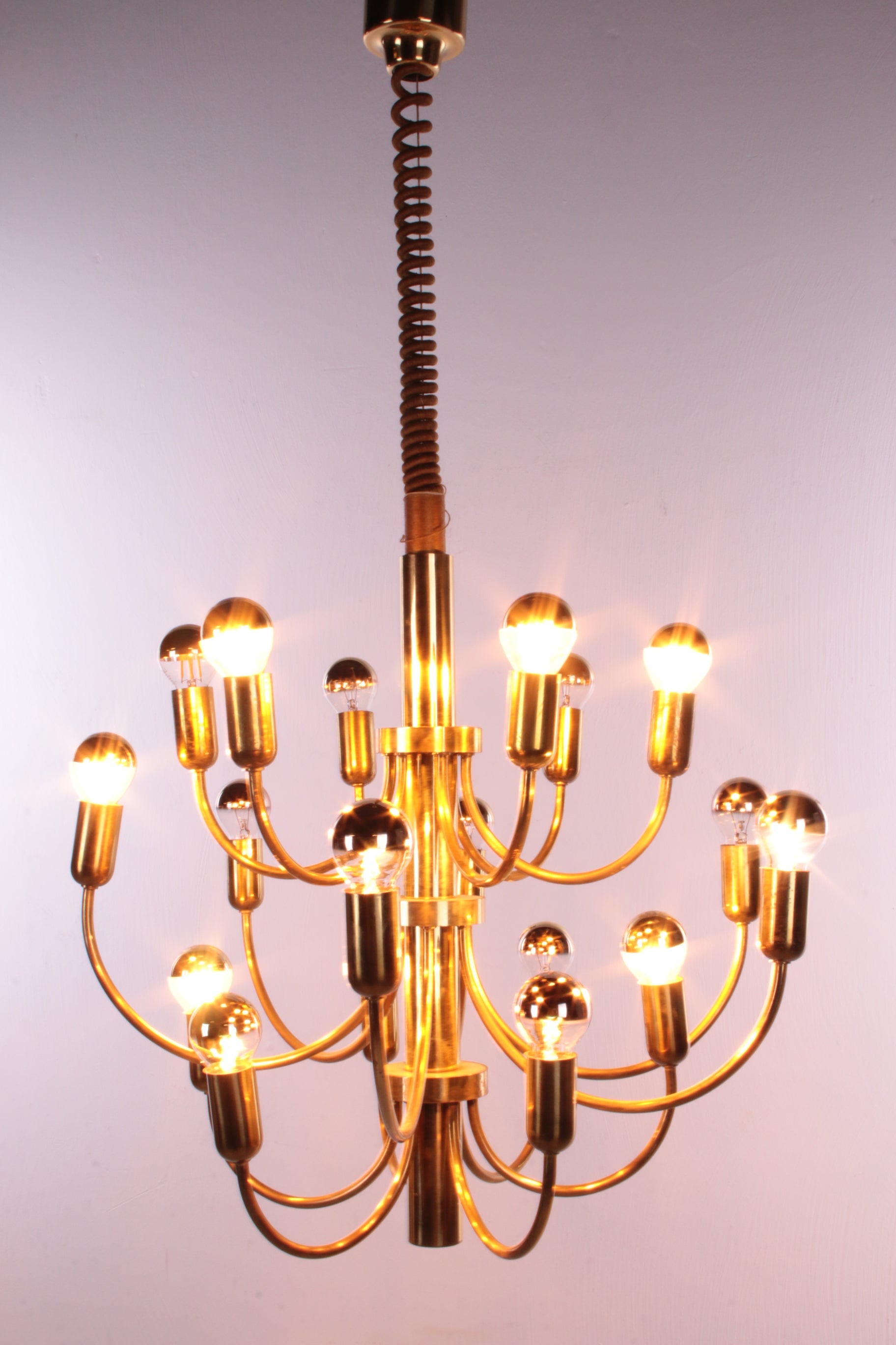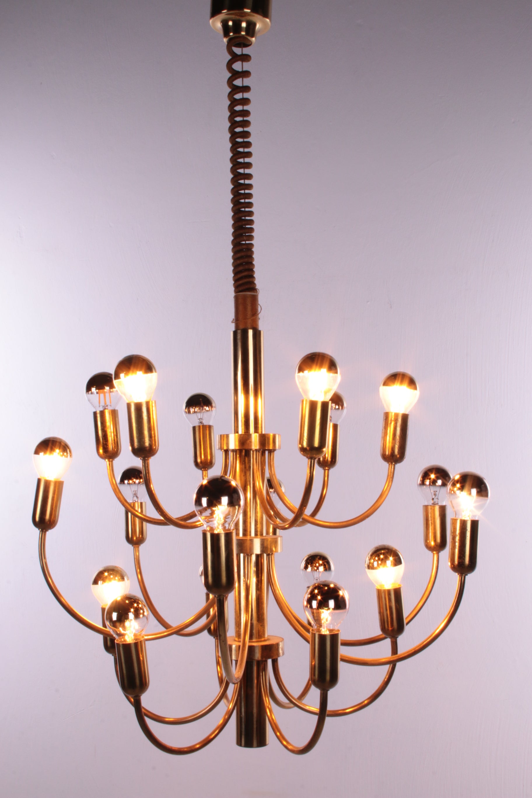 A Hollywood Regency chandelier with 18 polished brass arms, concentric tubular rows, and a nature-inspired design. Fully rewired and ready to enhance your space with timeless elegance.