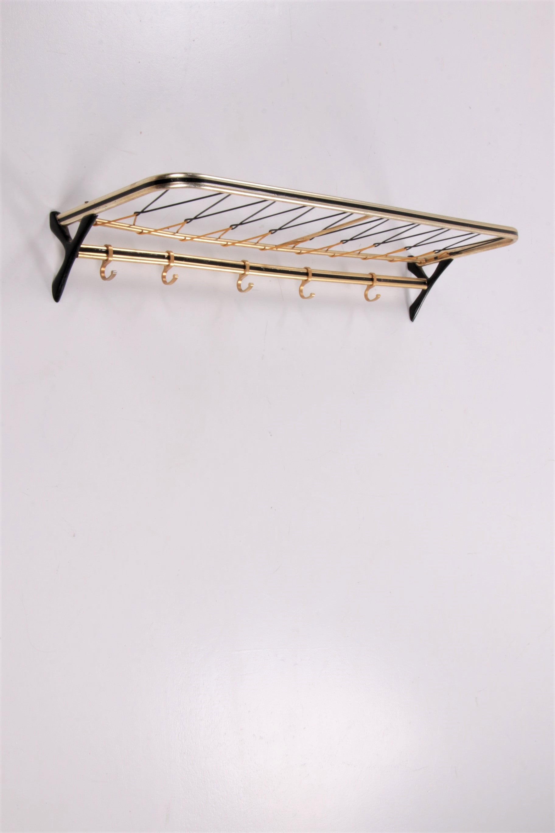 This stunning gold-colored aluminum wall coat rack, crafted in Germany during the 1960s, embodies the elegance of Hollywood Regency style. Featuring an additional rack beneath the top, it offers both functionality and vintage charm. With its beautiful hooks and hat rack, this timeless piece adds a touch of glamour to any room. The slight signs of aging, such as subtle discoloration, only add to its character, reflecting the passage of time.
