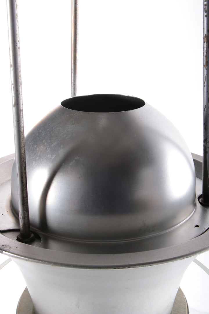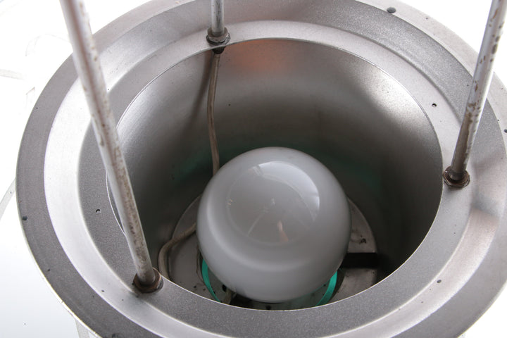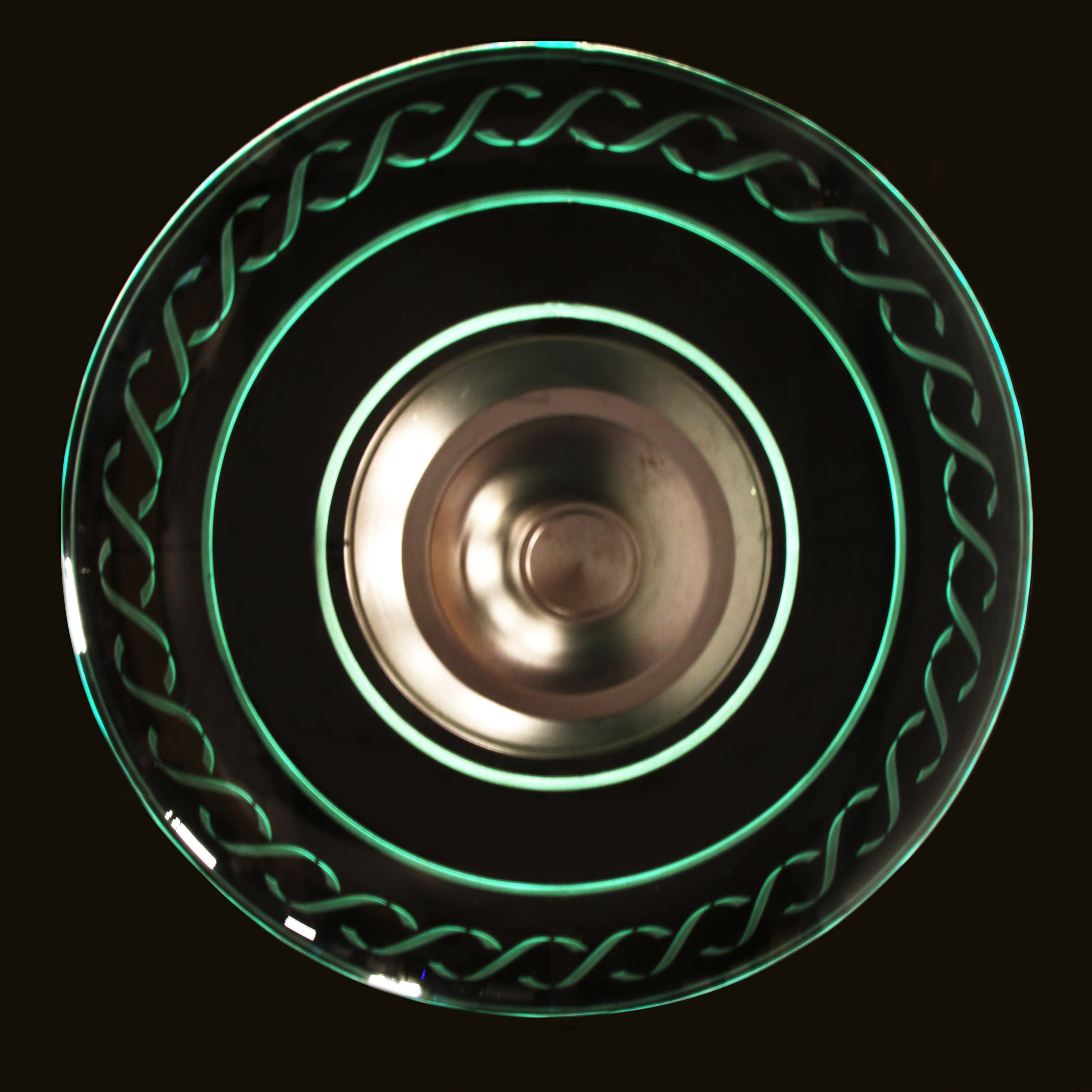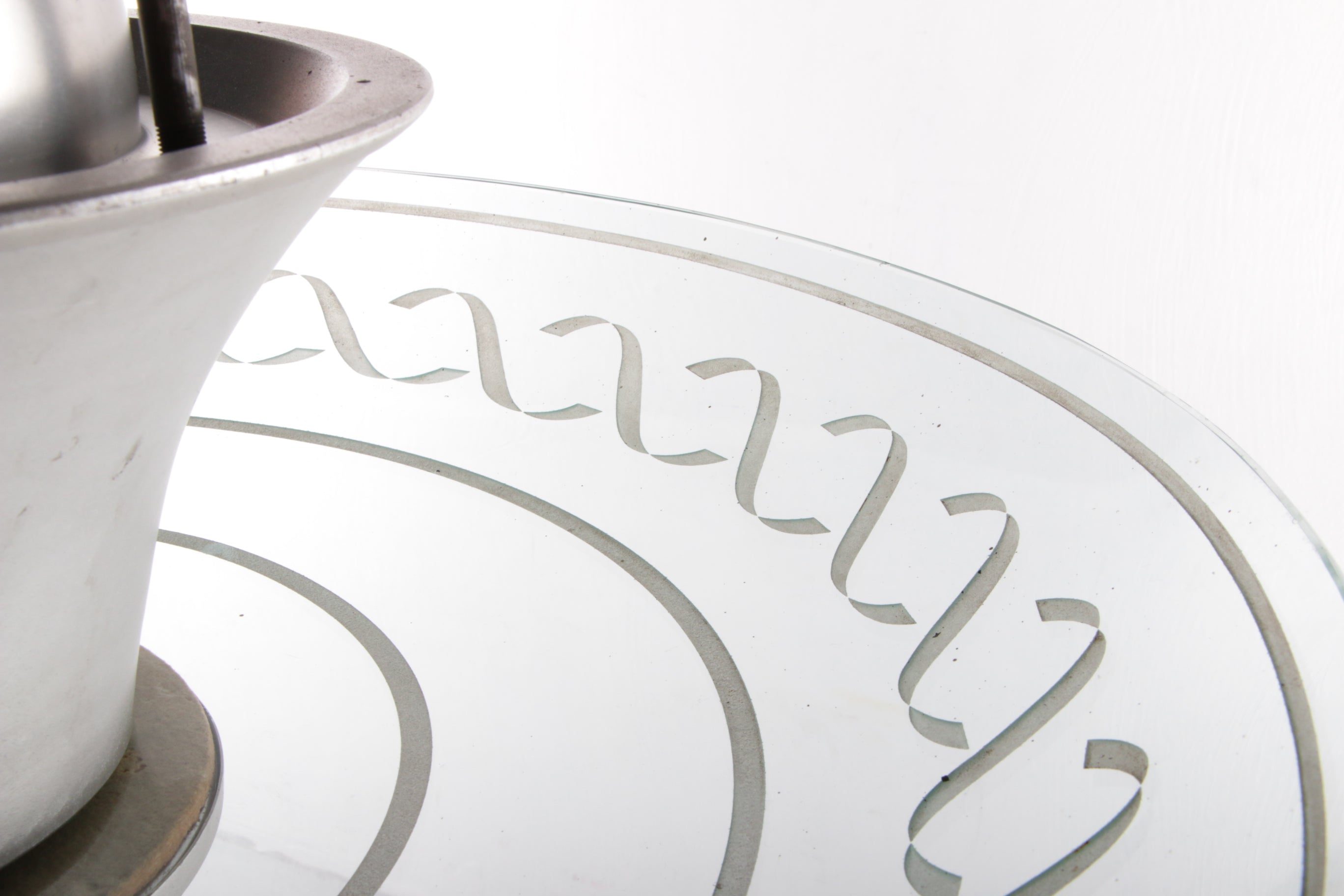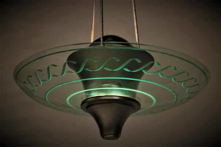 Crafted from aluminum, each lamp features an elegant design with a glass shade that is intricately cut, showcasing a beautiful decorative pattern. The unique glass work allows a soft green light to shine through, creating a captivating ambiance. The metal tubes supporting the lamps add to their sturdy yet stylish appearance.