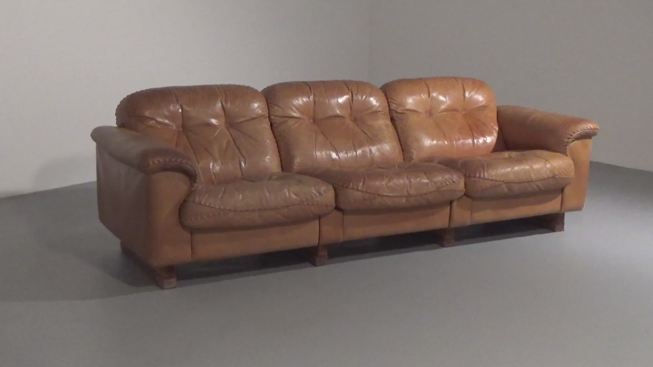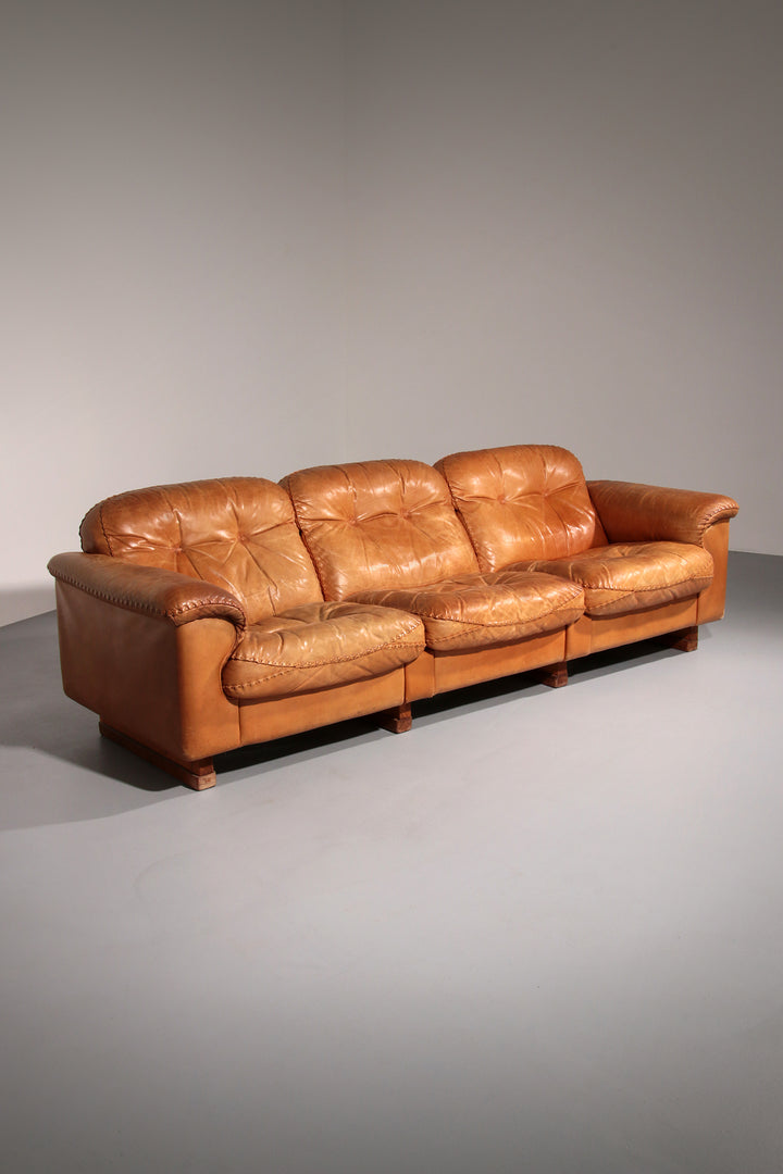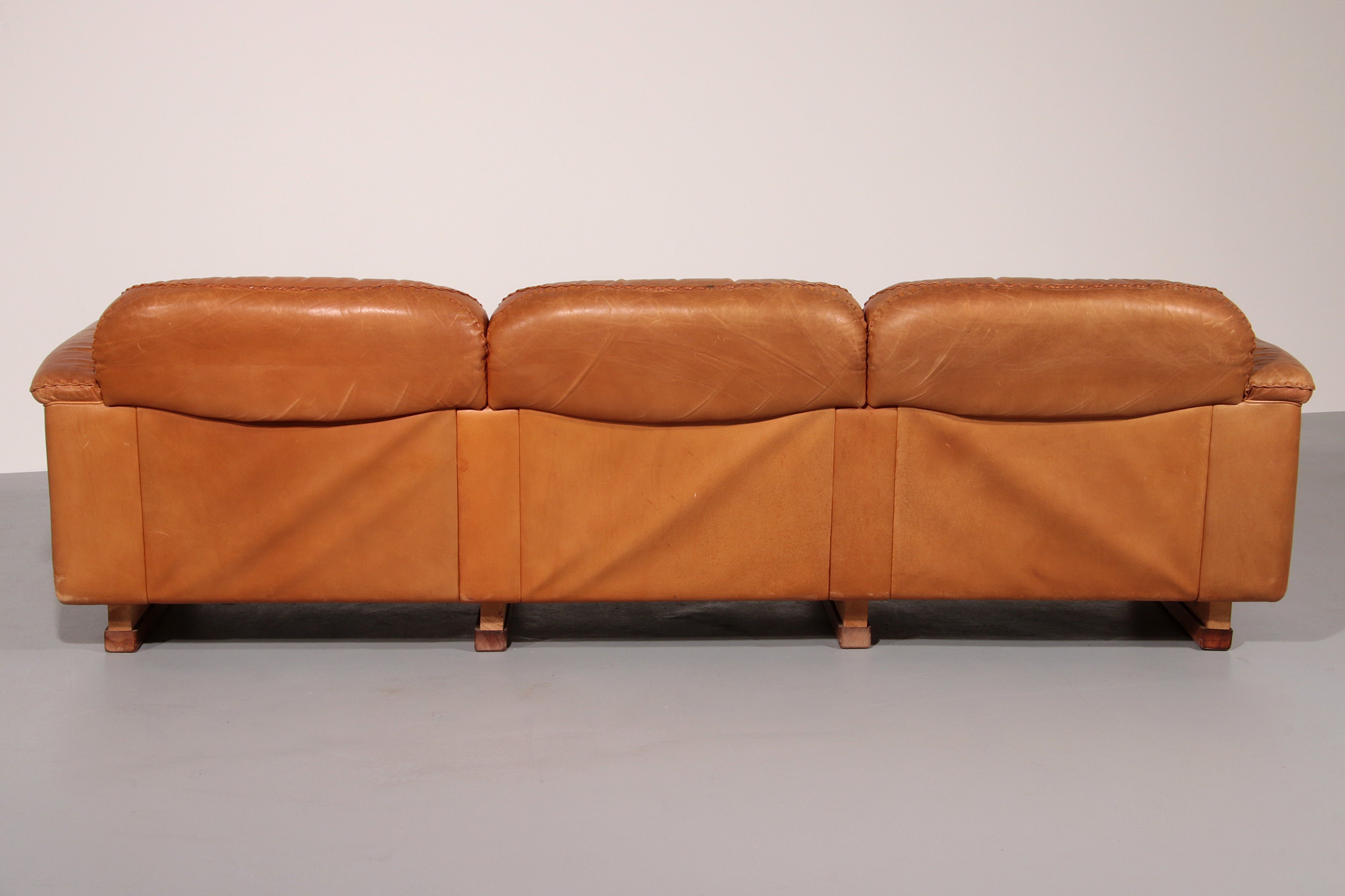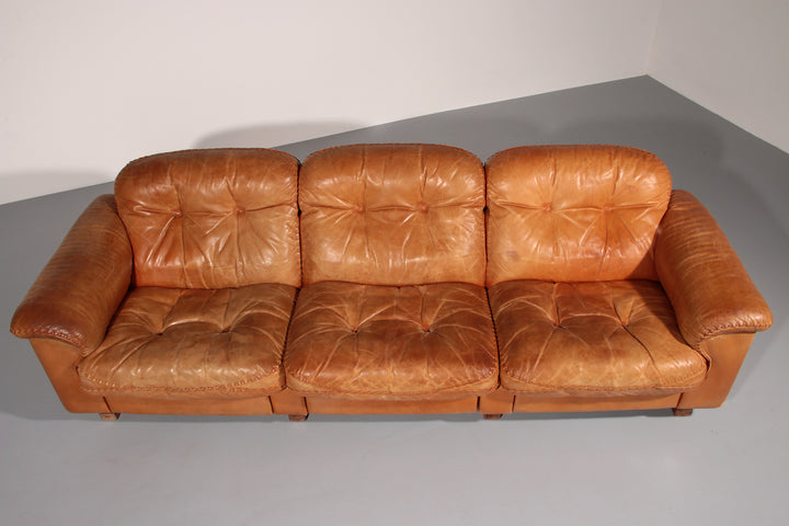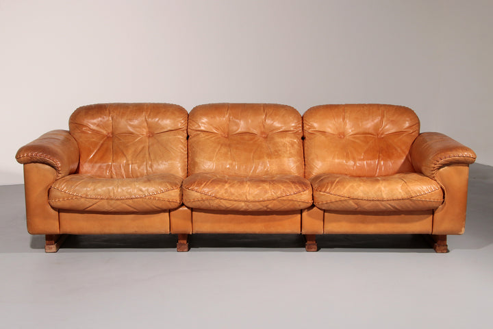 De Sede DS101 three seater in cognac leather This high-quality comfort three-seater, designed for De Sede in the 1970s, features extendable individual seats perfect for lounging. Upholstered in rich cognac leather, the sofa boasts a beautiful patina that adds to its unique charm. The hand-stitched seams and cognac leather detailing make the DS101 model truly special. With its luxurious design and craftsmanship, it combines timeless appeal with functional versatility. The item shows minor signs of wear, consistent with age and use, reflecting its history and enduring quality.