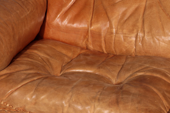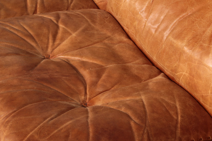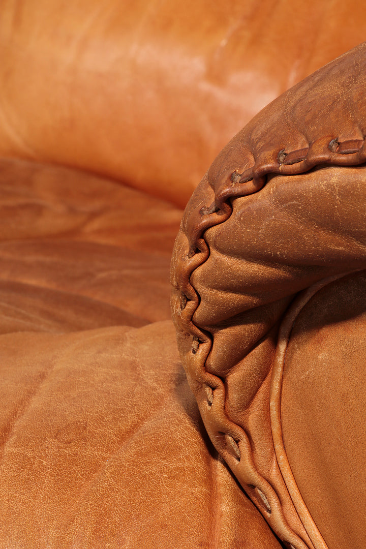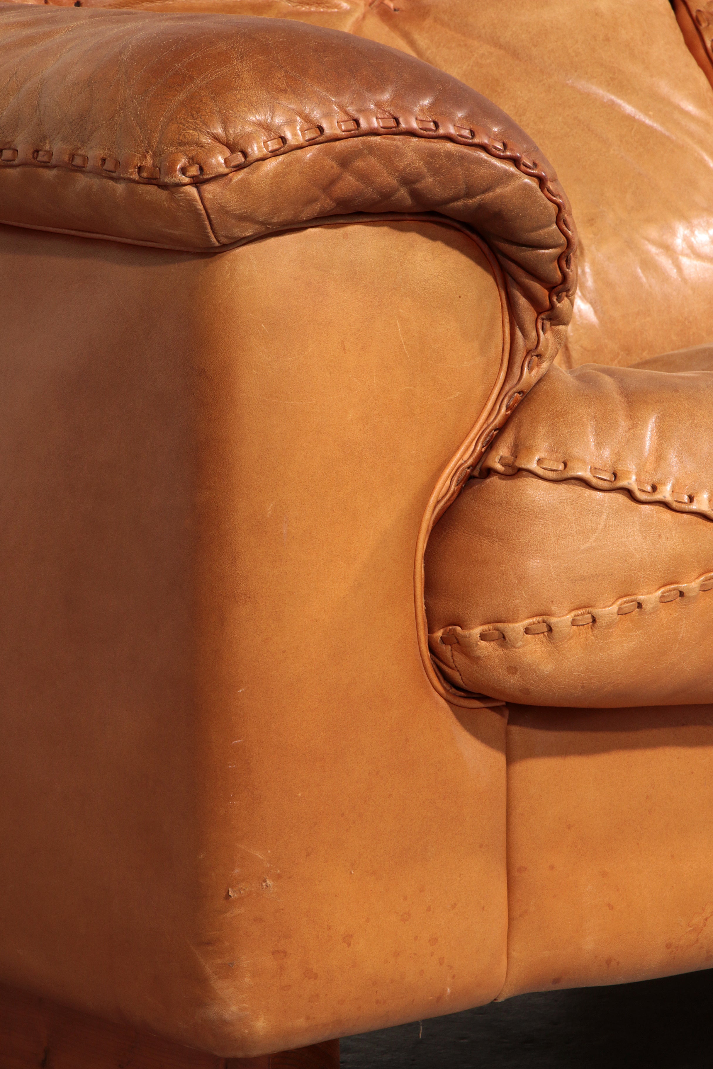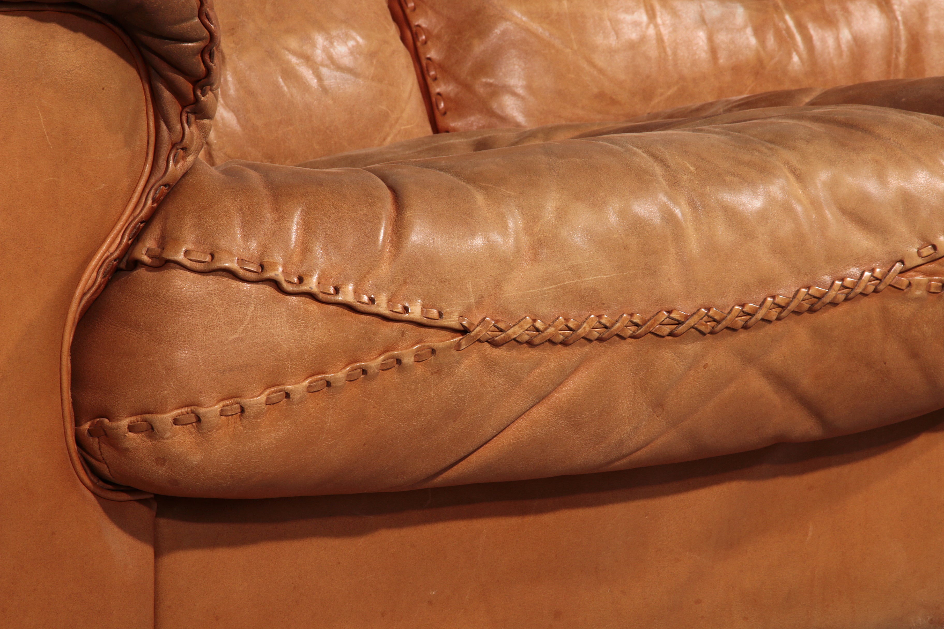 De Sede DS101 three seater in cognac leather This high-quality comfort three-seater, designed for De Sede in the 1970s, features extendable individual seats perfect for lounging. Upholstered in rich cognac leather, the sofa boasts a beautiful patina that adds to its unique charm. The hand-stitched seams and cognac leather detailing make the DS101 model truly special. With its luxurious design and craftsmanship, it combines timeless appeal with functional versatility. The item shows minor signs of wear, consistent with age and use, reflecting its history and enduring quality.