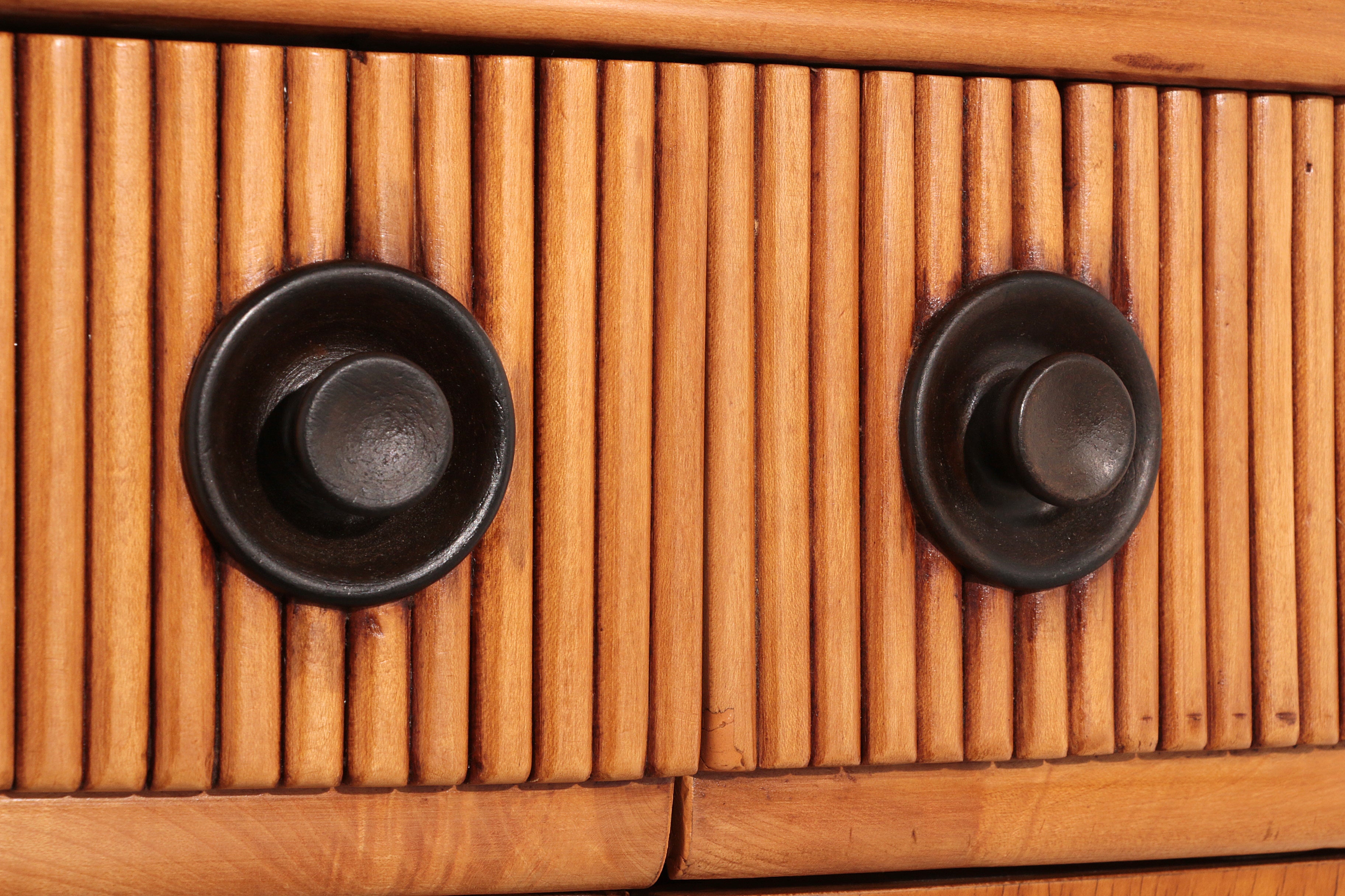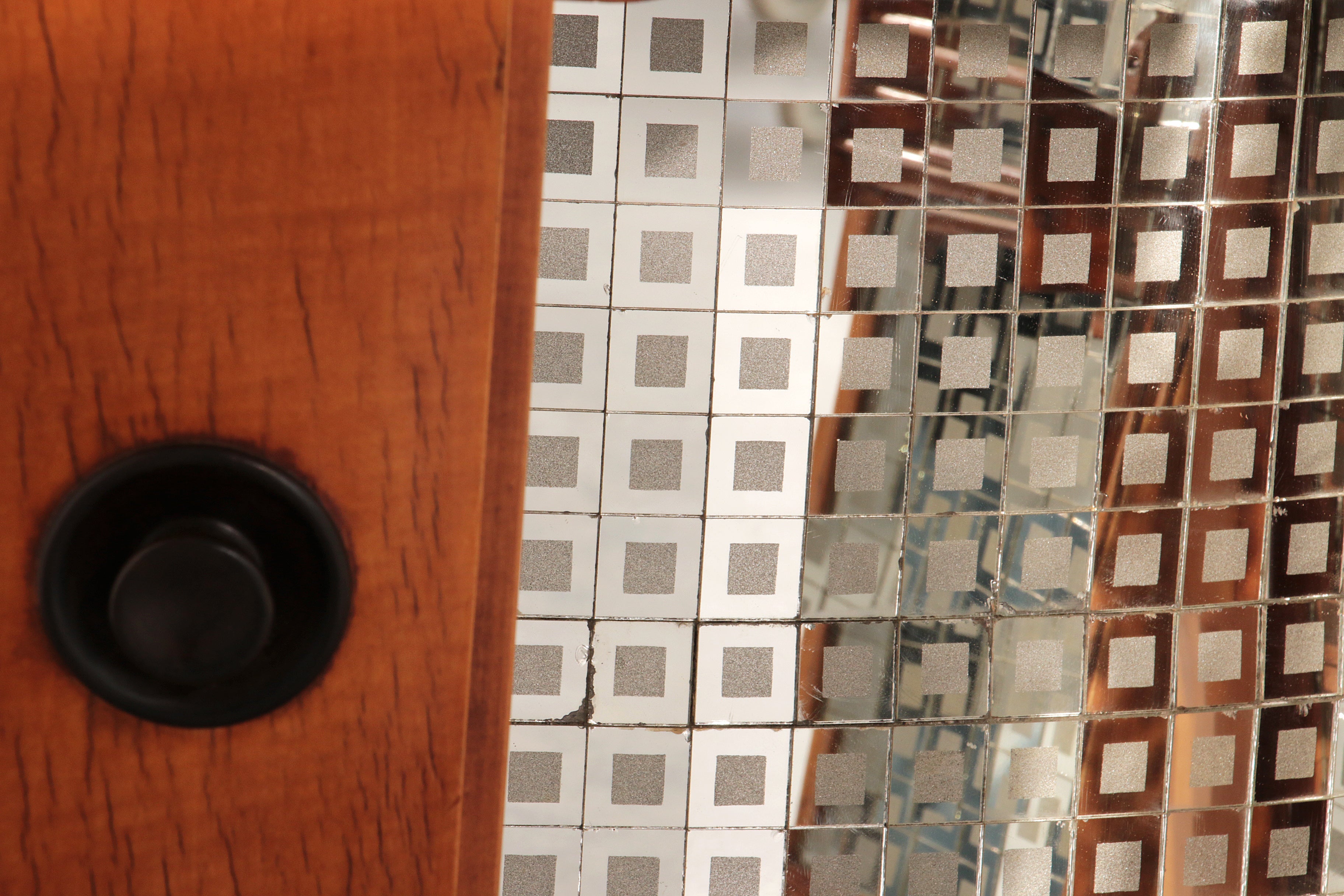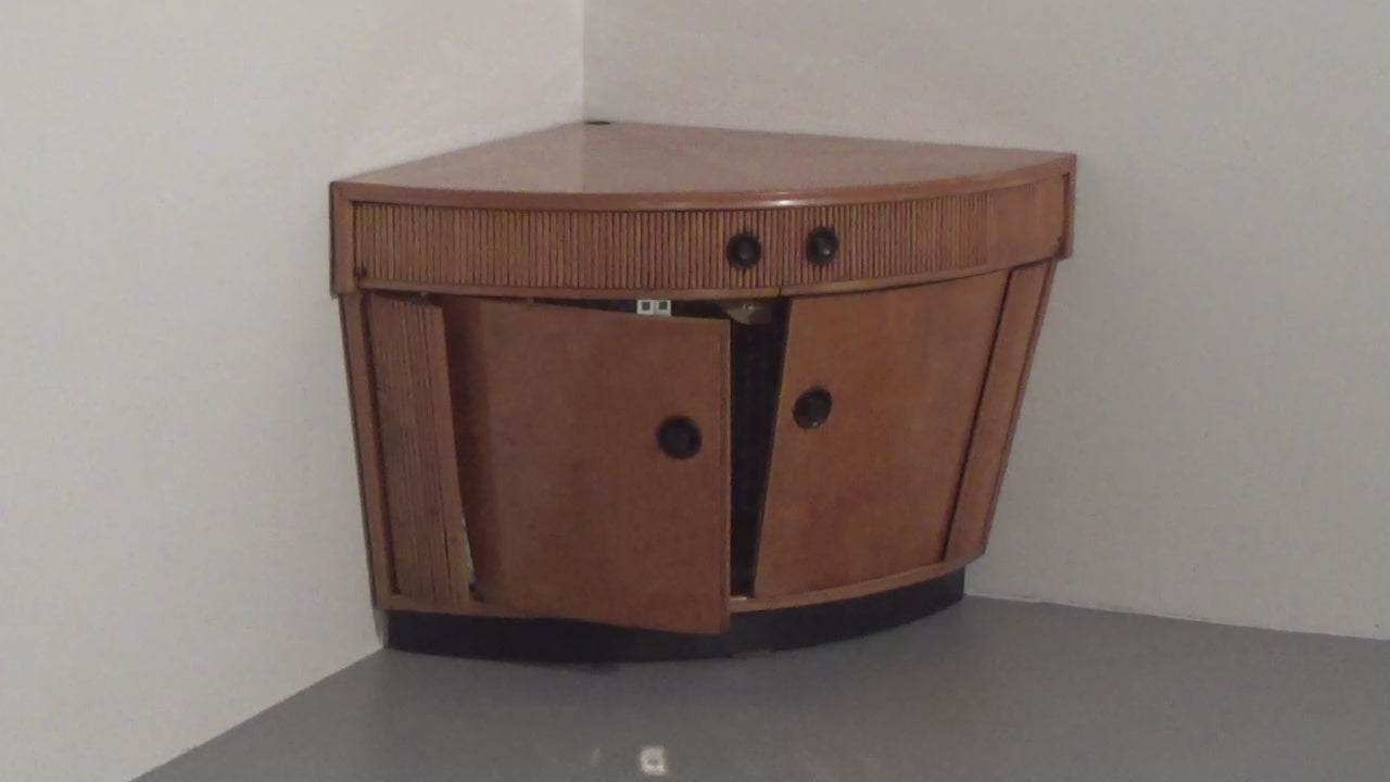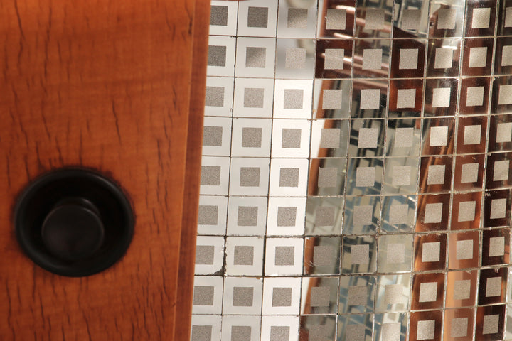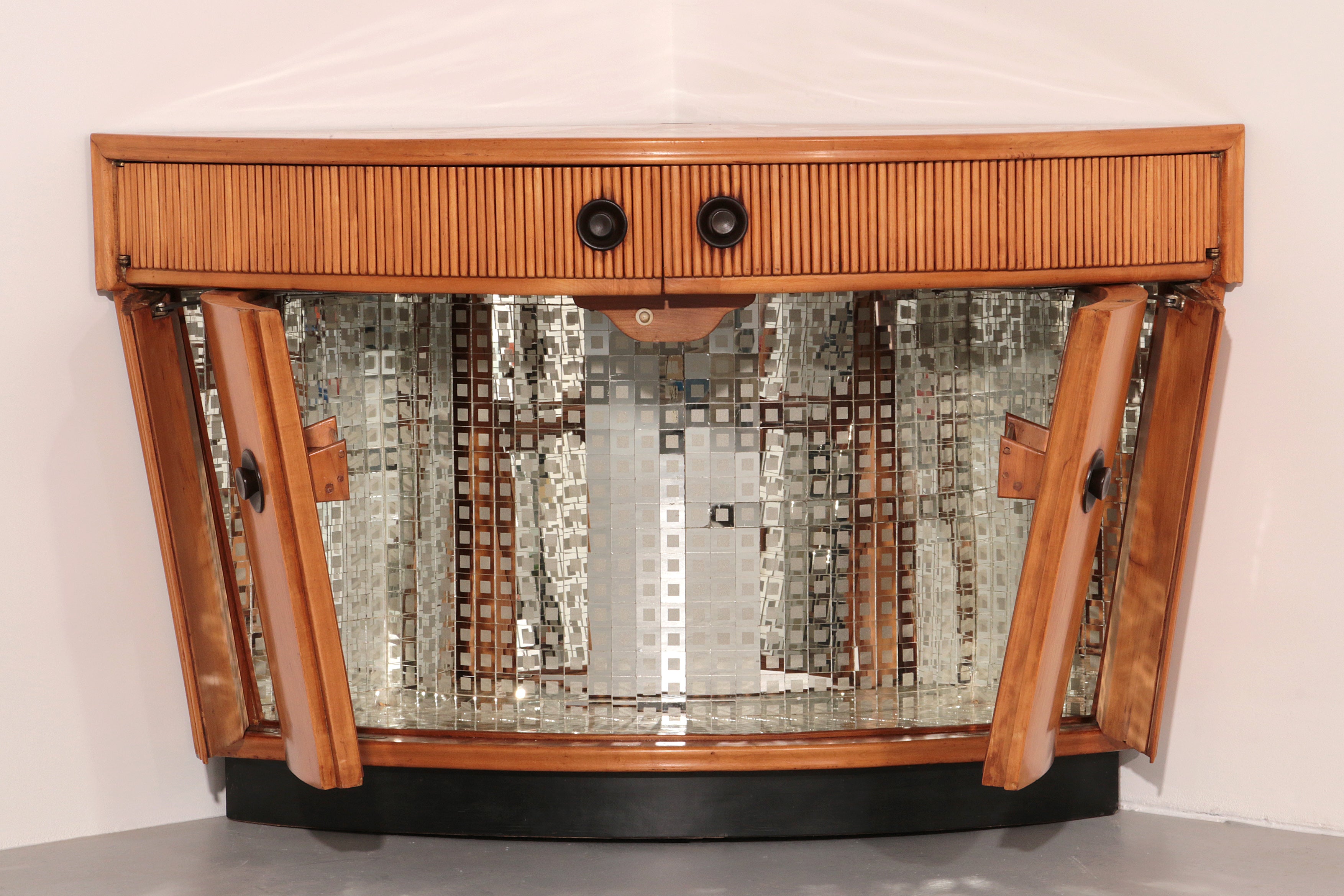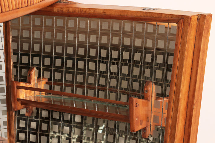 This rare Grissinato Bar Cabinet in light wood, attributed to Paolo Buffa and dating from the 1940s, is an exquisite example of Italian Art Deco elegance. The exterior displays refined craftsmanship and a timeless silhouette, while the interior reveals a dazzling surprise: a mosaic of small mirrors that reflect bottles and glassware, creating a luxurious ambiance when the cabinet is opened. Designed as both a functional bar and a statement piece, it elevates any living space into a refined lounge. At the top corner, a discreet round opening remains from its original wiring for integrated lighting, a subtle reminder of the innovative design solutions of its era. This cabinet is more than furniture; it is a piece of history, embodying the sophistication and glamour of mid-20th century Italian design.