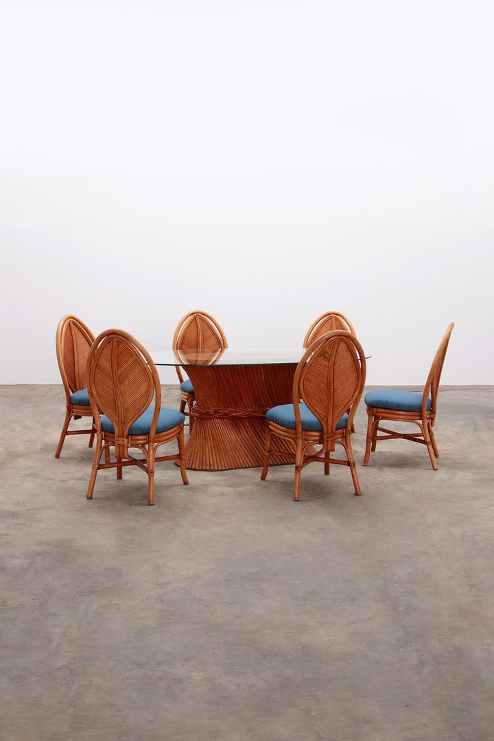 Elevate your dining experience with the Bohemian Bamboo McGuire Dining Set, a stunning vintage ensemble from 1960s France. This set includes an oval bamboo dining table topped with a pristine glass surface, complemented by six beautifully reupholstered palm leaf-inspired chairs. The chairs, featuring a striking blue fabric, offer a delightful contrast to the organic bamboo frames, which are intricately bound with leather ribbons for added charm. Despite its vintage origins, the set remains in excellent condition, promising both style and comfort for your dining space. Enjoy memorable meals and conversations around this unique piece of art that seamlessly blends elegance with a touch of nature.