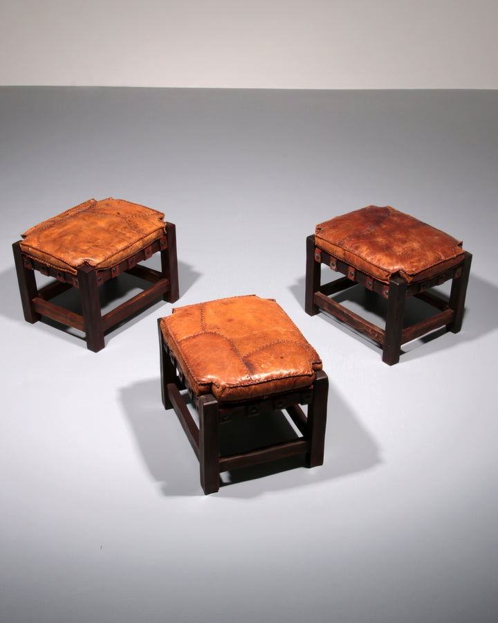Braziliaanse Brutalistische voetenbankjes met patchwork leer,1960Braziliaanse Brutalistische voetenbankjes Timeless-art.com