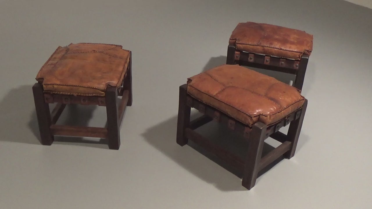 These unique Brazilian brutalist ottomans from the 1960s were designed by a group of young Brazilian designers known for their innovative, relaxed approach to mid-century furniture. The solid wood frame supports a thick leather sling seat, hand-stitched with gaucho-style leather laces. Inspired by designers like Jean Gillon and Sergio Rodrigues, these ottomans offer both style and comfort. Though the cushions have come loose on the underside, as seen in the photos, they remain charming, especially when placed side by side to form a bench.