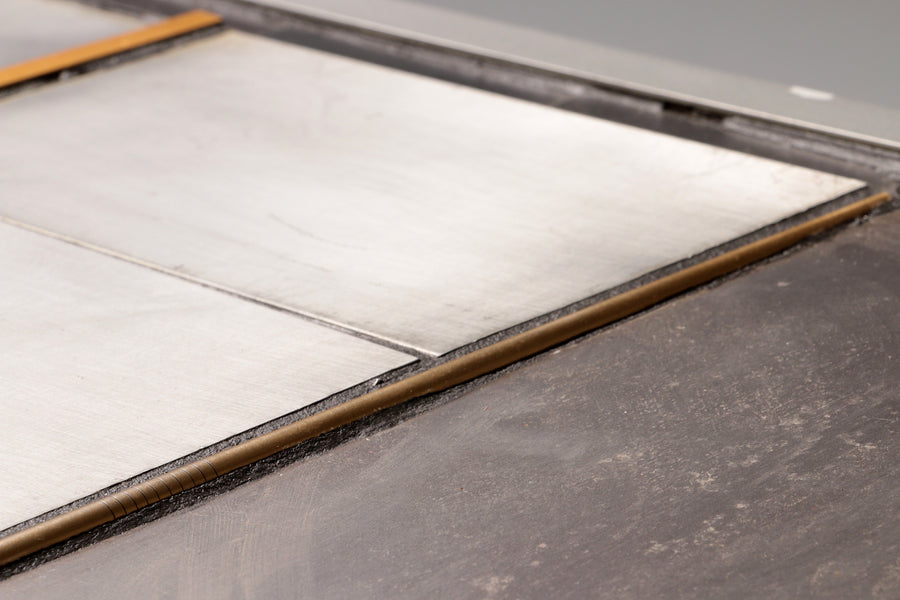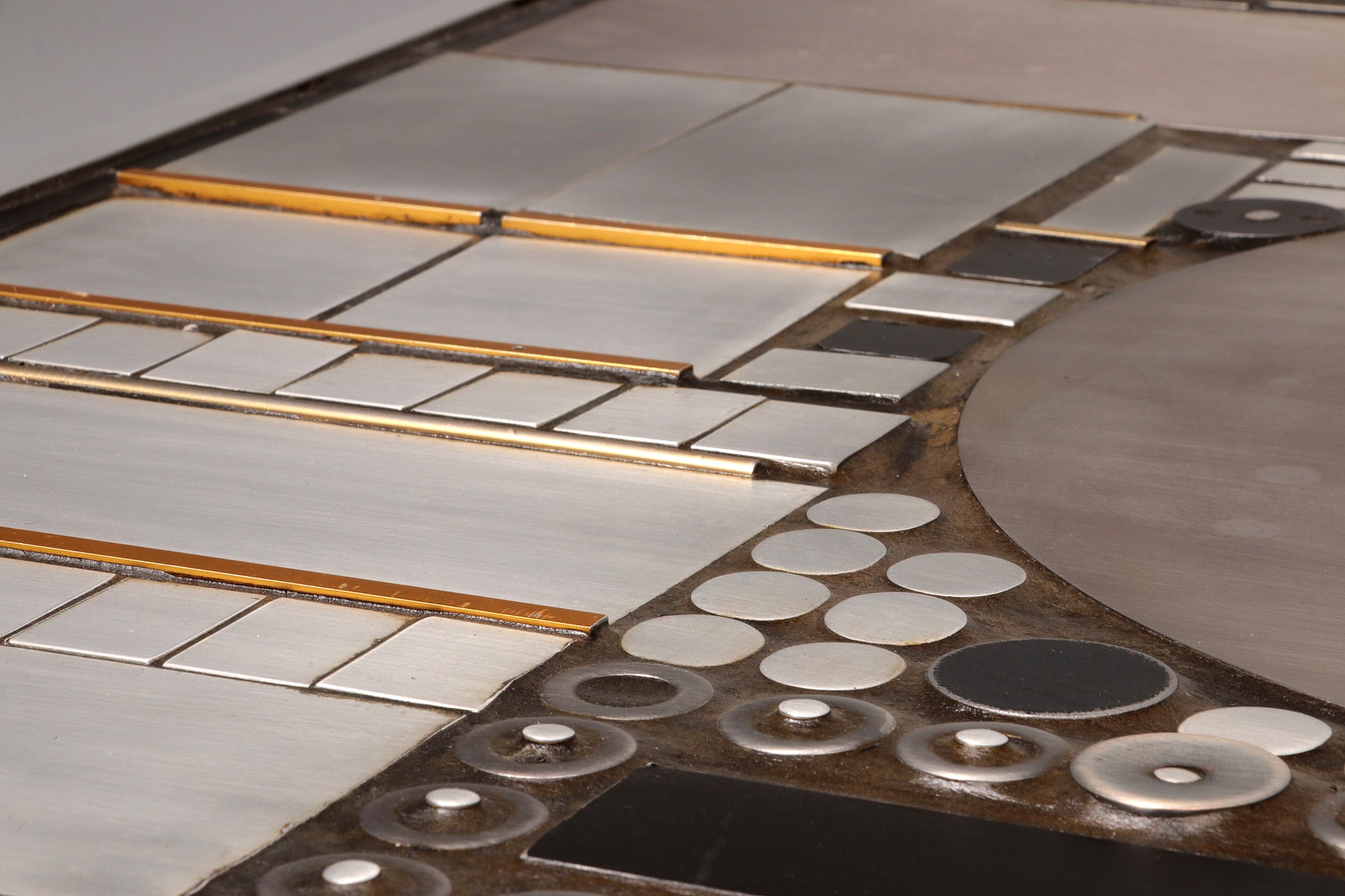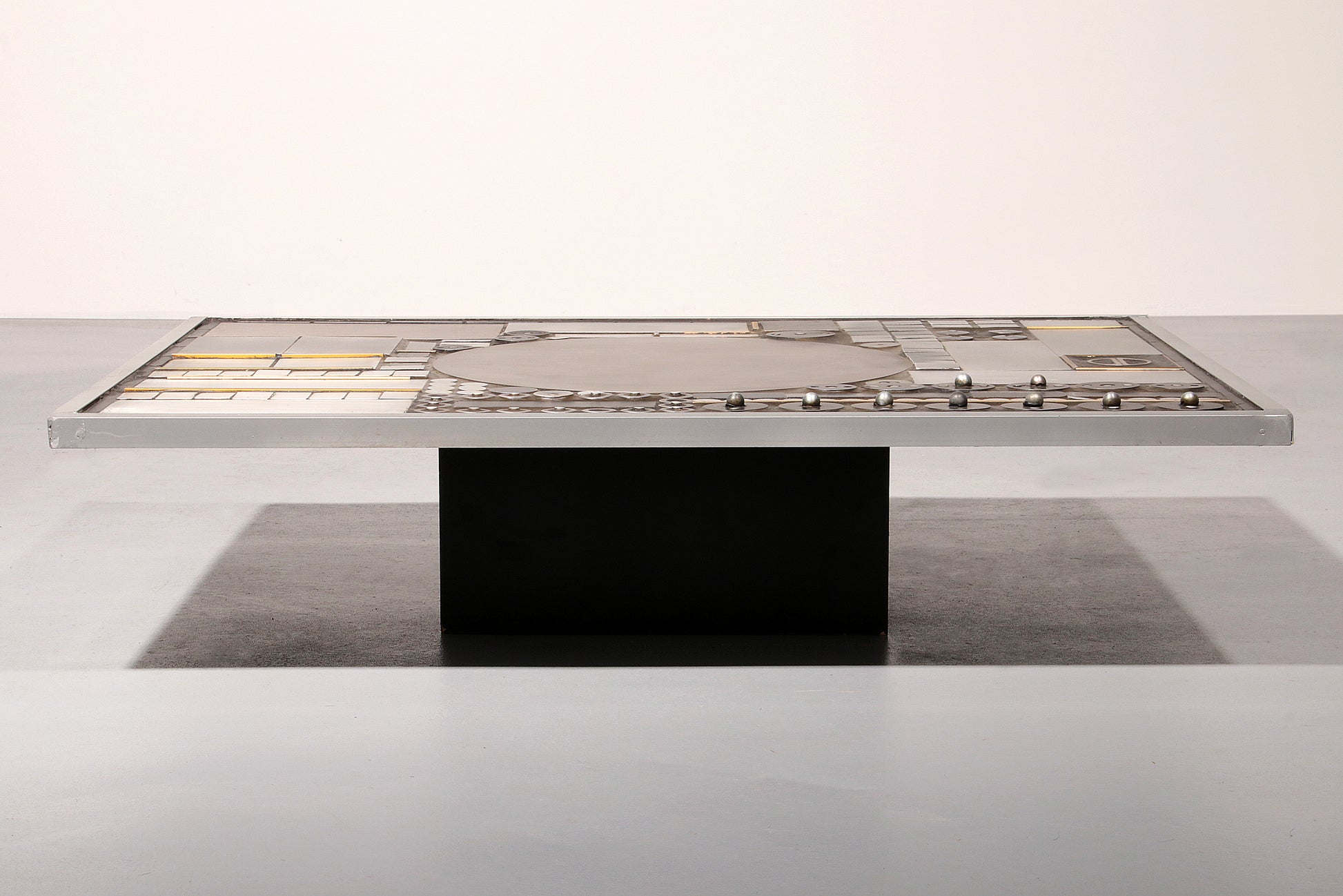 A rare Belgian mid-century art coffee table by Verjans featuring a sculptural top made from layered aluminum and brass forms. A monumental and highly collectible work that merges artistry with functional design.