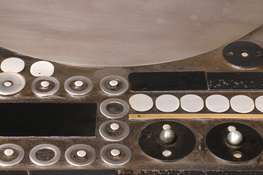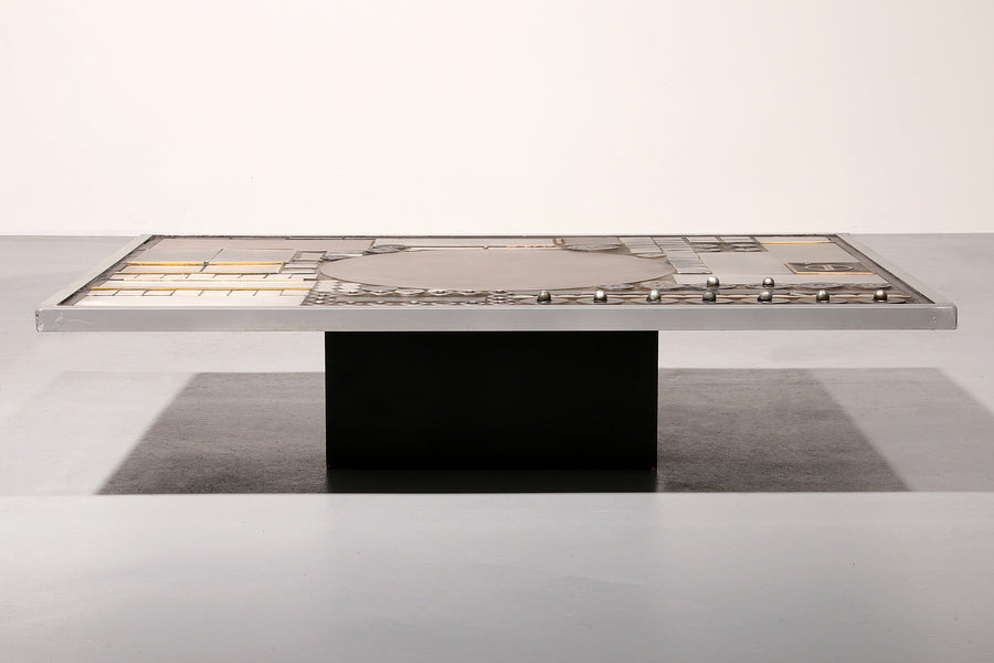 This exceptional coffee table by Belgian artist Raf Verjans is far more than a piece of furniture; it is a sculptural statement that transforms any interior into a gallery-like environment. The top is composed of multiple aluminum and brass elements, each varying in form and height, creating an architectural landscape that captures and reflects light in a striking way. Every angle reveals a new composition, a new play of shadows and materials, making the table a living artwork within the room. This rare mid-century piece embodies the bold experimentation of Belgian art furniture from the period, standing proudly between sculpture and function. It is an iconic, monumental object that defines a space with its presence and enriches any collection with its unmistakable character.