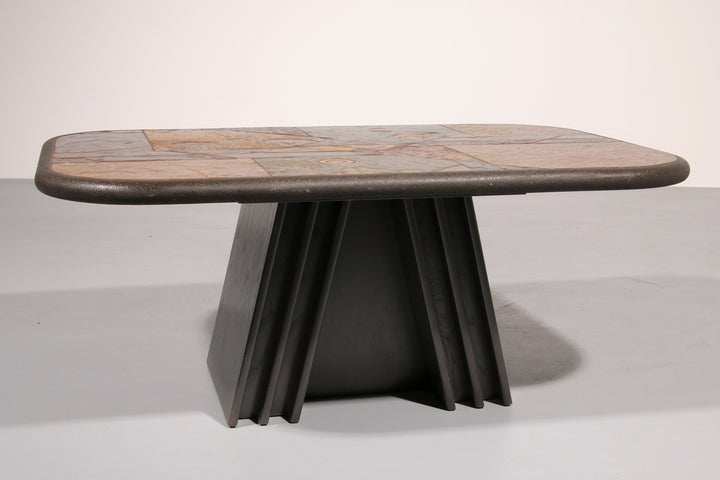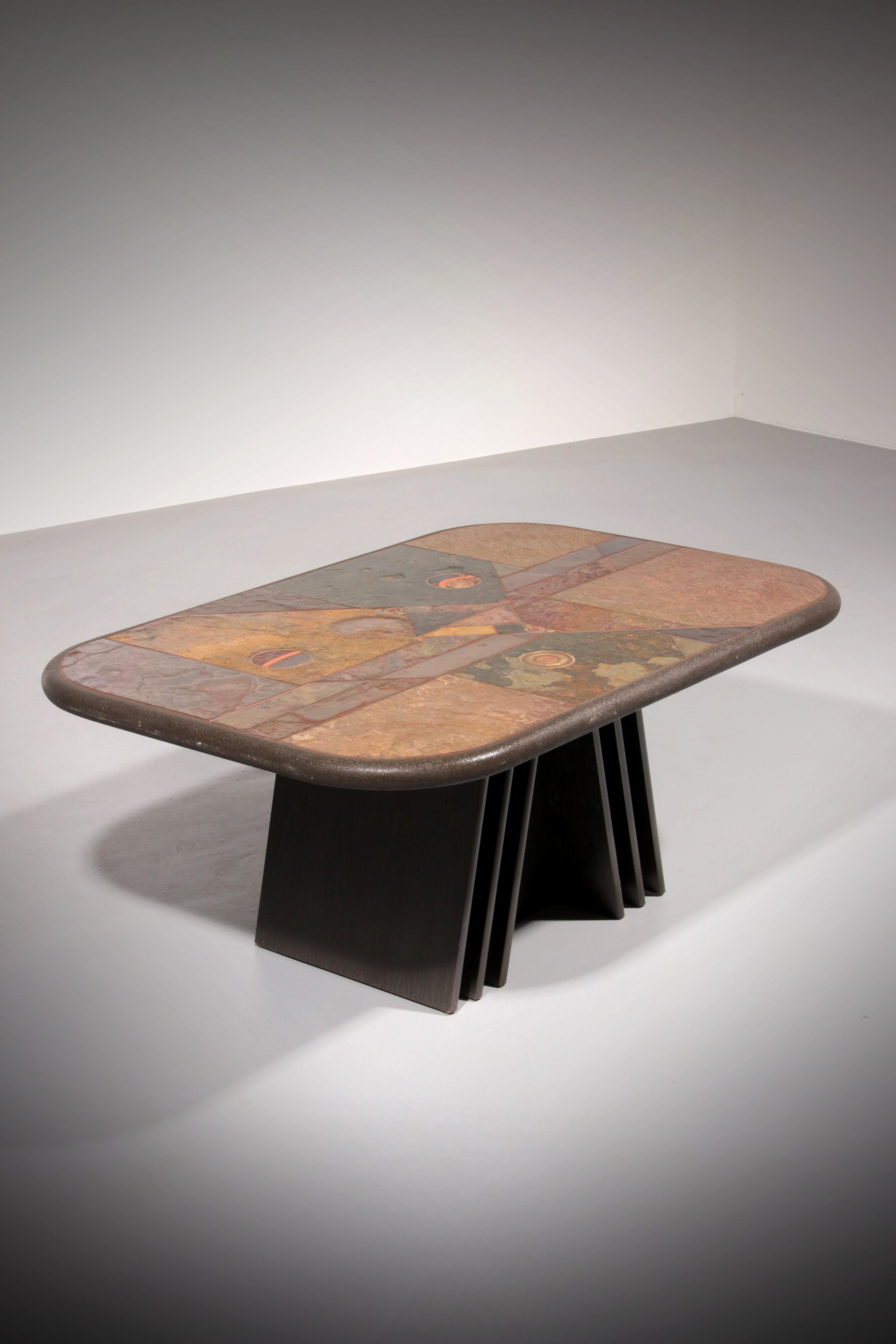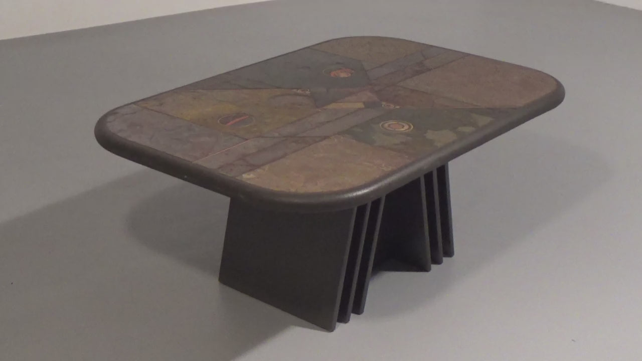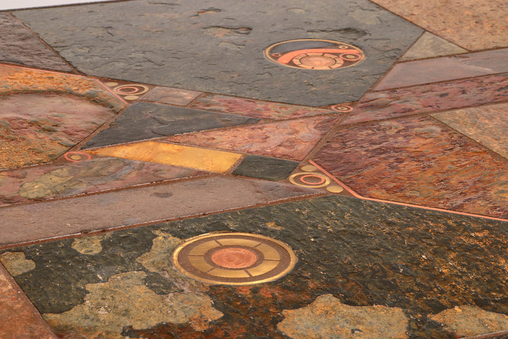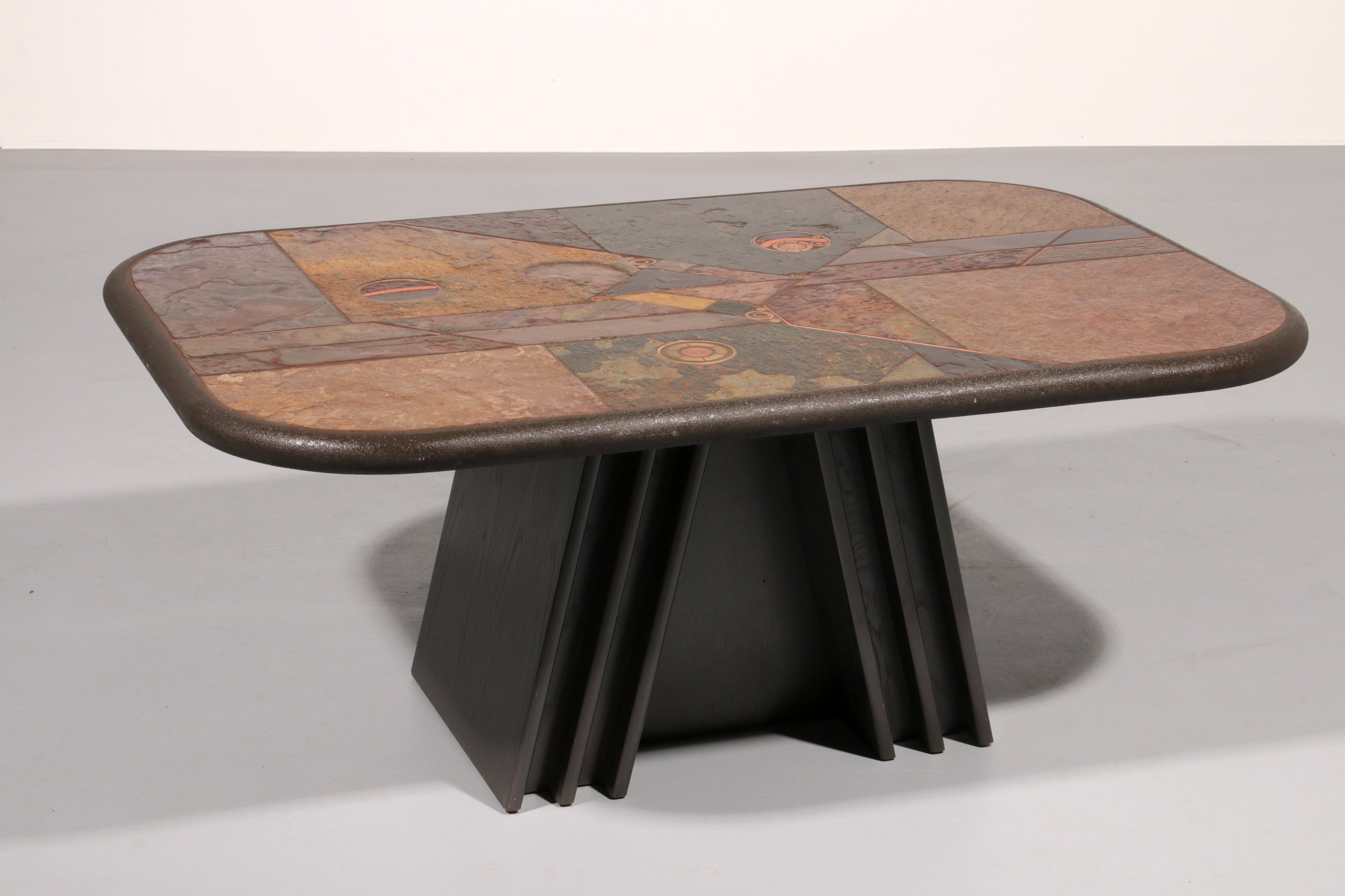 A beautifully crafted stone coffee table inspired by the style of Paul Kingma. The tabletop showcases a striking mosaic of natural stone, accented with brass and embedded coins that add character and uniqueness. The piece rests on a solid hexagonal stone base, offering both sculptural appeal and stability. In good vintage condition and an eye-catching addition to any modern eclectic interior.