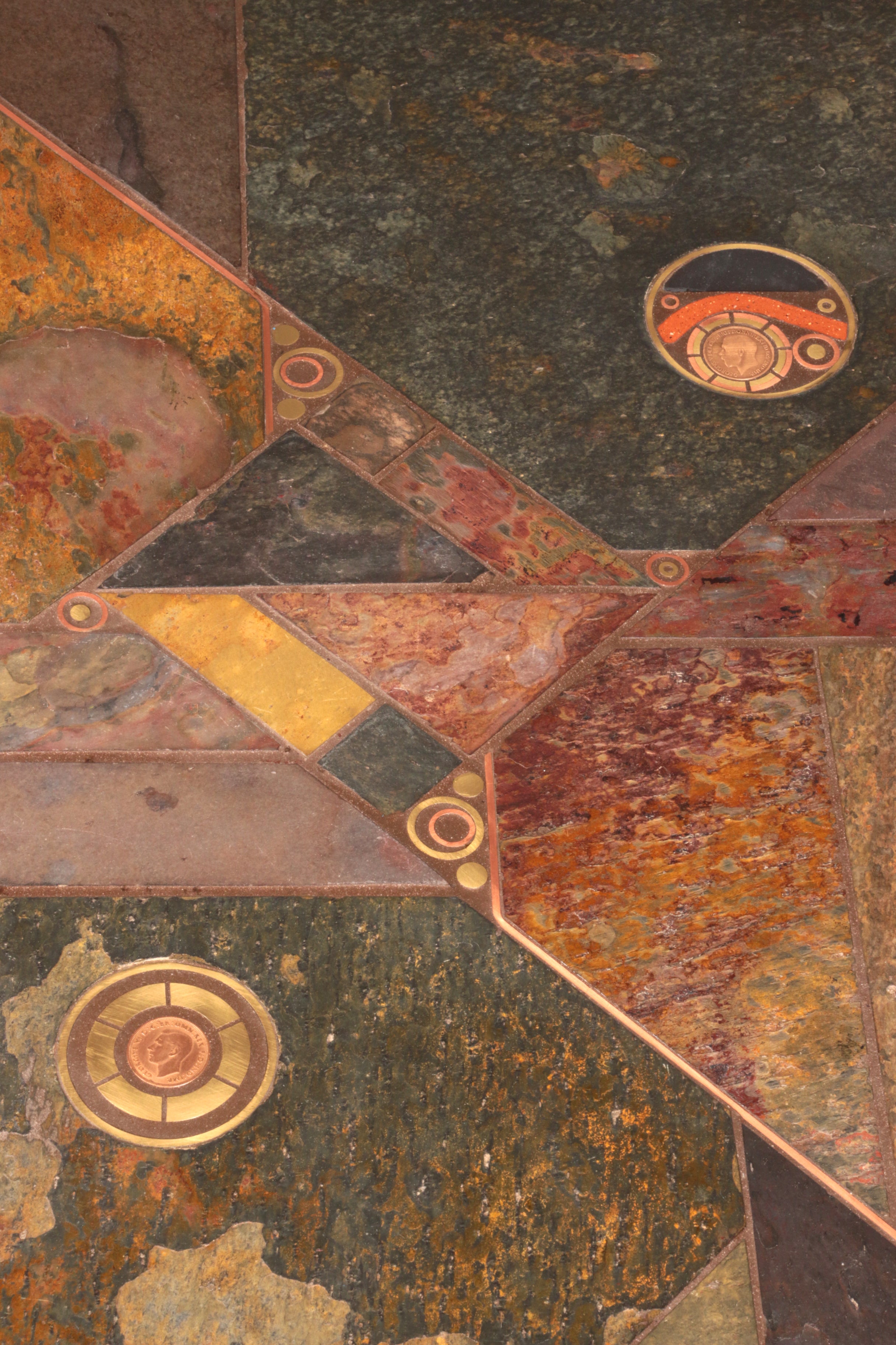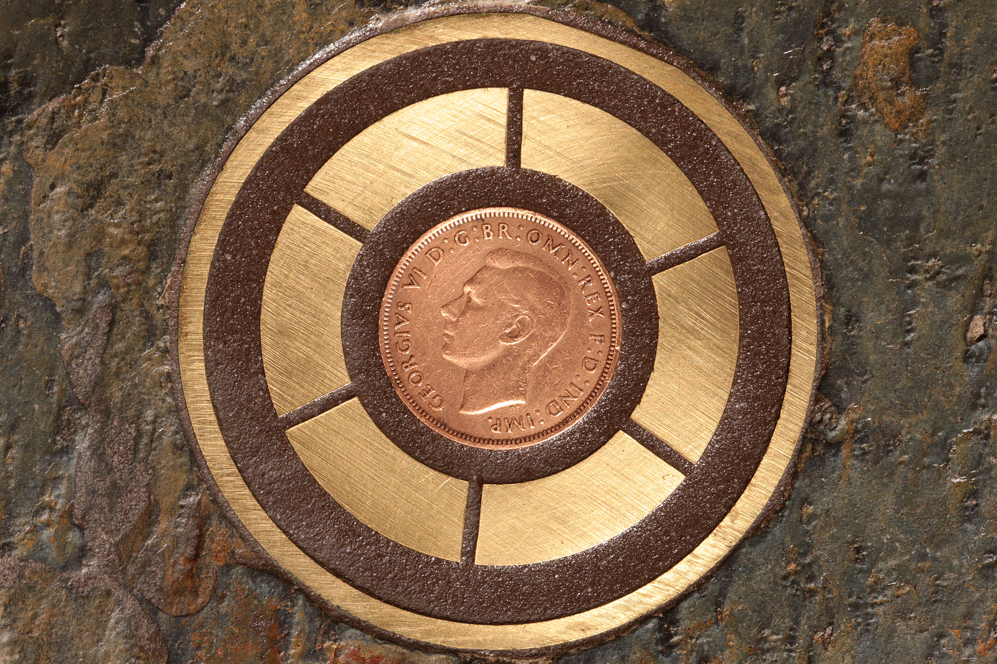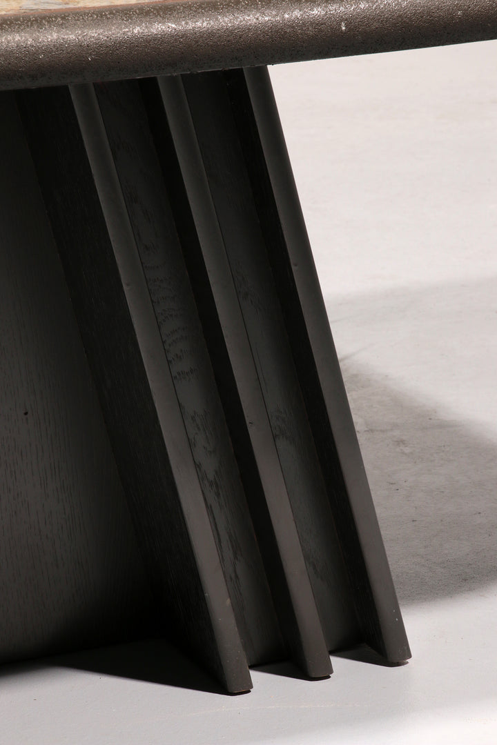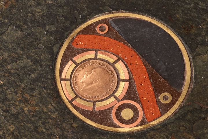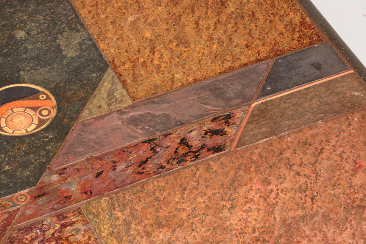 A beautifully crafted stone coffee table inspired by the style of Paul Kingma. The tabletop showcases a striking mosaic of natural stone, accented with brass and embedded coins that add character and uniqueness. The piece rests on a solid hexagonal stone base, offering both sculptural appeal and stability. In good vintage condition and an eye-catching addition to any modern eclectic interior.