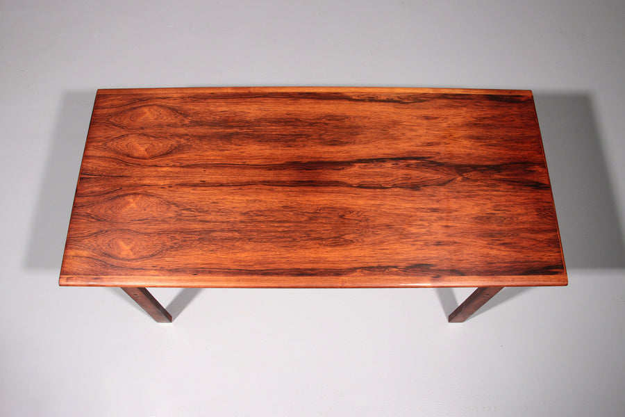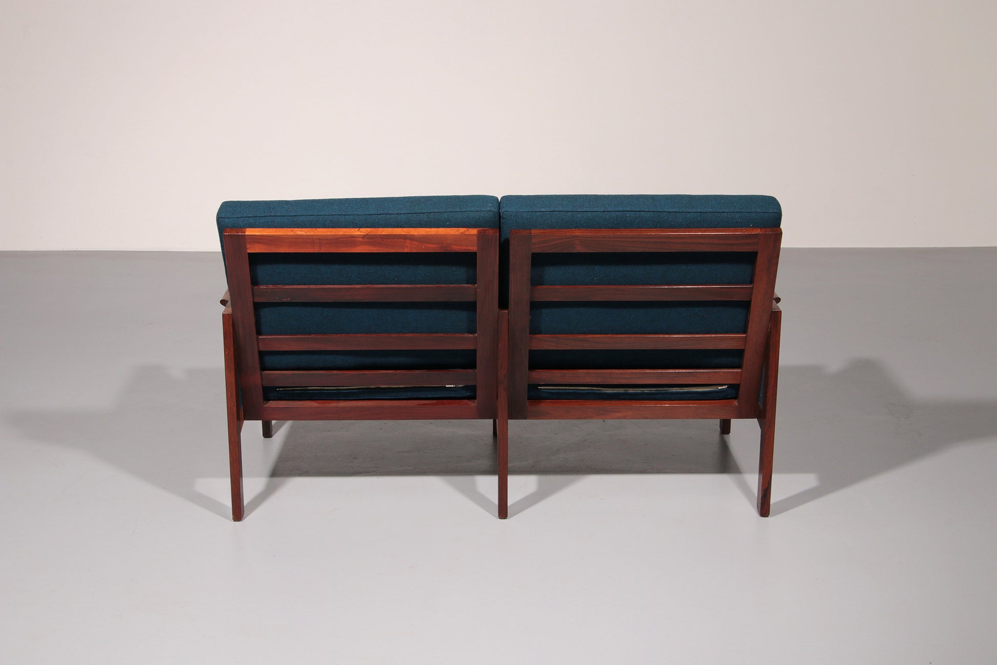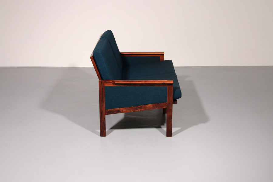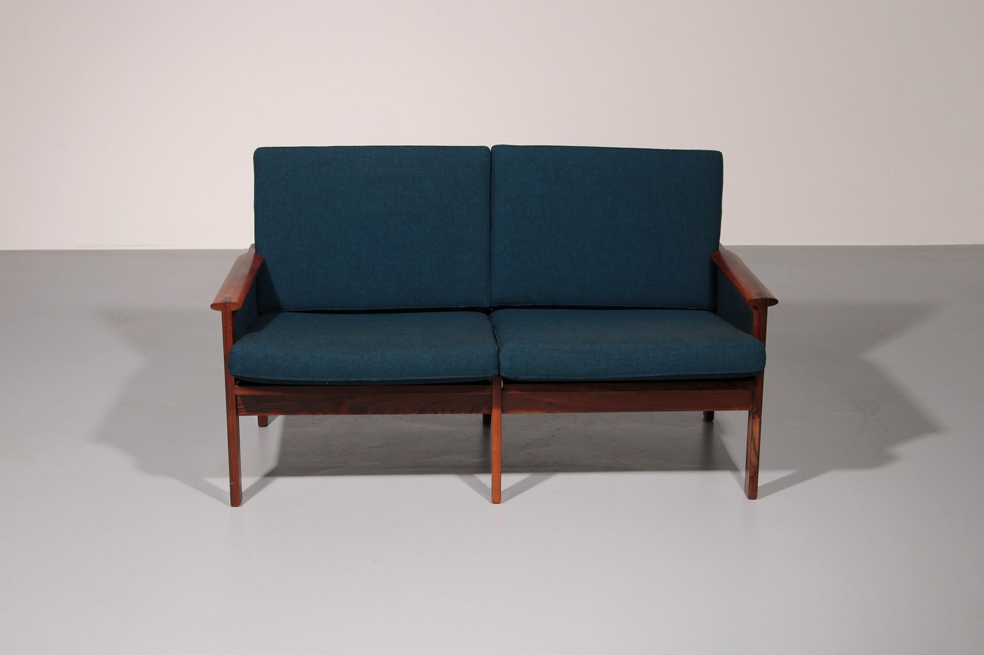 Step back into the golden age of Danish design with this classic rectangular coffee table from the Capella series, crafted by renowned designer Illum Wikkelsø in the 1960s for Niels Eilersen. Also the bench,with new cushes in bleu fabric. Made from high-quality dark wood, this low table boasts a warm brown hue and rich grain that exudes elegance and sophistication. Its sleek H-shaped legs and minimalist design emphasize purity of form and simplicity of lines, making it a versatile piece that complements various settings. Whether used as a coffee table or a stylish accent piece, its timeless design is sure to enhance any living space. Wikkelsø, a pivotal figure in Danish design, was celebrated for his innovative style and meticulous craftsmanship, which are evident in this exquisite table.