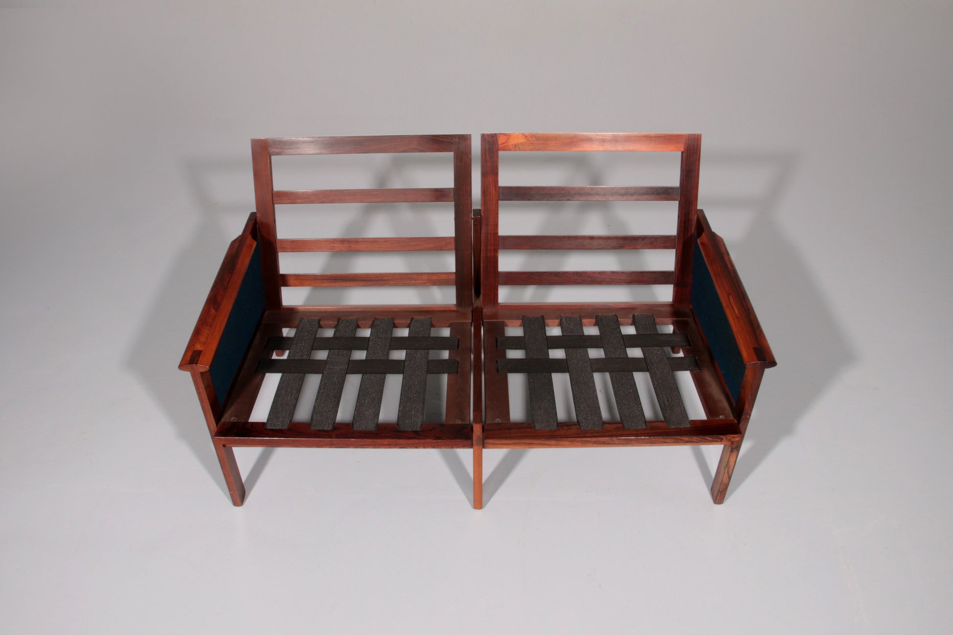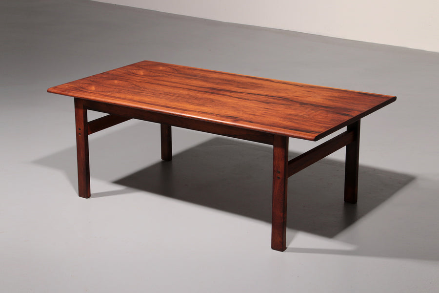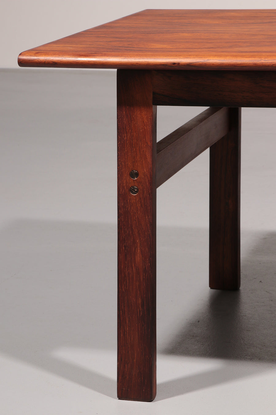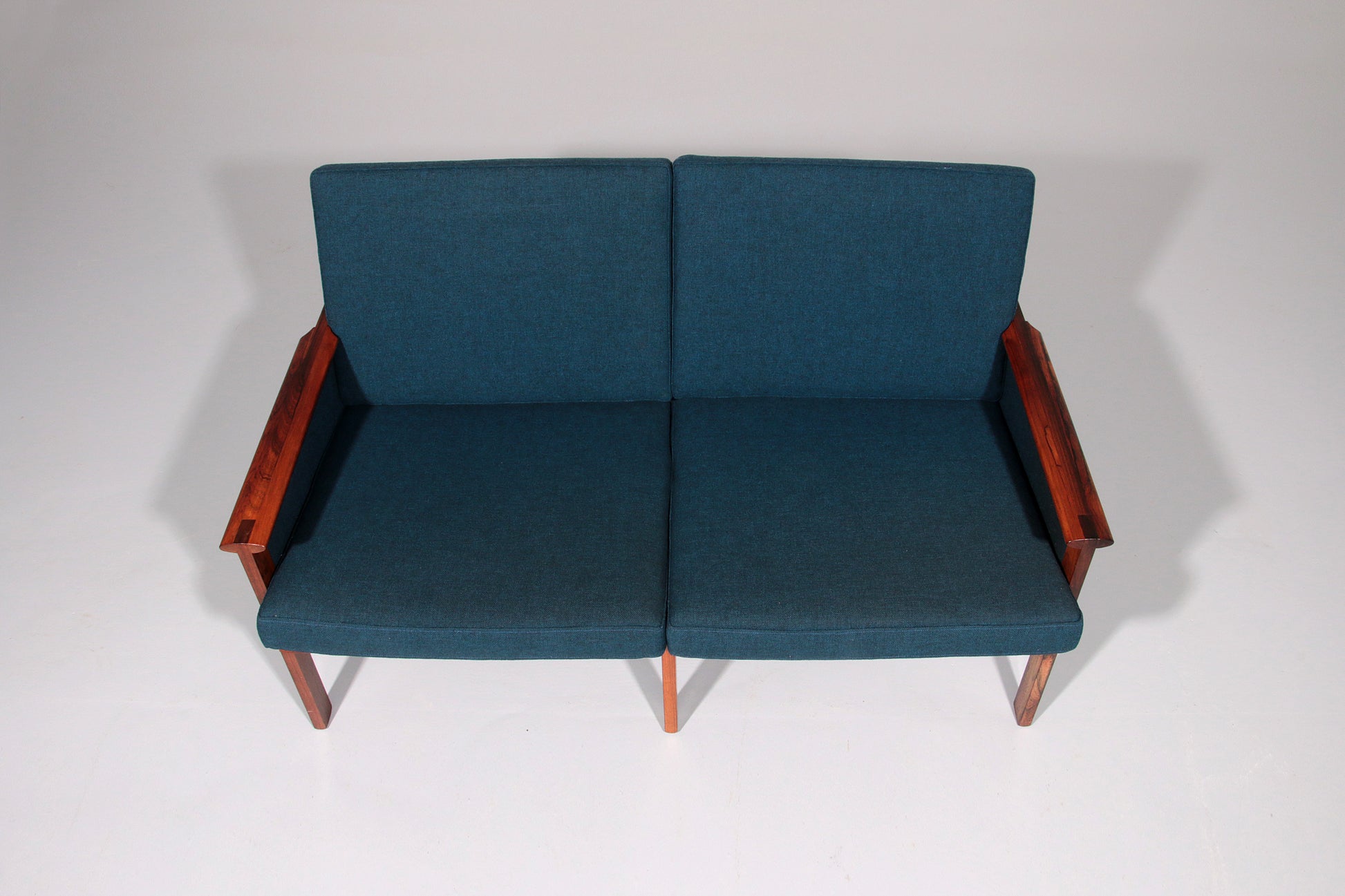 Step back into the golden age of Danish design with this classic rectangular coffee table from the Capella series, crafted by renowned designer Illum Wikkelsø in the 1960s for Niels Eilersen. Also the bench,with new cushes in bleu fabric. Made from high-quality dark wood, this low table boasts a warm brown hue and rich grain that exudes elegance and sophistication. Its sleek H-shaped legs and minimalist design emphasize purity of form and simplicity of lines, making it a versatile piece that complements various settings. Whether used as a coffee table or a stylish accent piece, its timeless design is sure to enhance any living space. Wikkelsø, a pivotal figure in Danish design, was celebrated for his innovative style and meticulous craftsmanship, which are evident in this exquisite table.