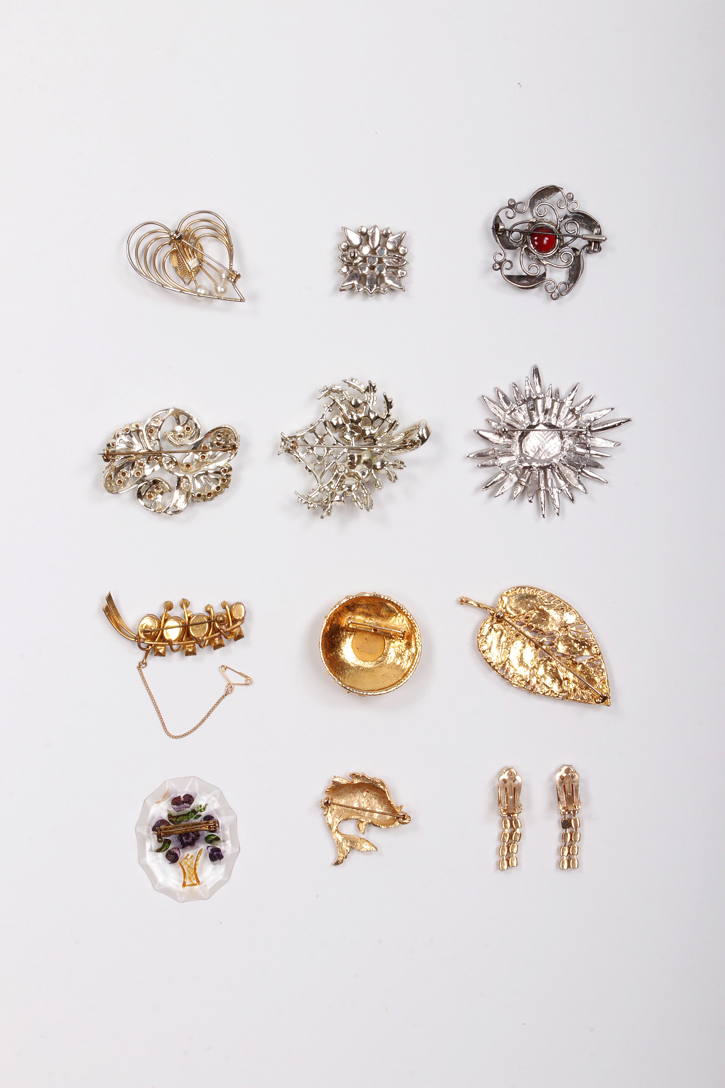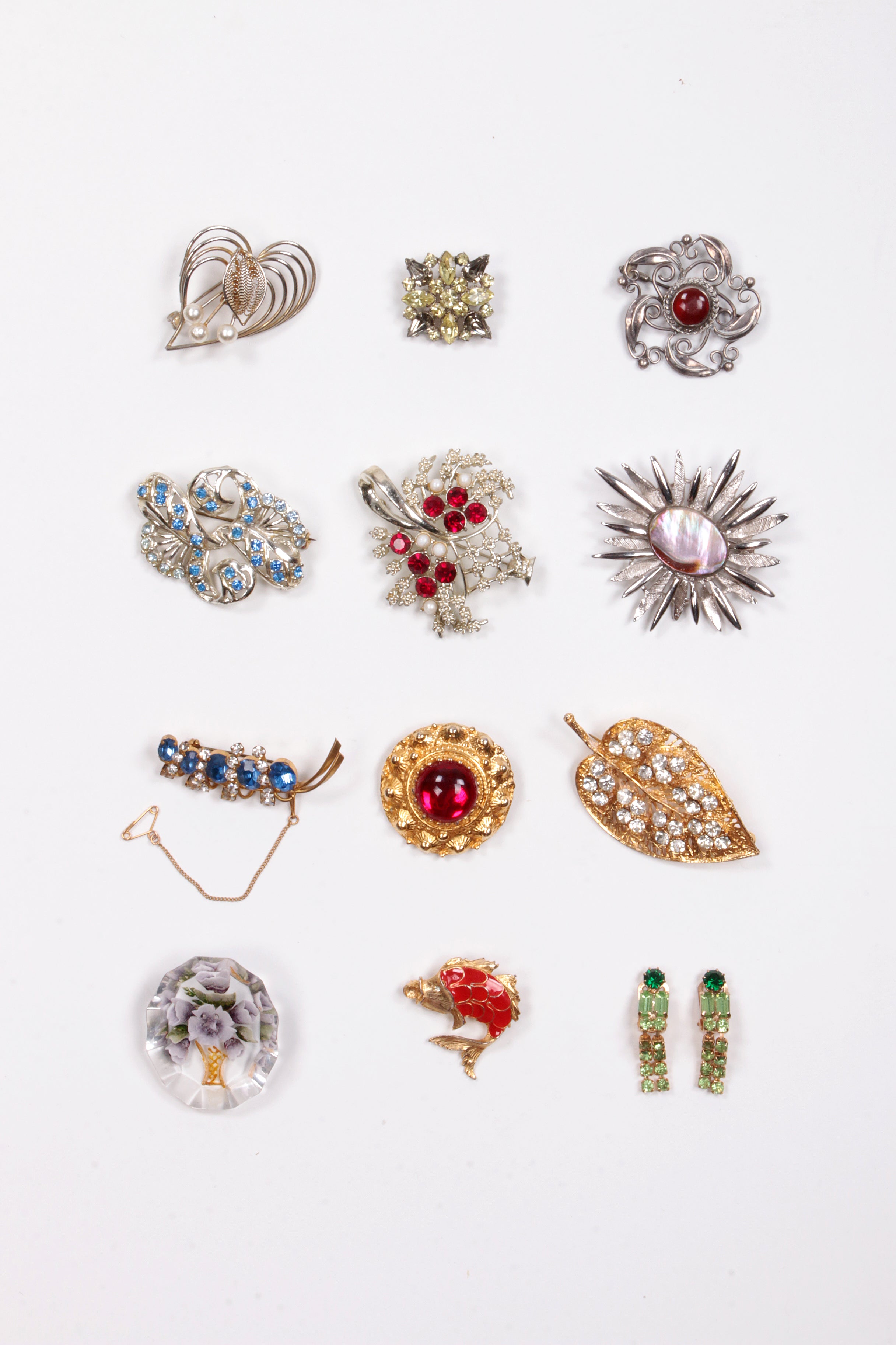 This collection of vintage brooches from the 1960s showcases a range of unique designs, each piece blending colorful stones with elegant gold and silver tones. The collection represents a variety of styles that were popular during that time, with some brooches shaped like animals, while others feature floral motifs. Each brooch is a small wearable work of art, capturing the craftsmanship and aesthetic of the era. These vintage pieces offer a timeless touch of elegance and charm, perfect for collectors or anyone looking to add a statement accessory to their wardrobe.