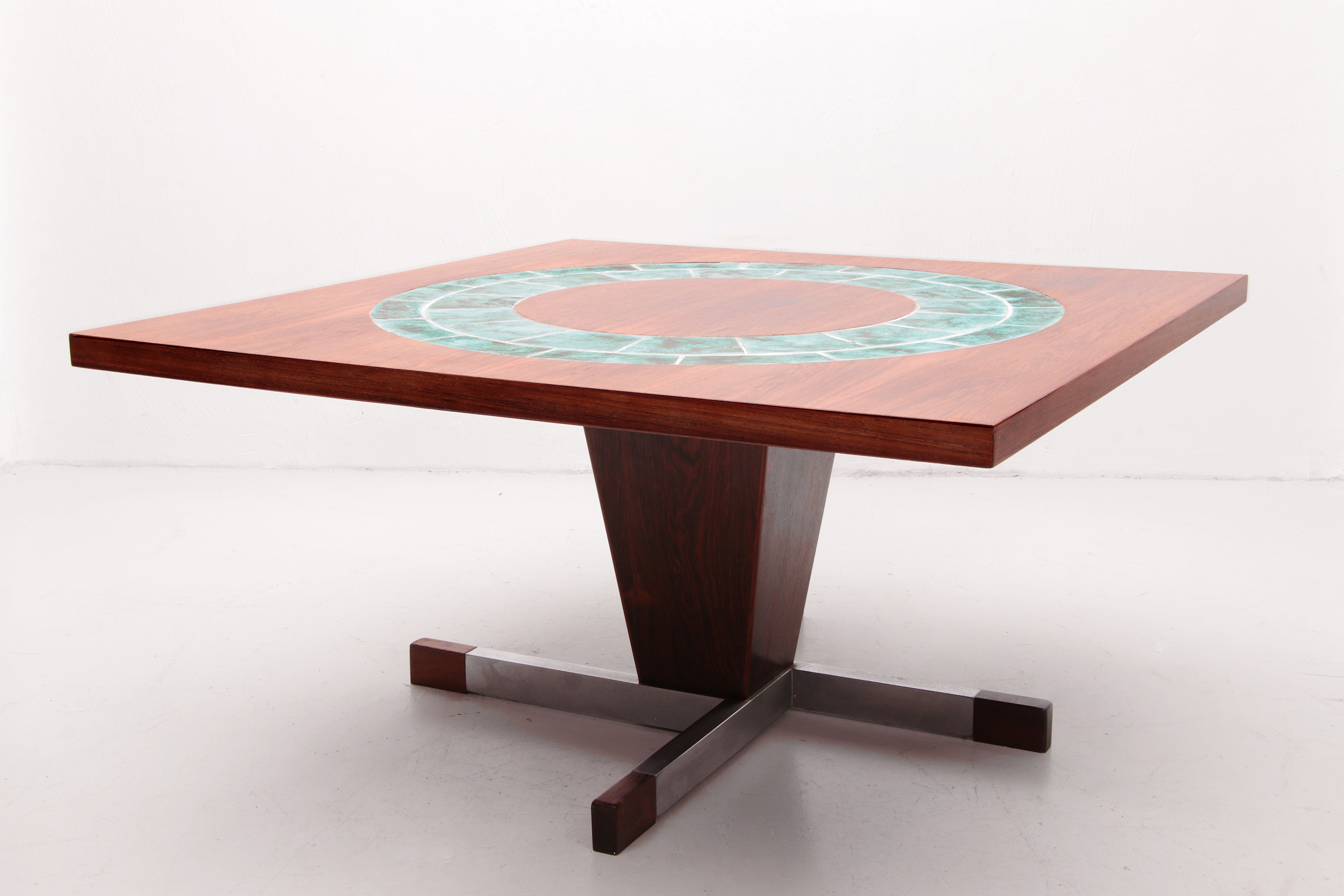 Discover the charm of the 1960s with this exquisite Danish design coffee table, featuring a stunning combination of ceramic tiles and dark wood. This square coffee table is not just a piece of furniture; it's a statement of style and sustainability. The unique wooden and chrome base adds a touch of elegance, making it a perfect centerpiece for any living room. Sourced from Denmark, this vintage piece is a testament to quality craftsmanship and timeless design. By choosing vintage, you embrace a sustainable lifestyle, as no new materials are required for this product. Each table tells its own story, with visible signs of its past life, adding character and a sense of history to your home.