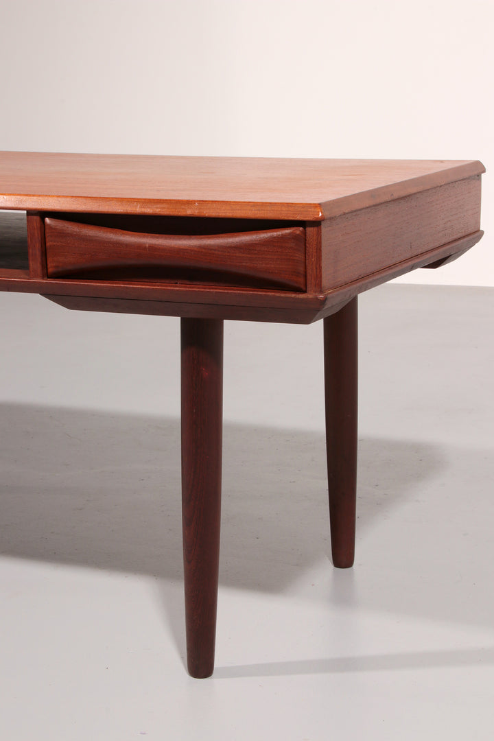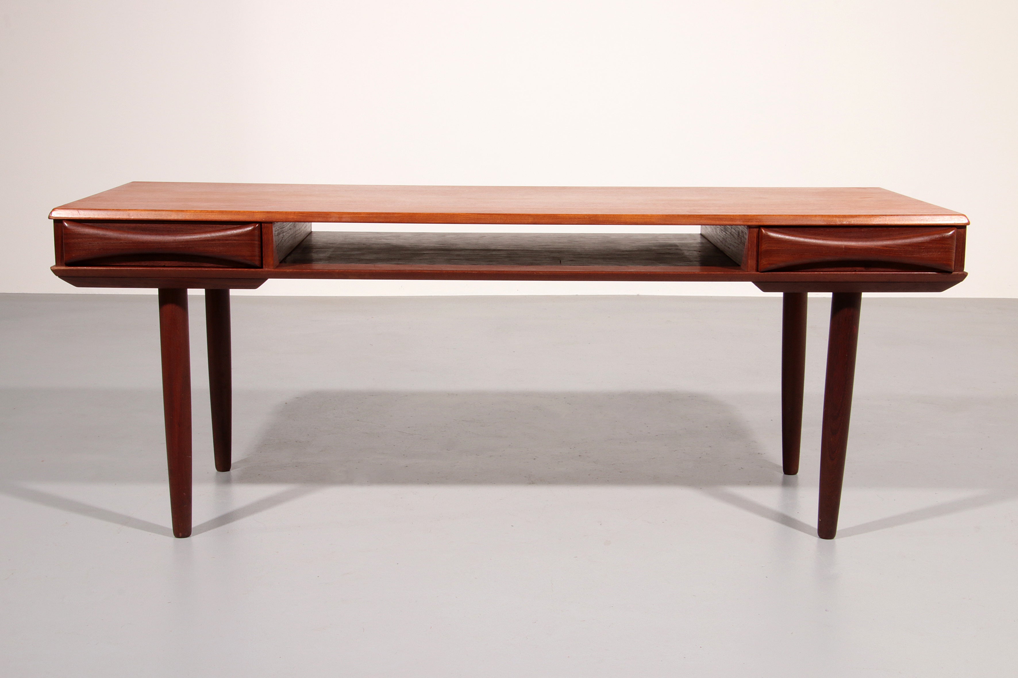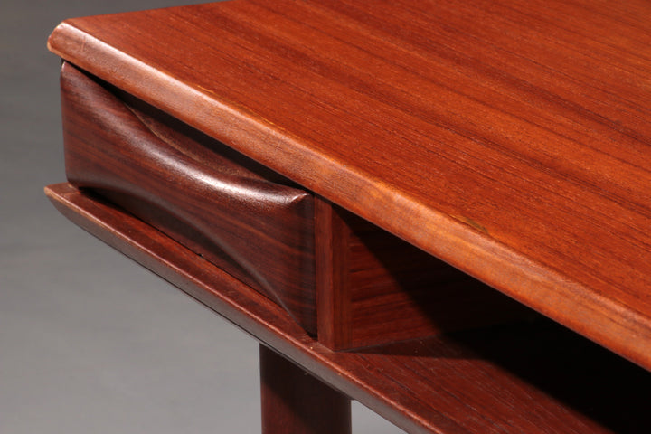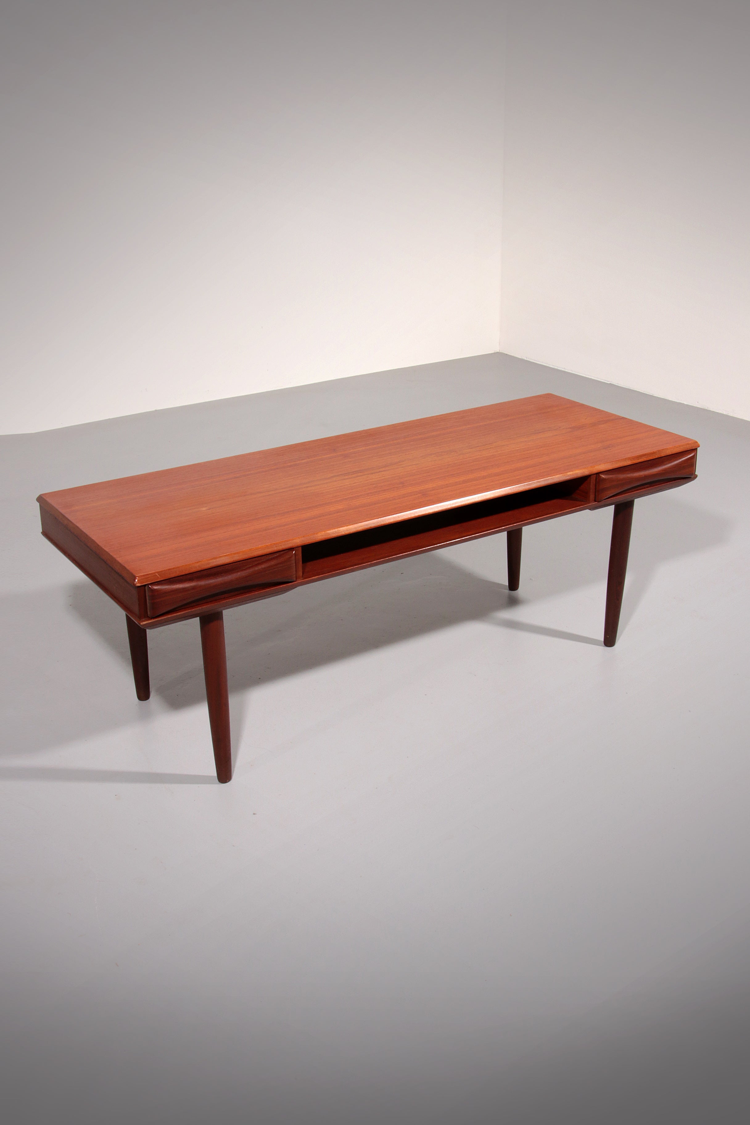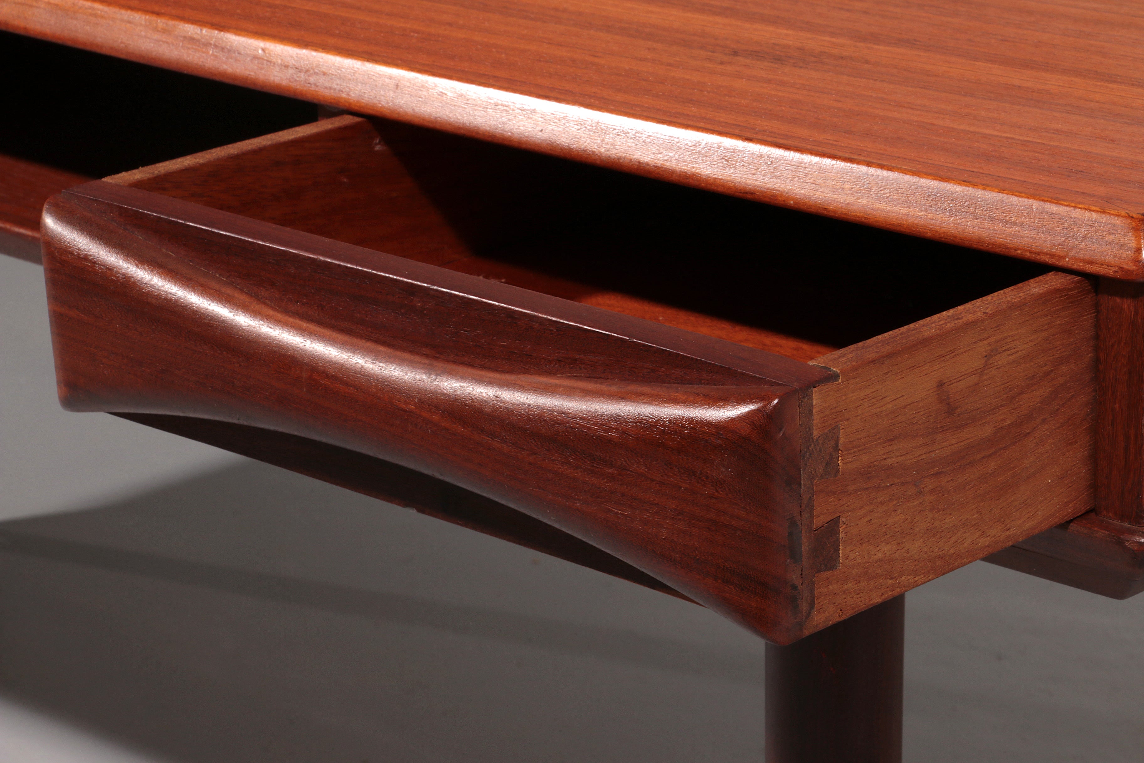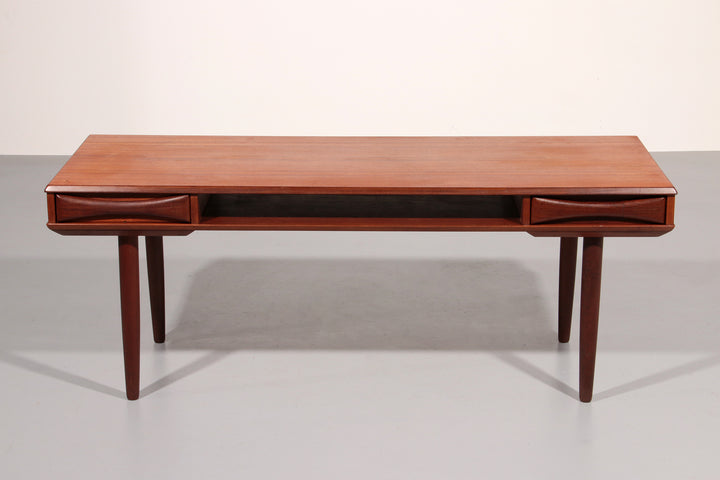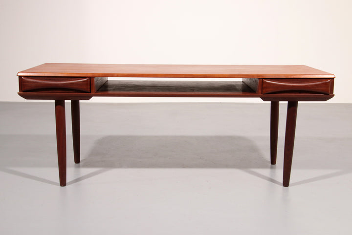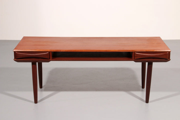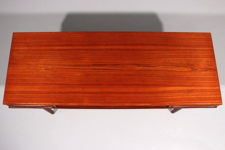 Step into the world of mid-century elegance with the Danish Modernist Teak Coffee Table by Dyrlund, a masterpiece from the 1960s. Crafted from premium teak wood, this table embodies the timeless beauty and functionality of Scandinavian design. Featuring butterfly joints and dual pass-through drawers, it offers both style and practicality. The drawers, adorned with handles inspired by the iconic Arne Vodder, can be accessed from either side, making it a versatile addition to any living space. This table is not just a piece of furniture; it's a statement of refined taste and a nod to the golden era of design.