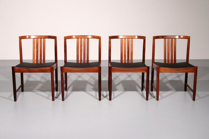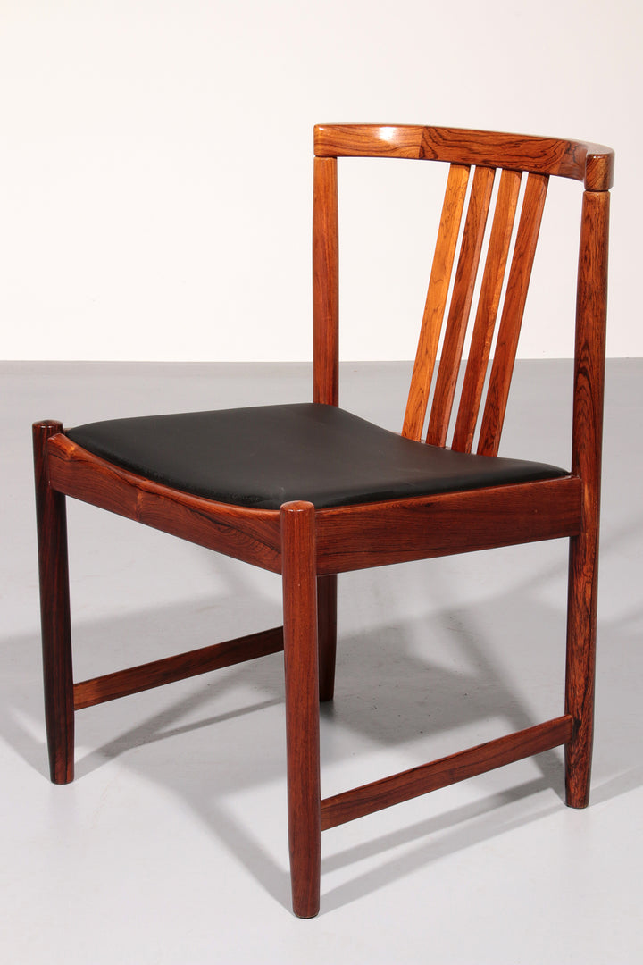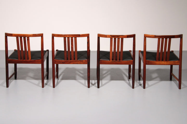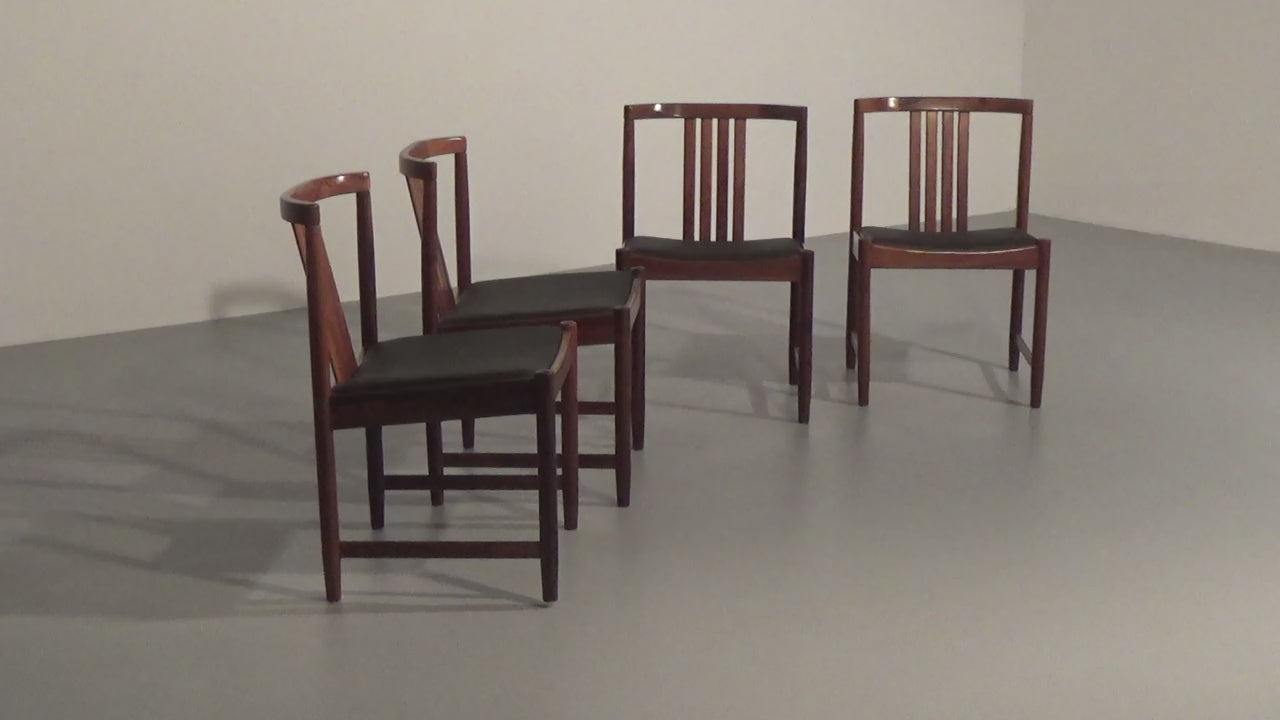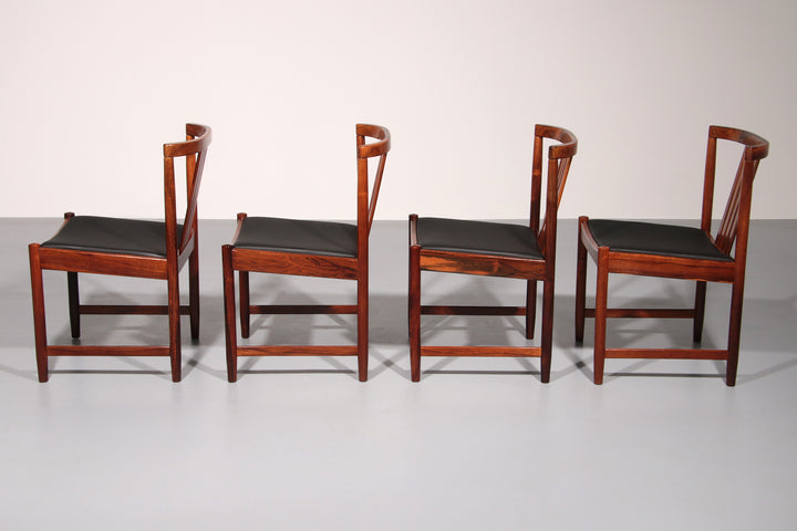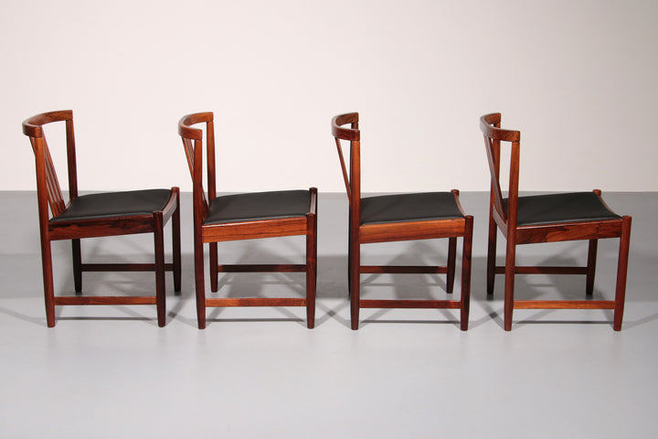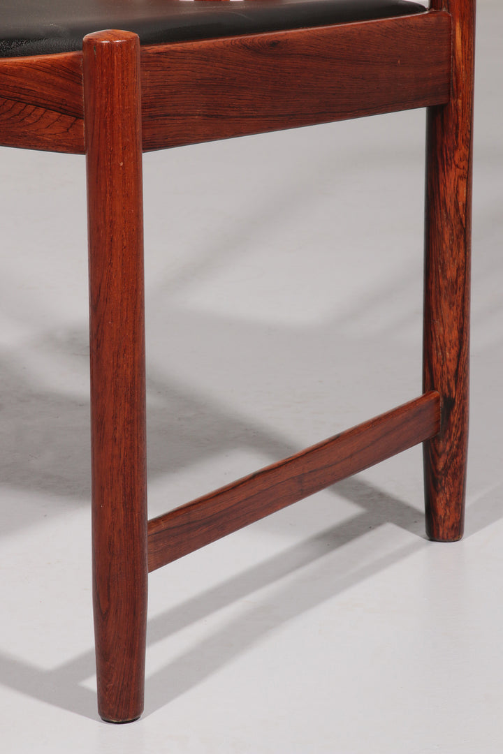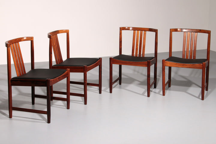 Discover the timeless elegance of these rare, dark wood dining chairs designed by Illum Wikkelsø in the 1960s, Denmark. This beautiful set of four chairs embodies the modern Scandinavian style with a touch of art deco flair. The black faux leather seats are of excellent new quality, offering both comfort and style. By choosing these vintage pieces, you are not only enhancing your interior but also making an environmentally conscious choice. No new resources are needed for these chairs, making them a sustainable addition to your home. Each chair tells a story, with unique marks that provide a glimpse into their rich history and the lives of their previous owners.