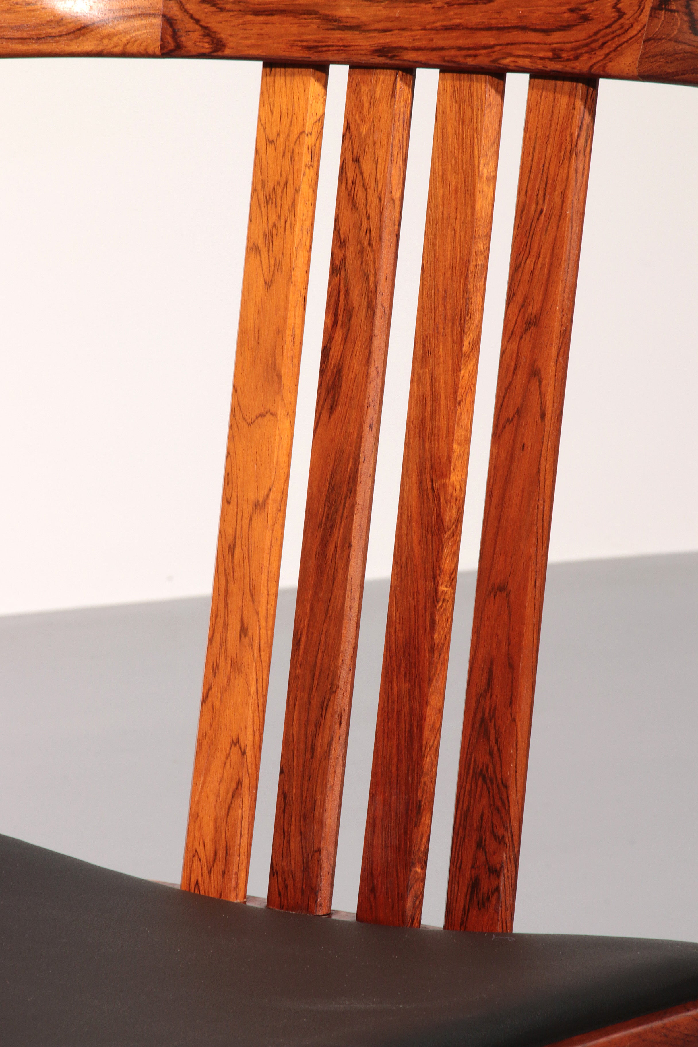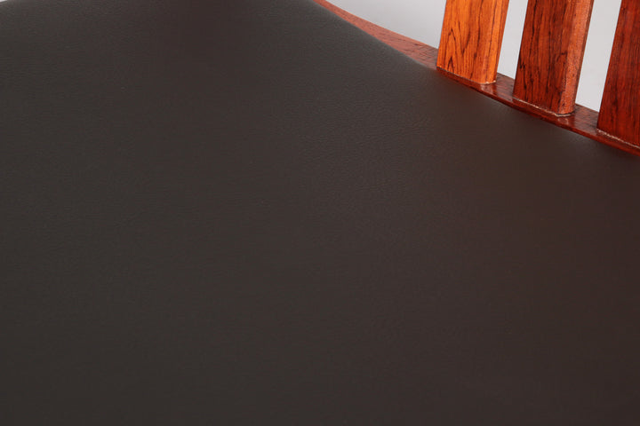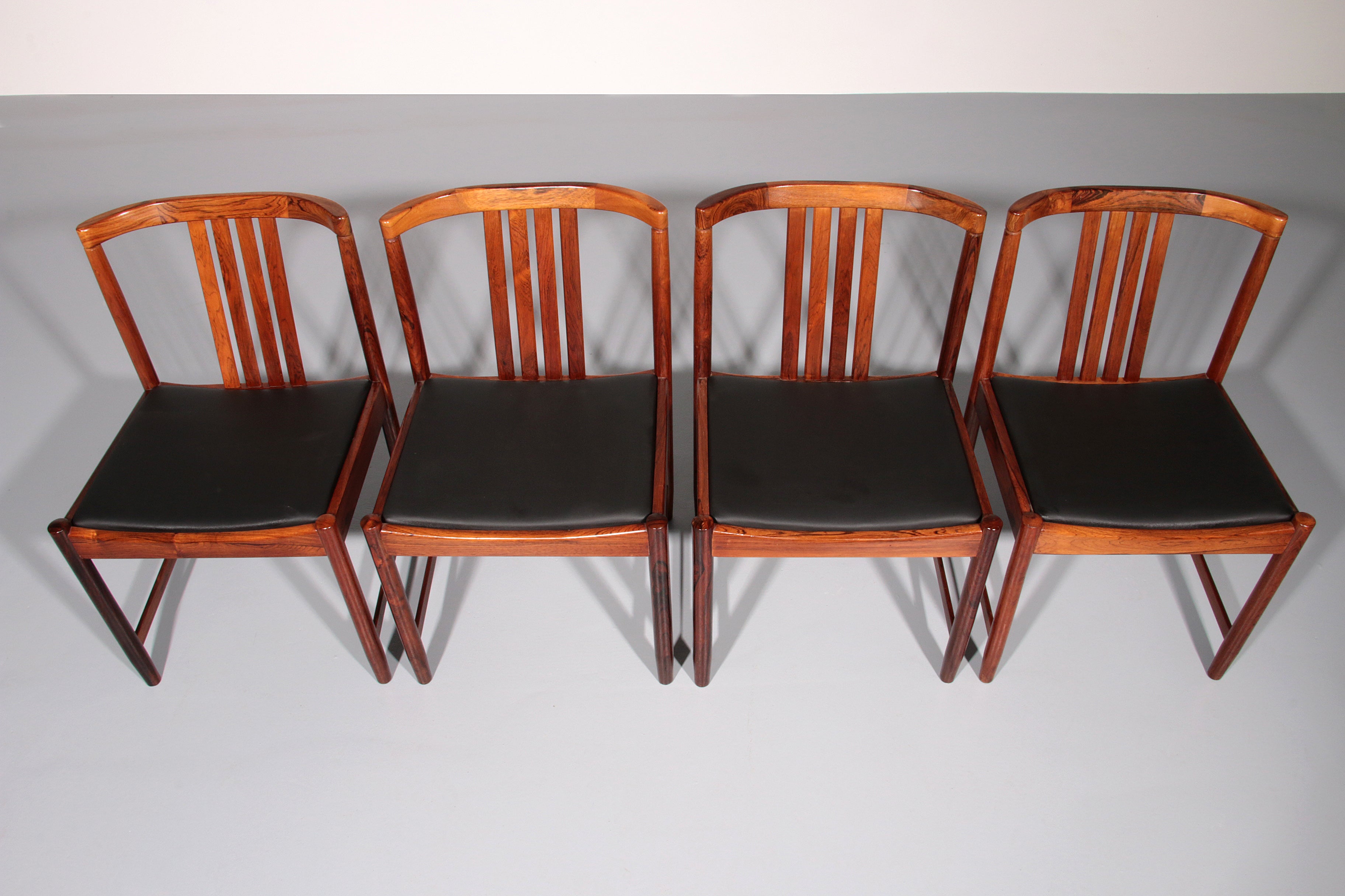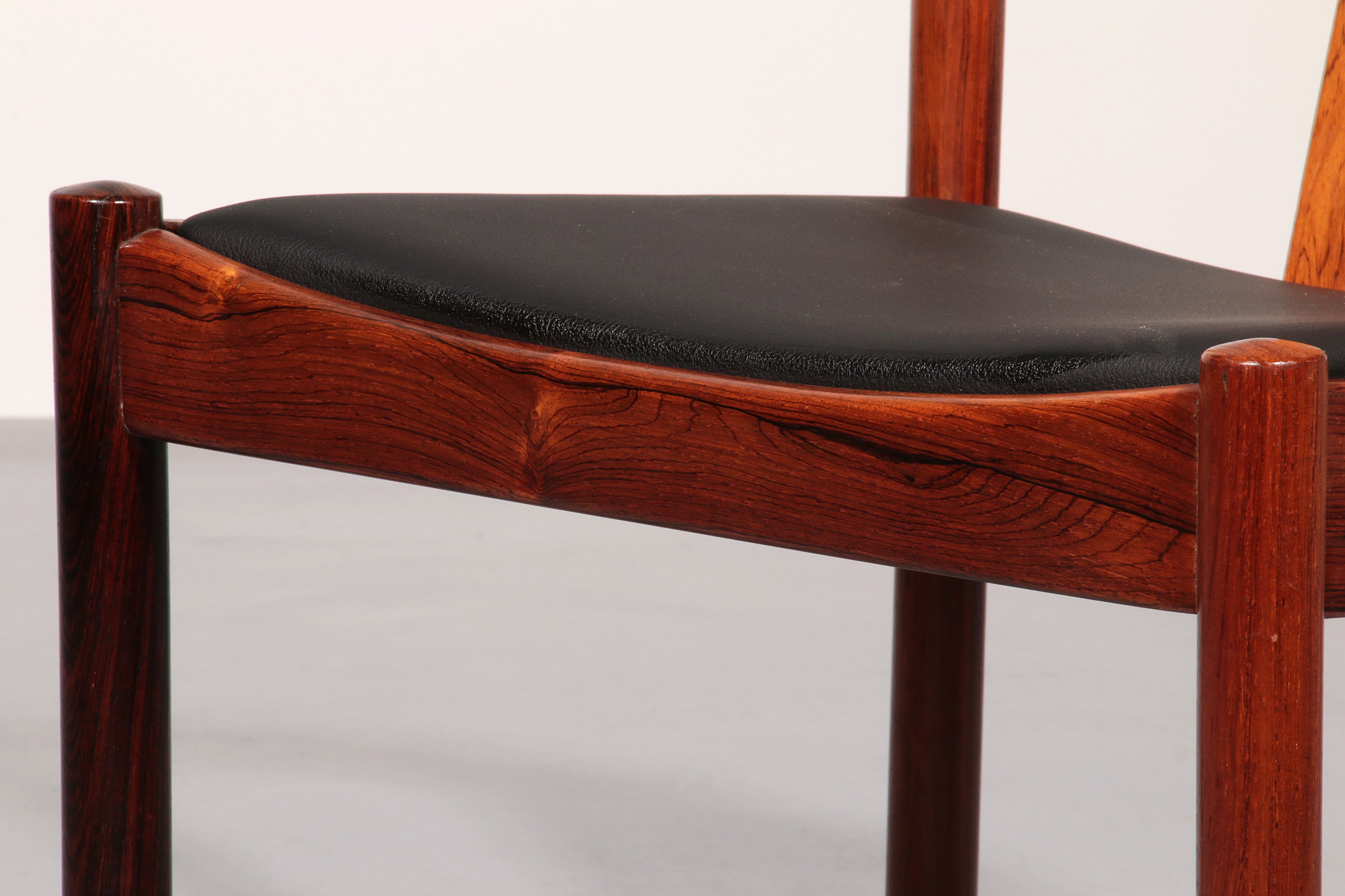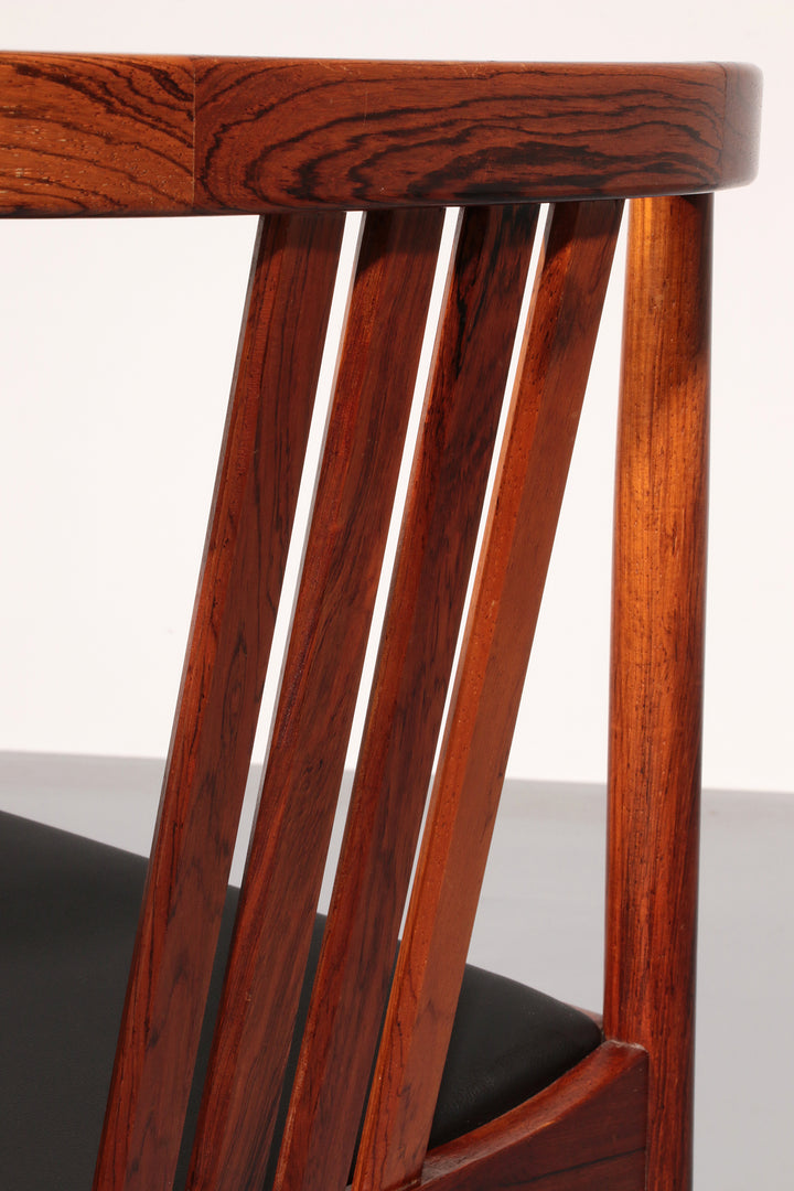 Discover the timeless elegance of these rare, dark wood dining chairs designed by Illum Wikkelsø in the 1960s, Denmark. This beautiful set of four chairs embodies the modern Scandinavian style with a touch of art deco flair. The black faux leather seats are of excellent new quality, offering both comfort and style. By choosing these vintage pieces, you are not only enhancing your interior but also making an environmentally conscious choice. No new resources are needed for these chairs, making them a sustainable addition to your home. Each chair tells a story, with unique marks that provide a glimpse into their rich history and the lives of their previous owners.