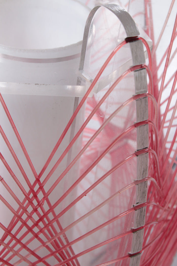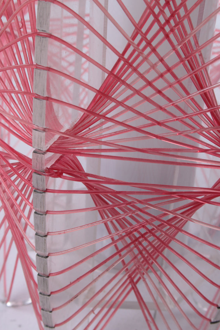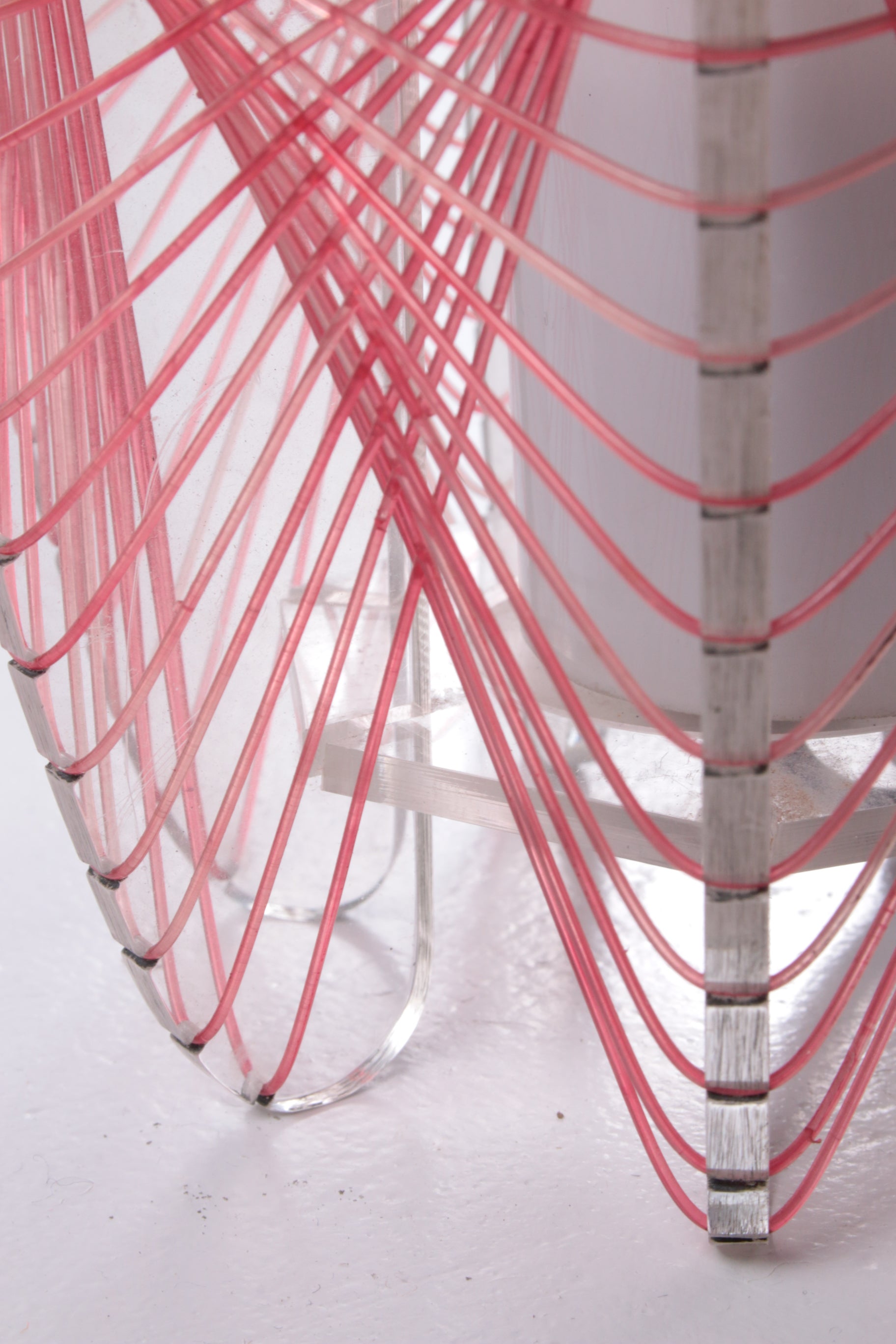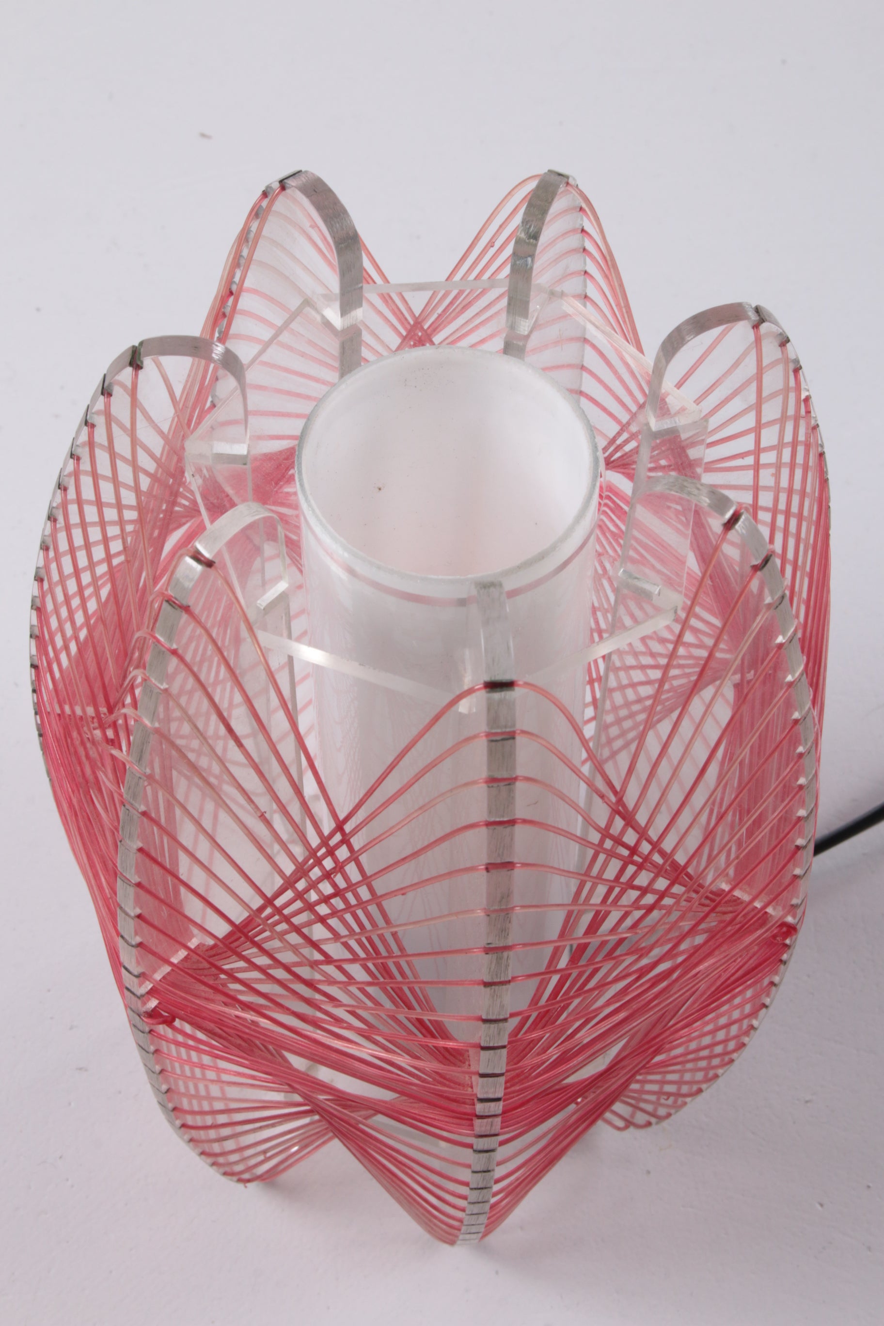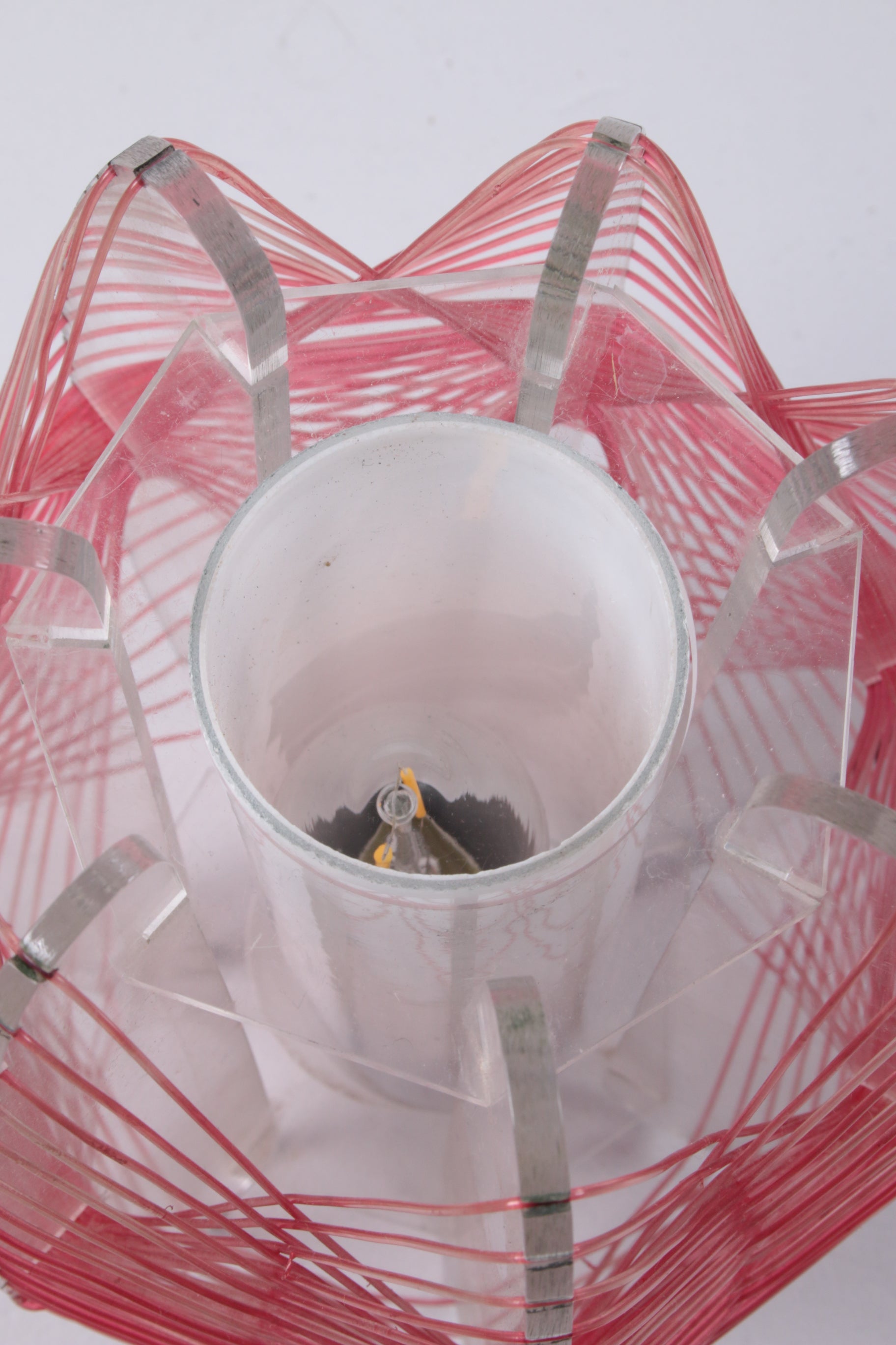 This charming vintage table lamp, crafted from plastic wire known as "spinnerag," is a delightful piece from the 1960s. Likely produced in Czechoslovakia, this lamp features a unique, textured design that casts a soft, ambient glow, making it perfect for creating a cozy atmosphere. The intricate spinning pattern of the plastic wire gives the lamp a distinctive look, reminiscent of the playful yet elegant lighting styles of the Mid-Century era.