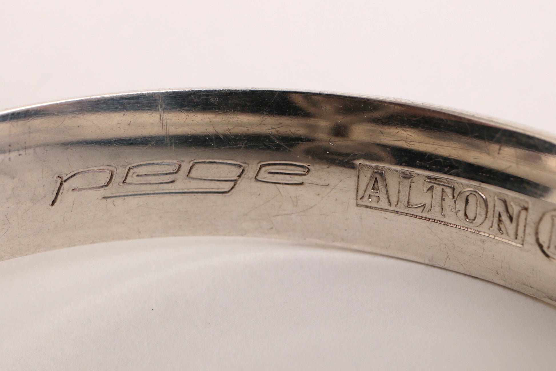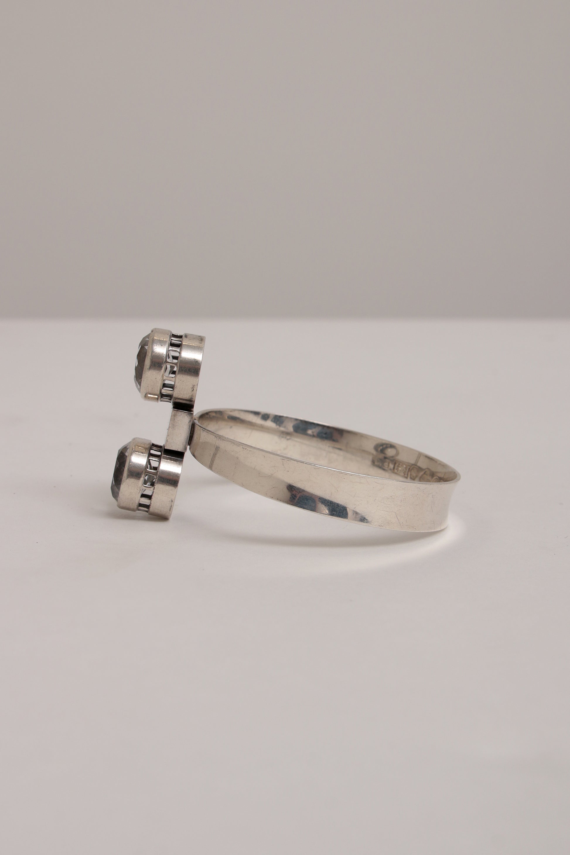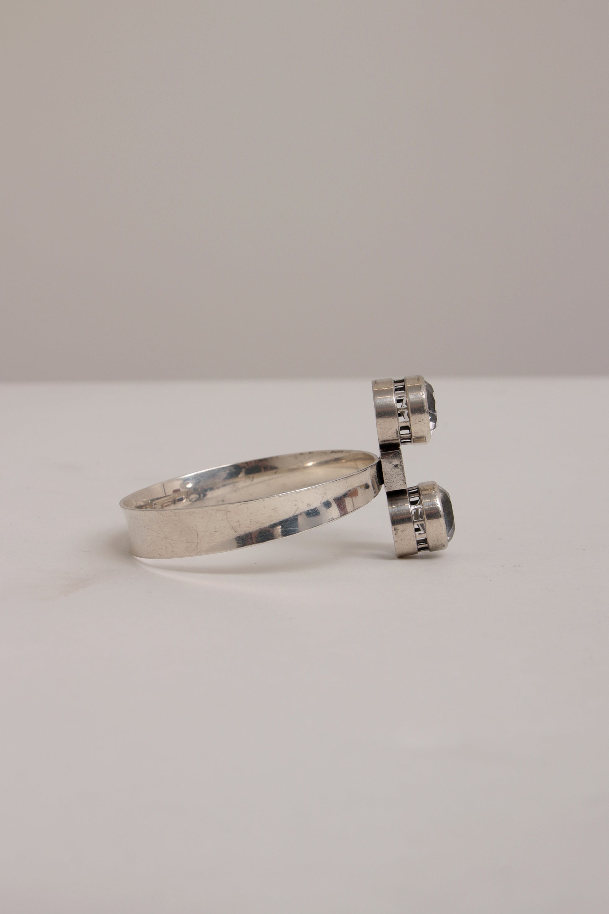 This 1967 Alton sterling silver bracelet showcases two beautifully faceted rock crystals set in a textured silver frame. Designed to allow light to play through the stones, it combines the elegance of Swedish design with exceptional craftsmanship. The bracelet’s compact size and refined aesthetic make it a versatile and collectible piece.